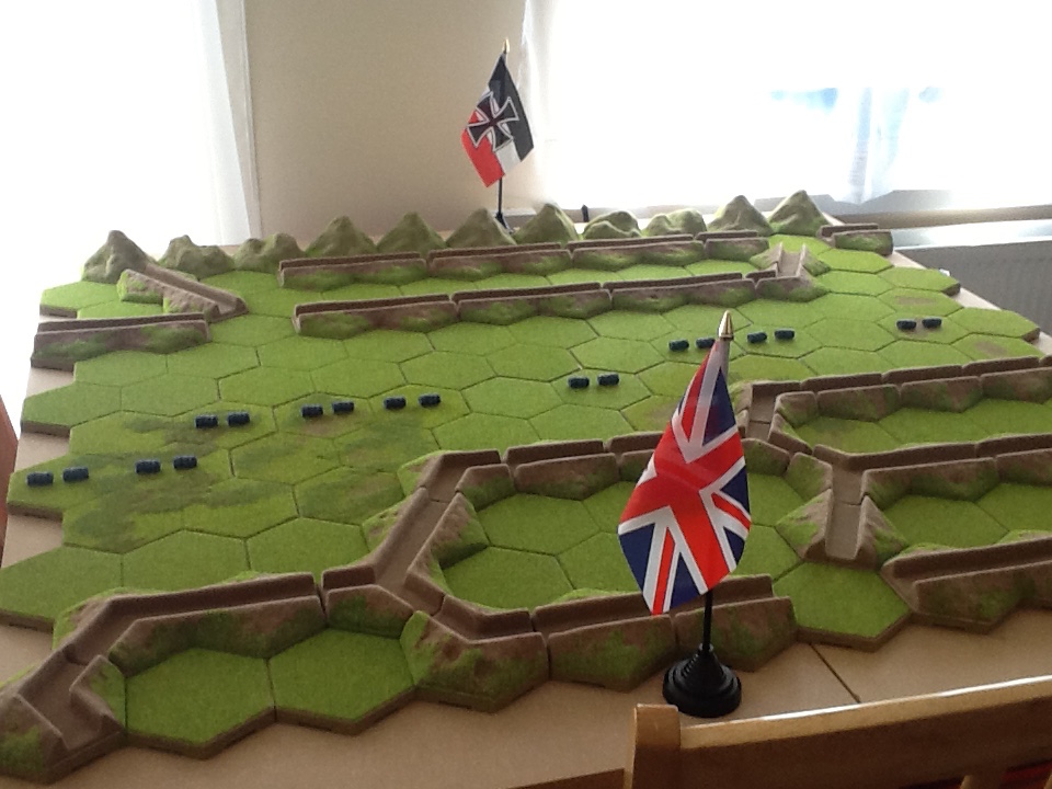 OK the board is 12 hexes by 11 hexes deep. Firstly on the positive side, this means if you set this up using kallistra it fits very nicely on a four feet square table. However in terms of kallistra boards and single hexes is a little more tricky than setting up Memoir 44.