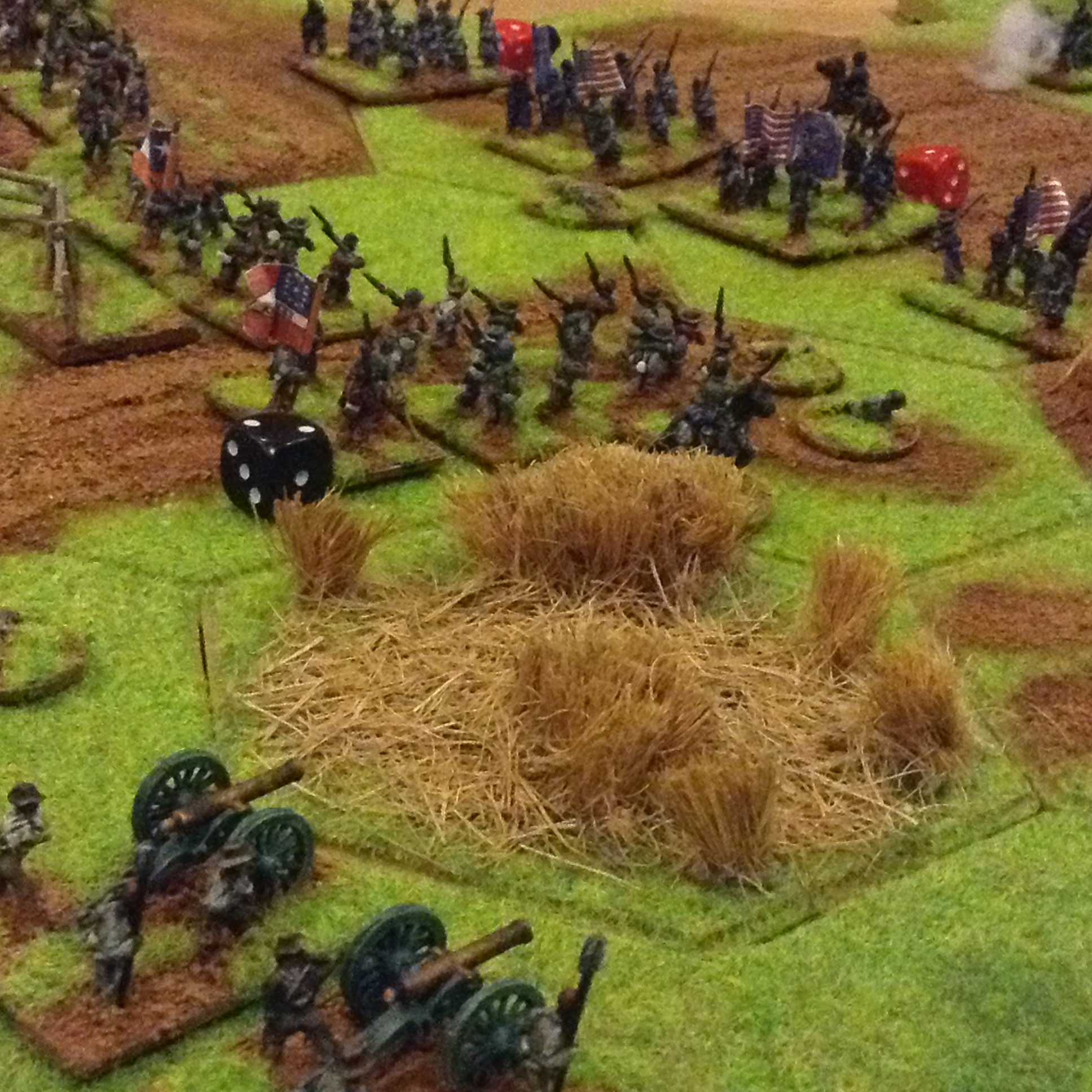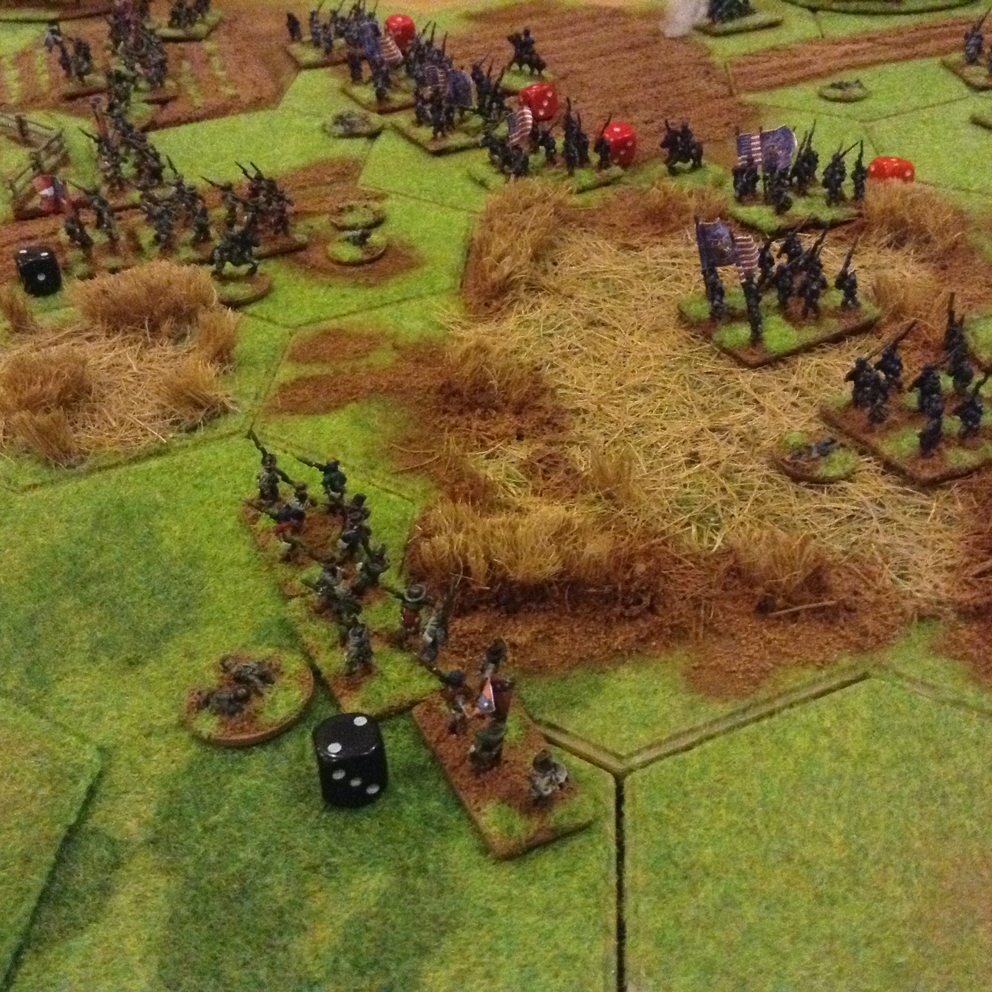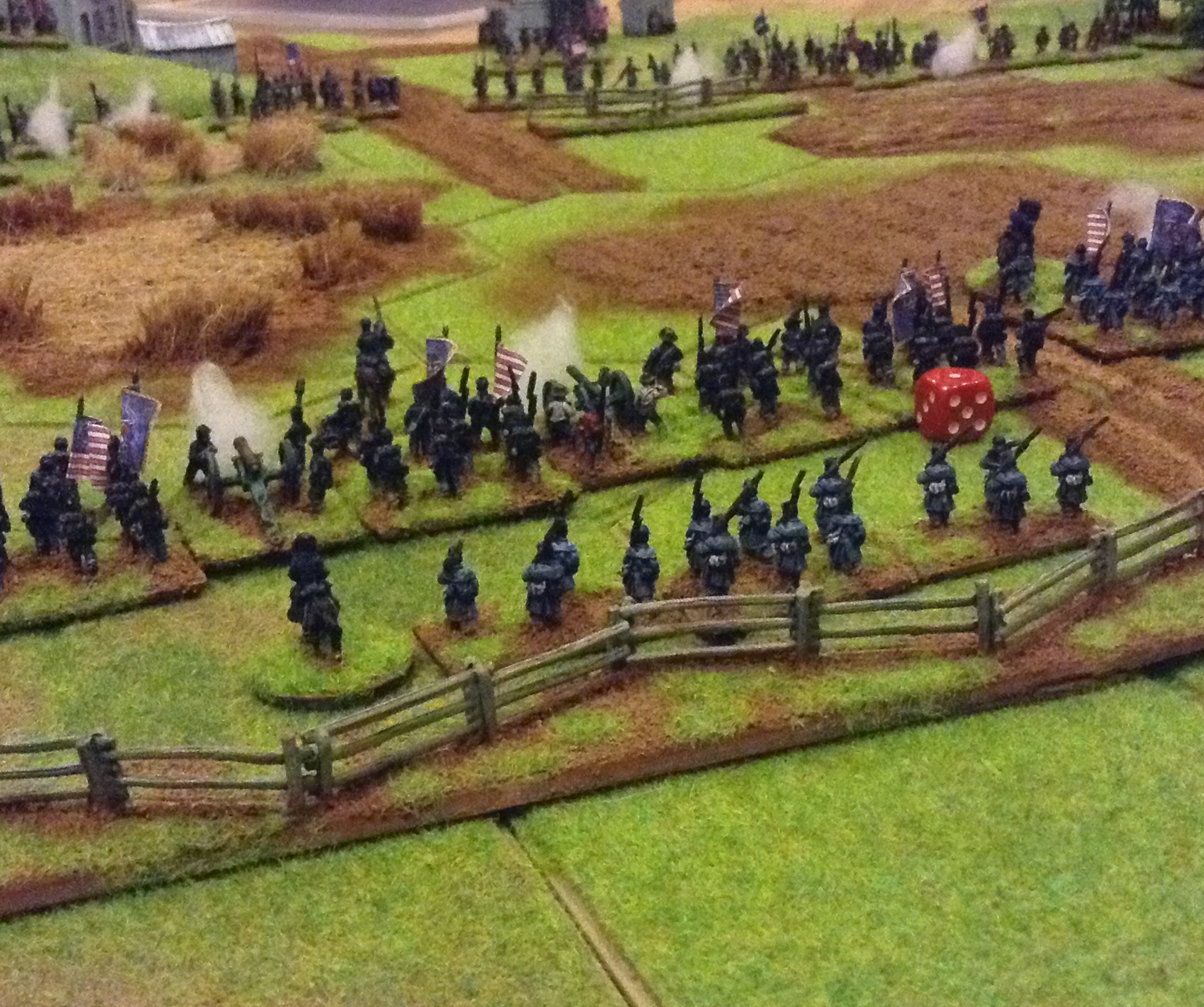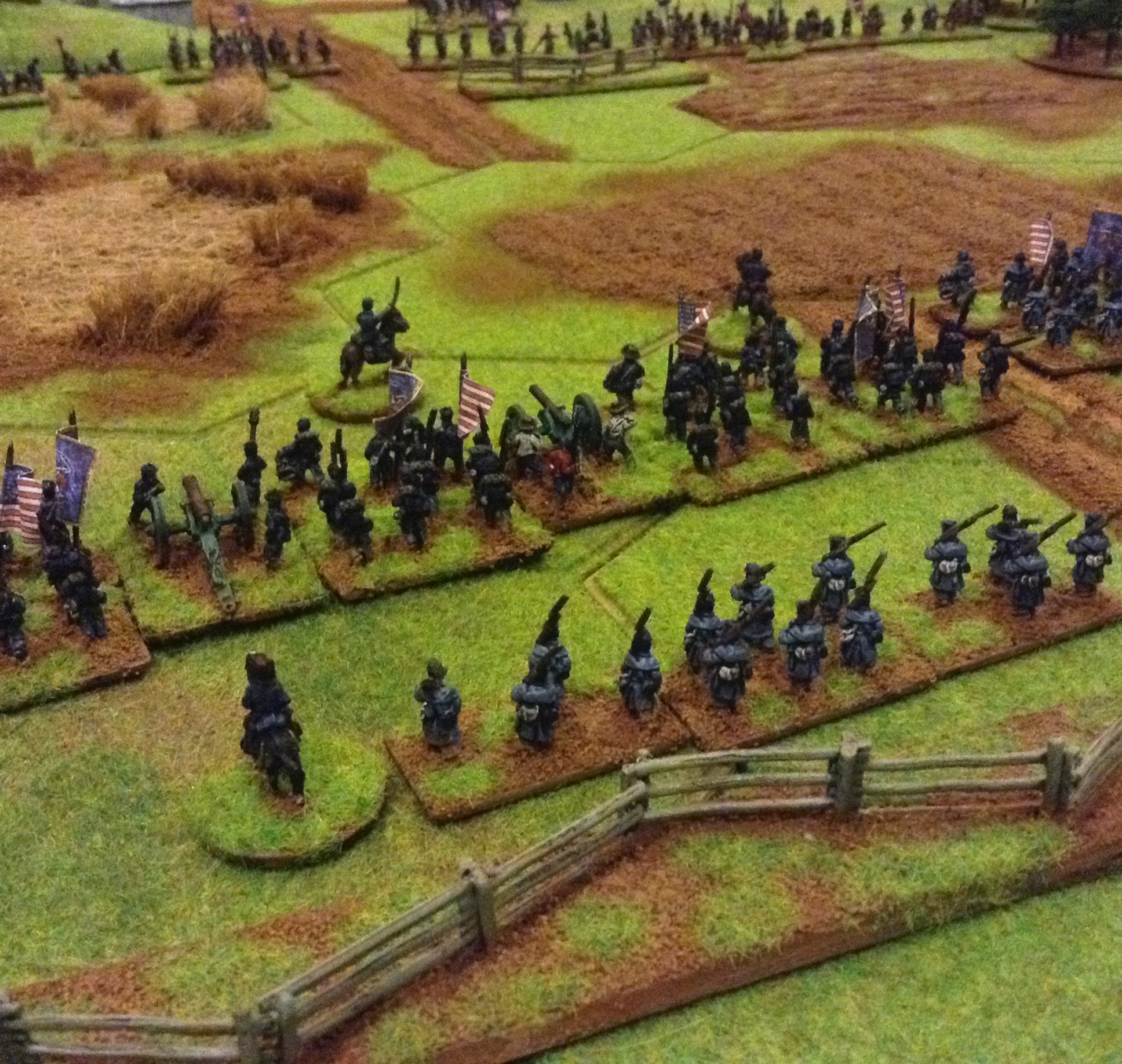 Selection of photos of a second game for the Yankies and Rebs to fight it out, now all based and flocked with command figures. Ended with a fair draw with heavy losses on both sides, the foremost brigades suffering withering fire with exchanges of volleys at close ranges with casualties of 60%. The Union guns suffered poor dice roles which gave the Rebs a better result overall. Burnside.