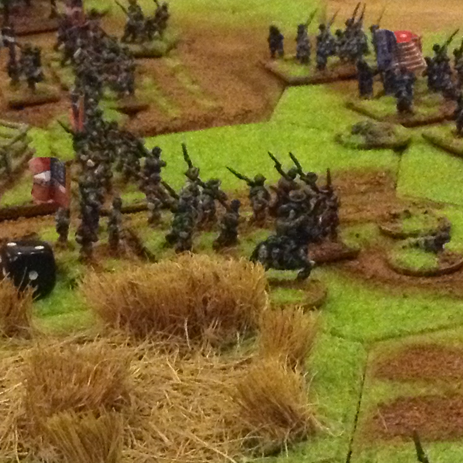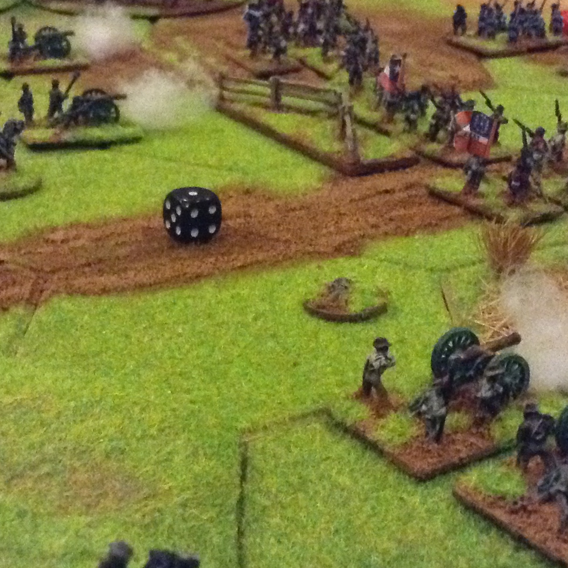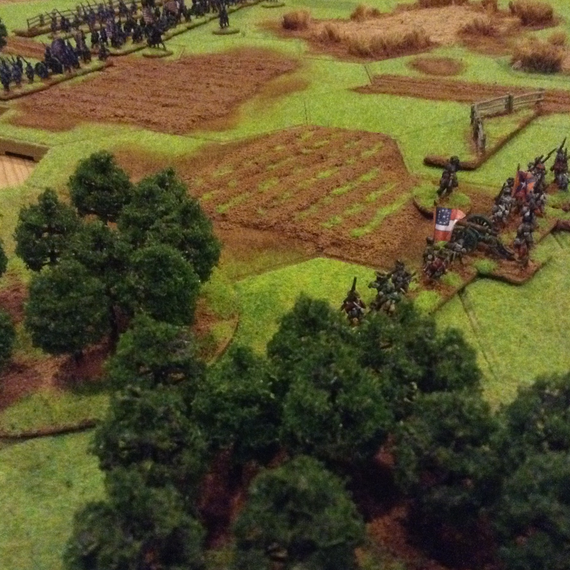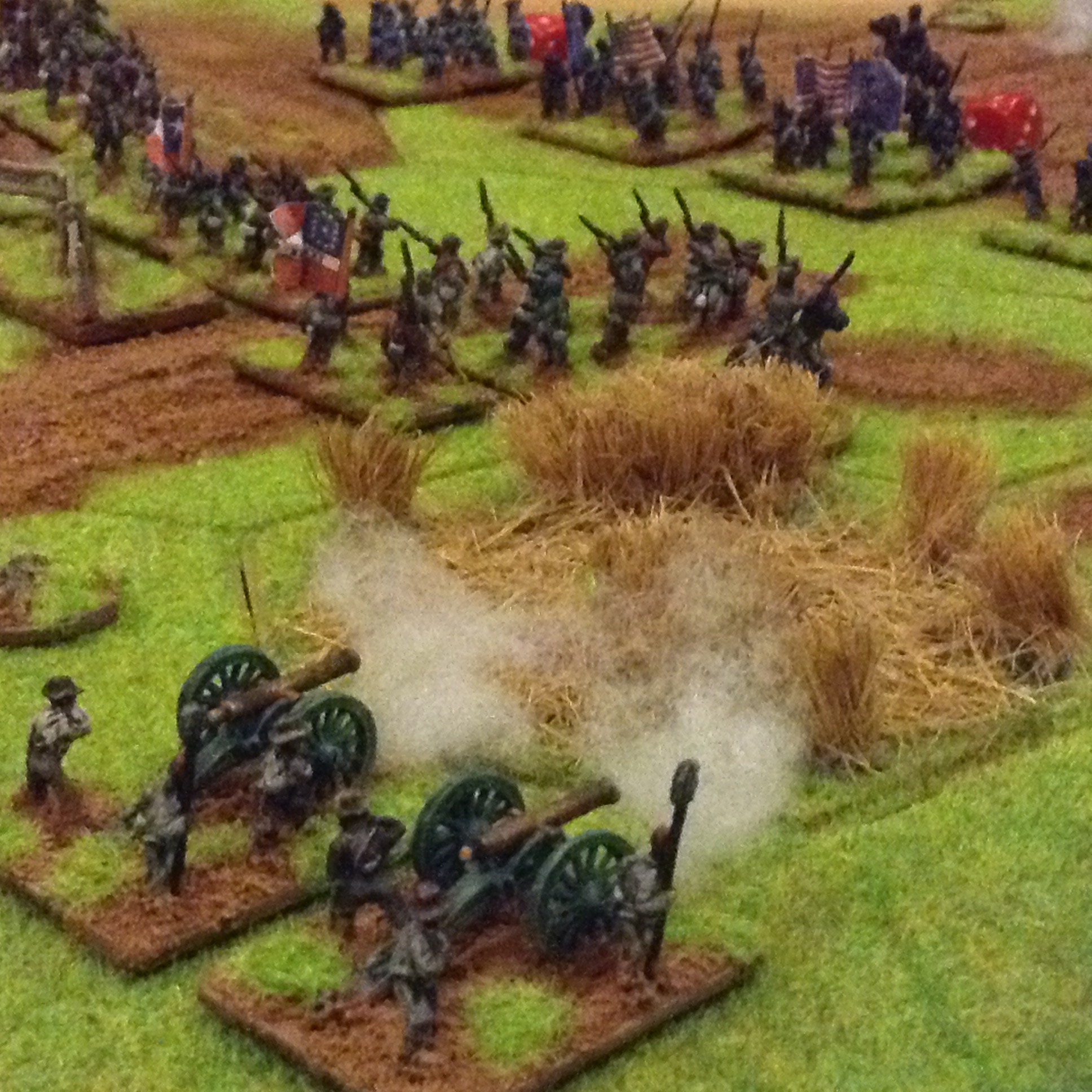 Selection of photos of a second game for the Yankies and Rebs to fight it out, now all based and flocked with command figures. Ended with a fair draw with heavy losses on both sides, the foremost brigades suffering withering fire with exchanges of volleys at close ranges with casualties of 60%. The Union guns suffered poor dice roles which gave the Rebs a better result overall. Burnside.