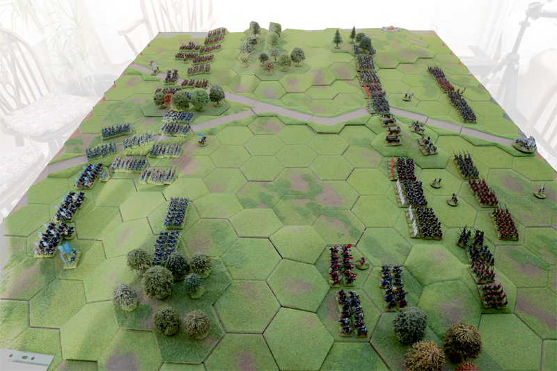 I chose the table edge which I felt would provide the best cover and therefore offer some much needed cover from Danes ’artillery. Dane had 2 units of heavy cannon and 2 units of short range bombards whereas I had no artillery but I did have a few more ashigaru infantry units. Because I had choice of table edge I deployed first, up to 4 hexes in from the table edge and across the entire width of the table. Once my deployment was complete, Dane, as I had feared, deployed his dreaded heavy guns on the small central hill near his table edge with the rest of his army quite compact and centralised giving him options to shift troops to either flank. Dane also had first move in which he pushed his missile troops forward most of which were carrying pavisses for protection from bowfire.