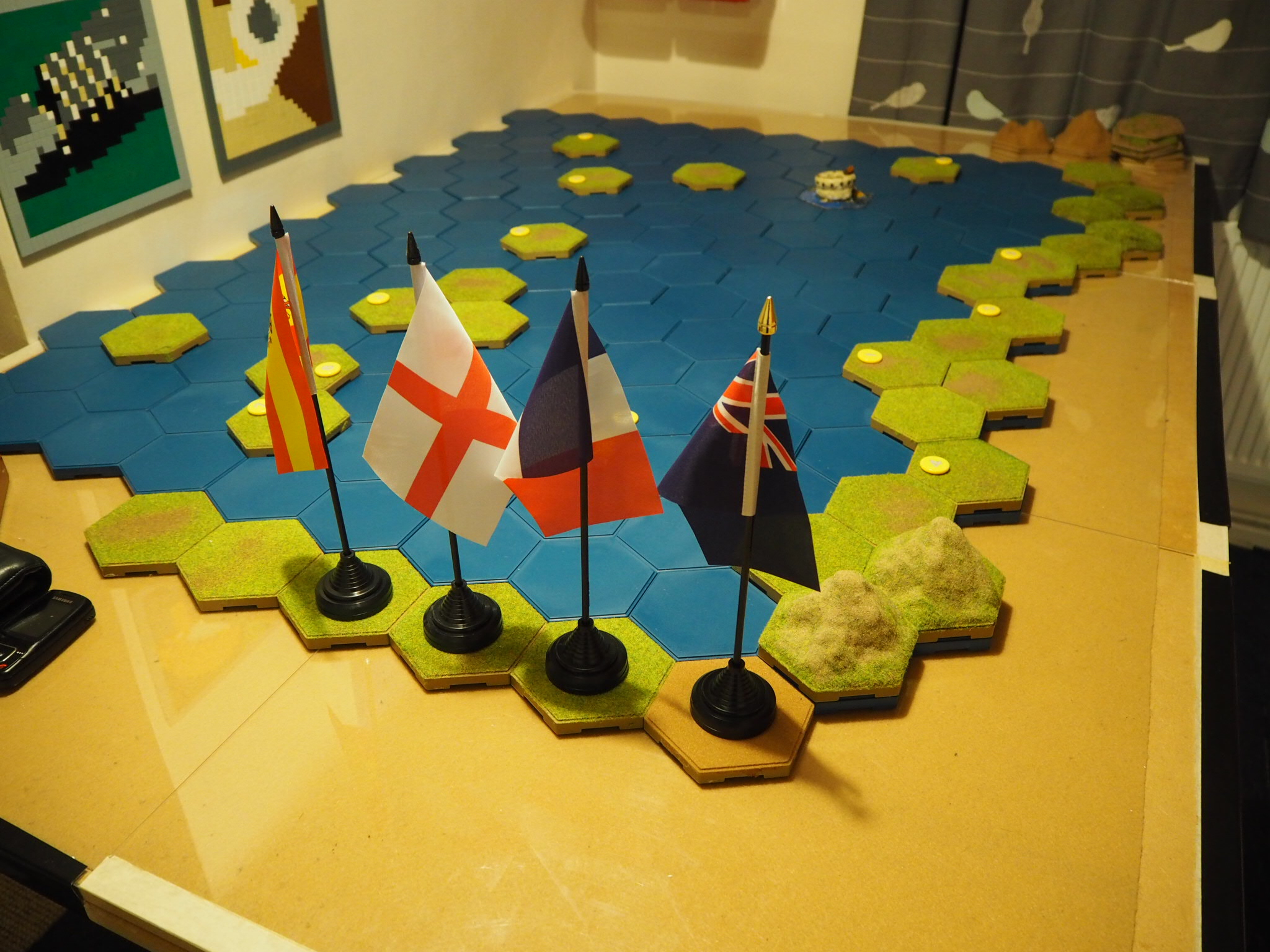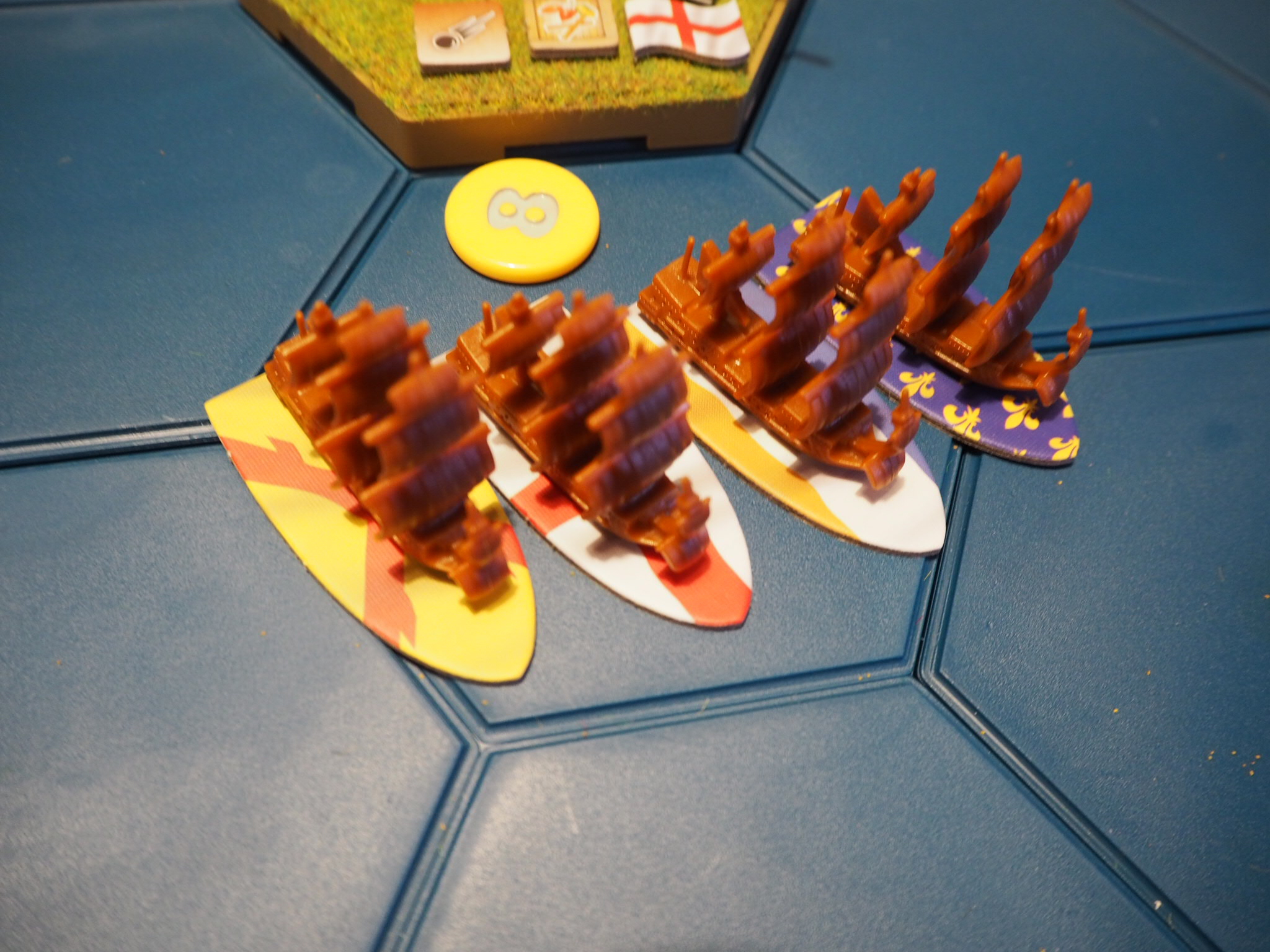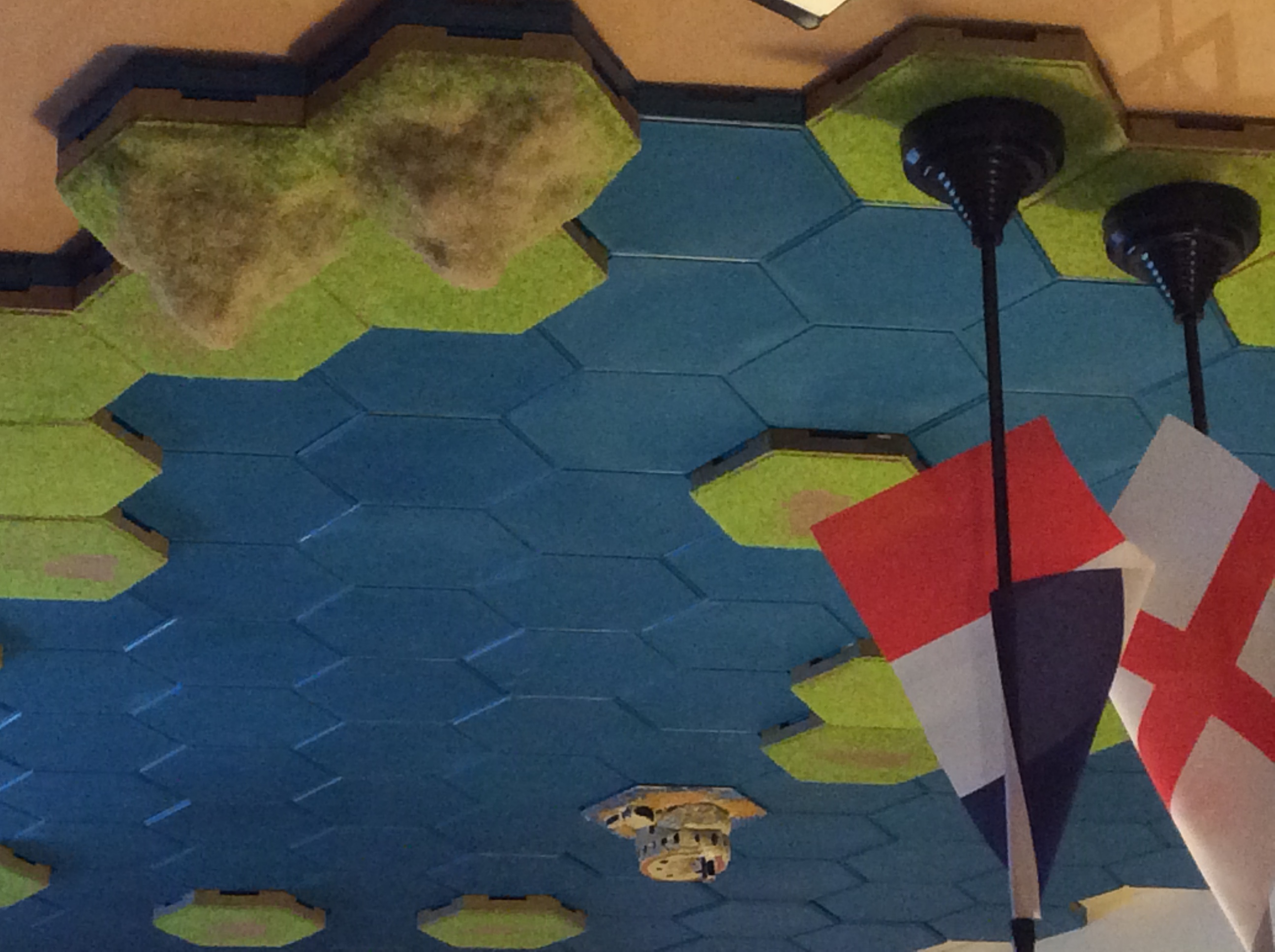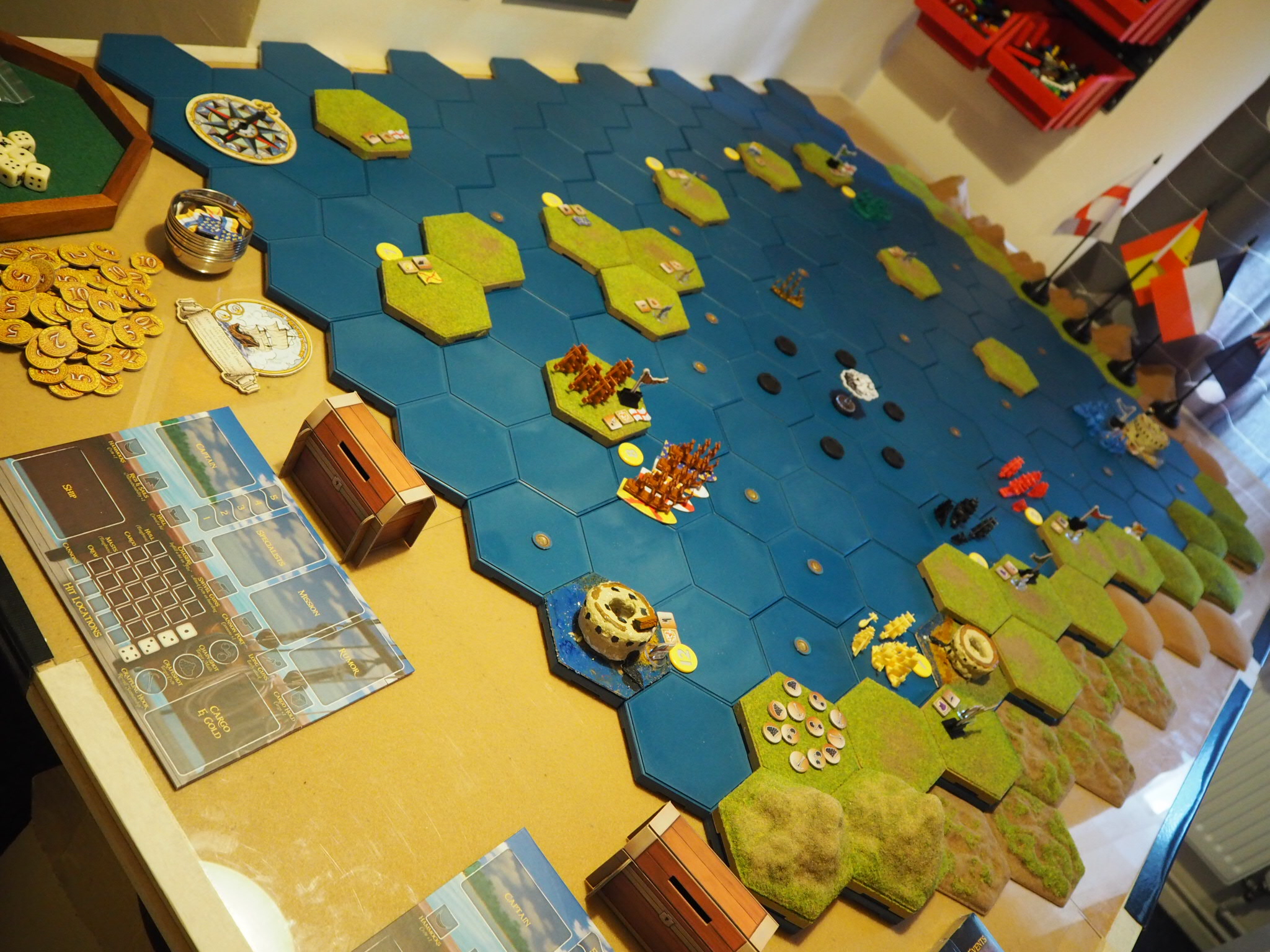 It is still not entirely clear in my mind about placement of pirates and Royal Navy ships. They occur from the card event deck. Maybe they should start on a random hex or random port hex. Also movement is not entirely clear but could roll a die D6 for direction every time the pirates and Royal Navy have to move.