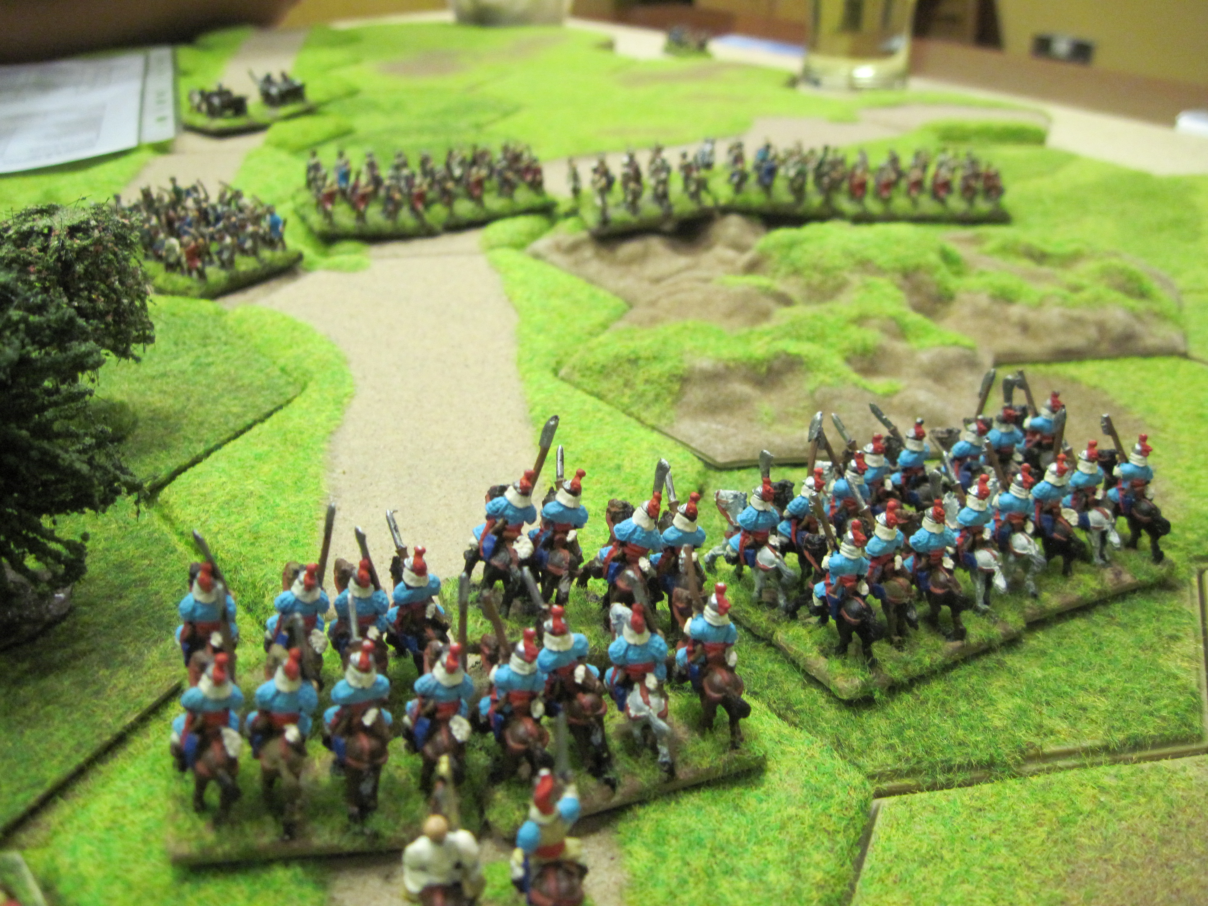 Karl and I deployed our Korean army first having chosen our table edge, with our cavalry, the cream of our army, facing the largest open area on our right flank. Unfortunately, by deploying second, the English players, (Tony and Dave), placed their mounted knights on the opposite side of the table to our cavalry, which left a line of longbow facing our cavalry.