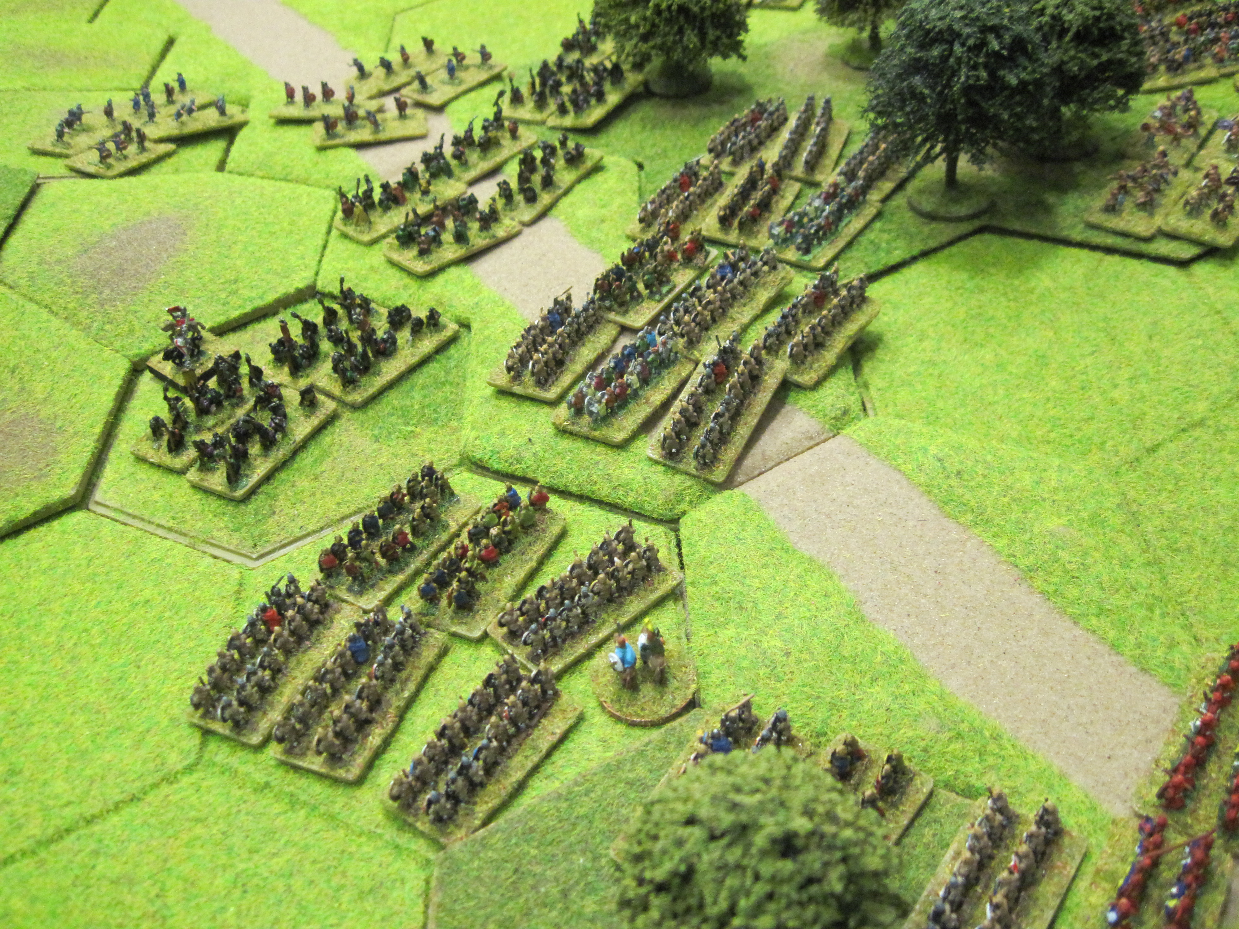 We Gallic commanders put our heads together and came up with a sort of plan; advance quickly and take control of the three areas of woodland, which would hopefully give our units a better chance against the Roman heavy infantry which could not voluntarily enter woodland hexes. Our quick moving 6 stand units of Gallic warriors soon gained ground on the Romans and we moved our 2 units of cavalry opposite their Roman counterparts.