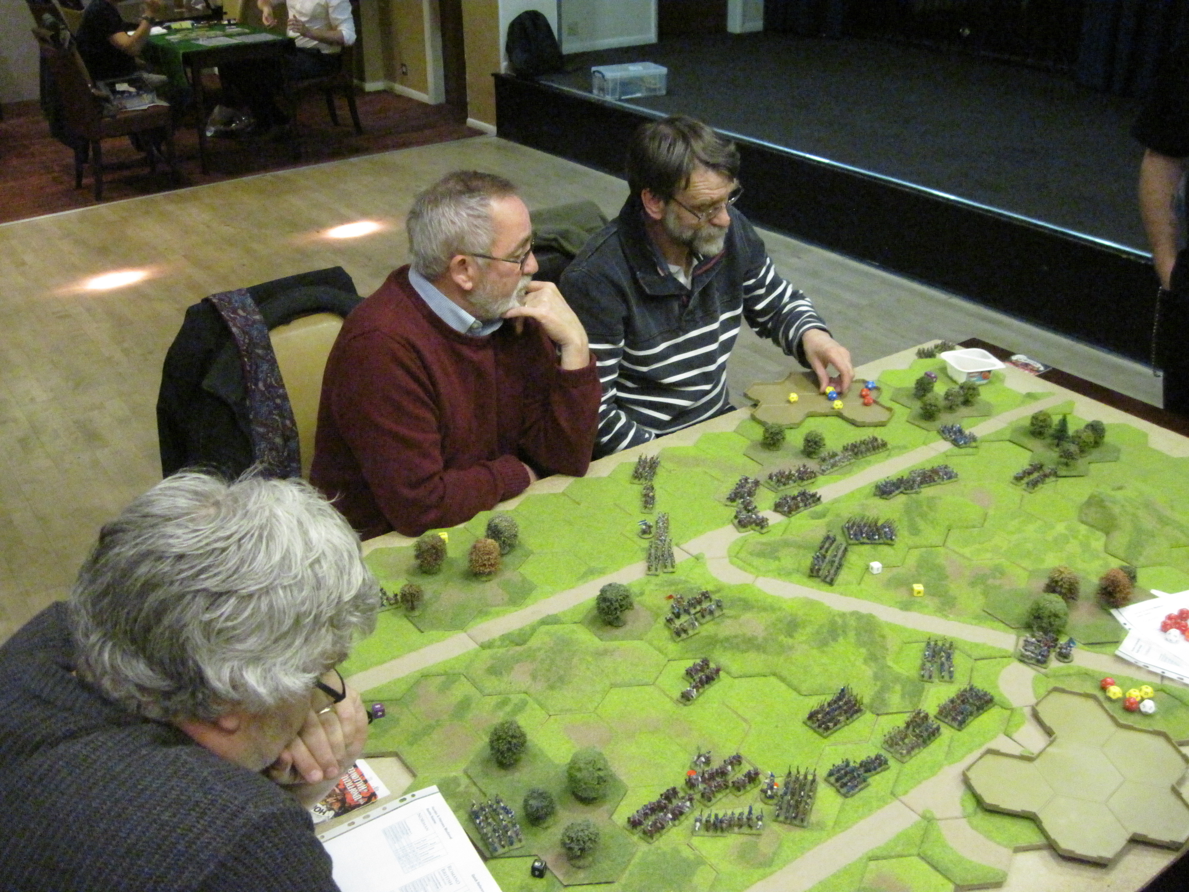 The teams swapped around so that Tony, Dave and Tim had the Normans and Mark, Chris and me had the Romano Brits. The first few moves of this second game saw both sides adopt a slower and more cautious approach. Tony was once more in the role of Norman cavalry commander and after his exploits in the first game ‘we’ Brits were watching his every move and Chris kept his 3 chariot units safe behind a line of warriors.
