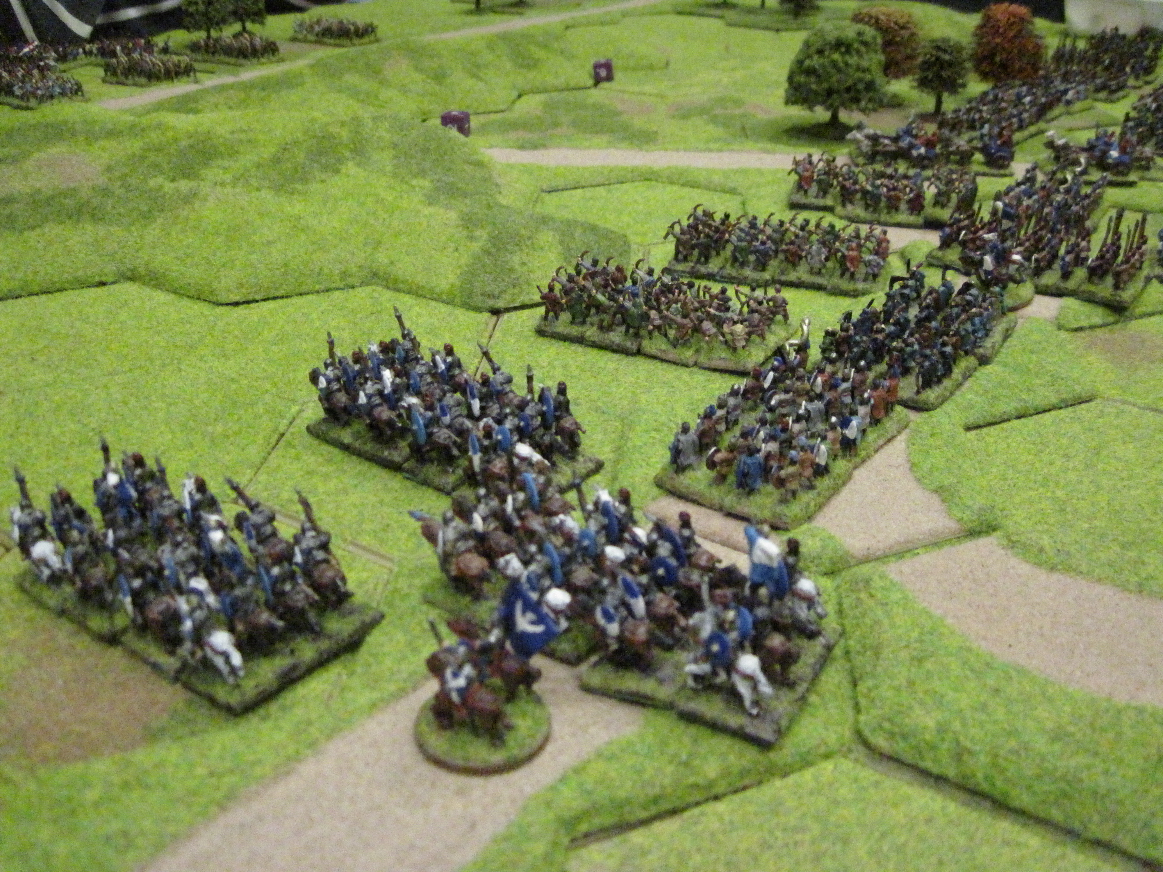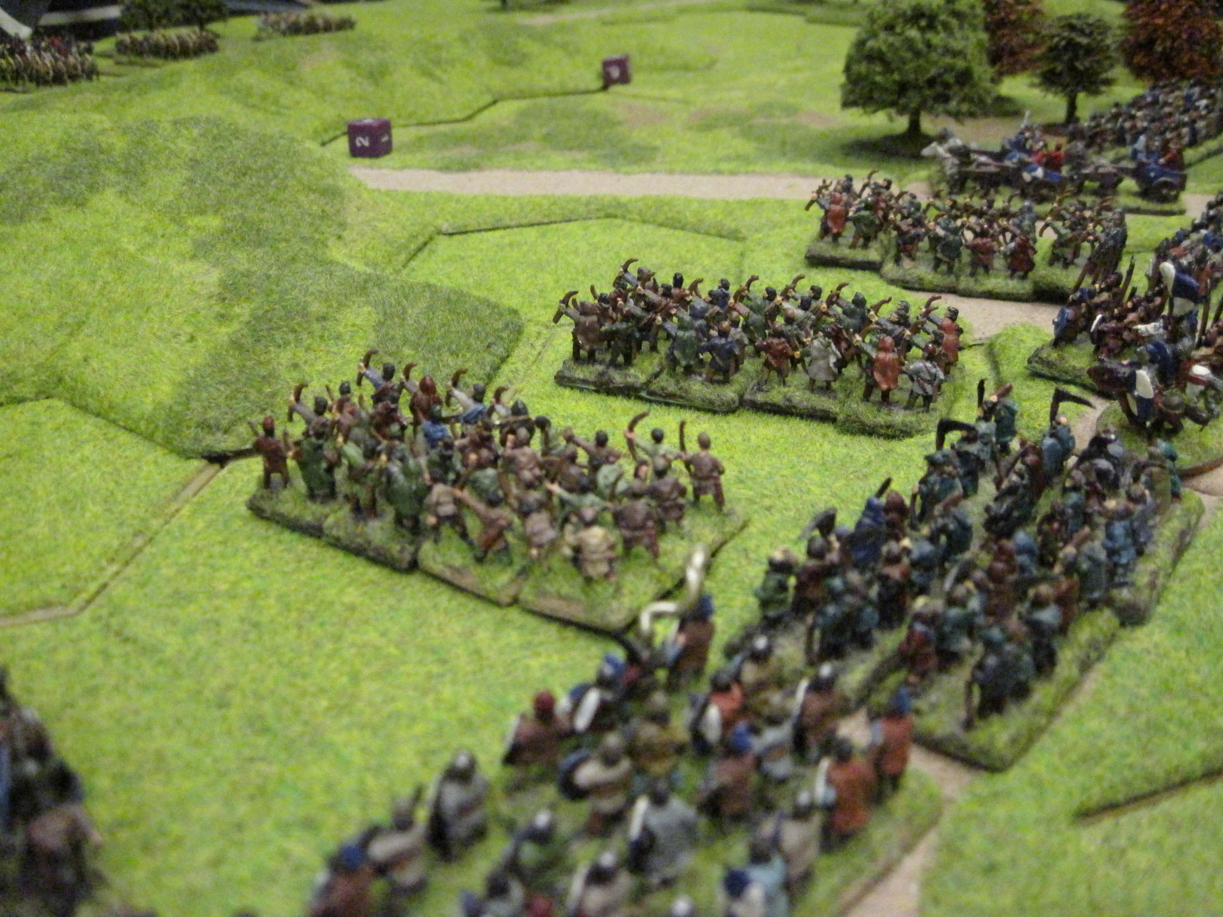 The two armies started on the opposite side of the table to the previous game. This meant that the Norman cavalry were deployed in close to 2 areas of woodland which could restrict their movement if we could get our warriors into position quickly enough. On our far left Mark occupied another area of woodland with 2 peasant hordes, a unit of warriors and a unit of ‘B’ class spears. They were soon attacked and slowly pushed back by Norman infantry, but this committed many Normans to our left and away from the centre.