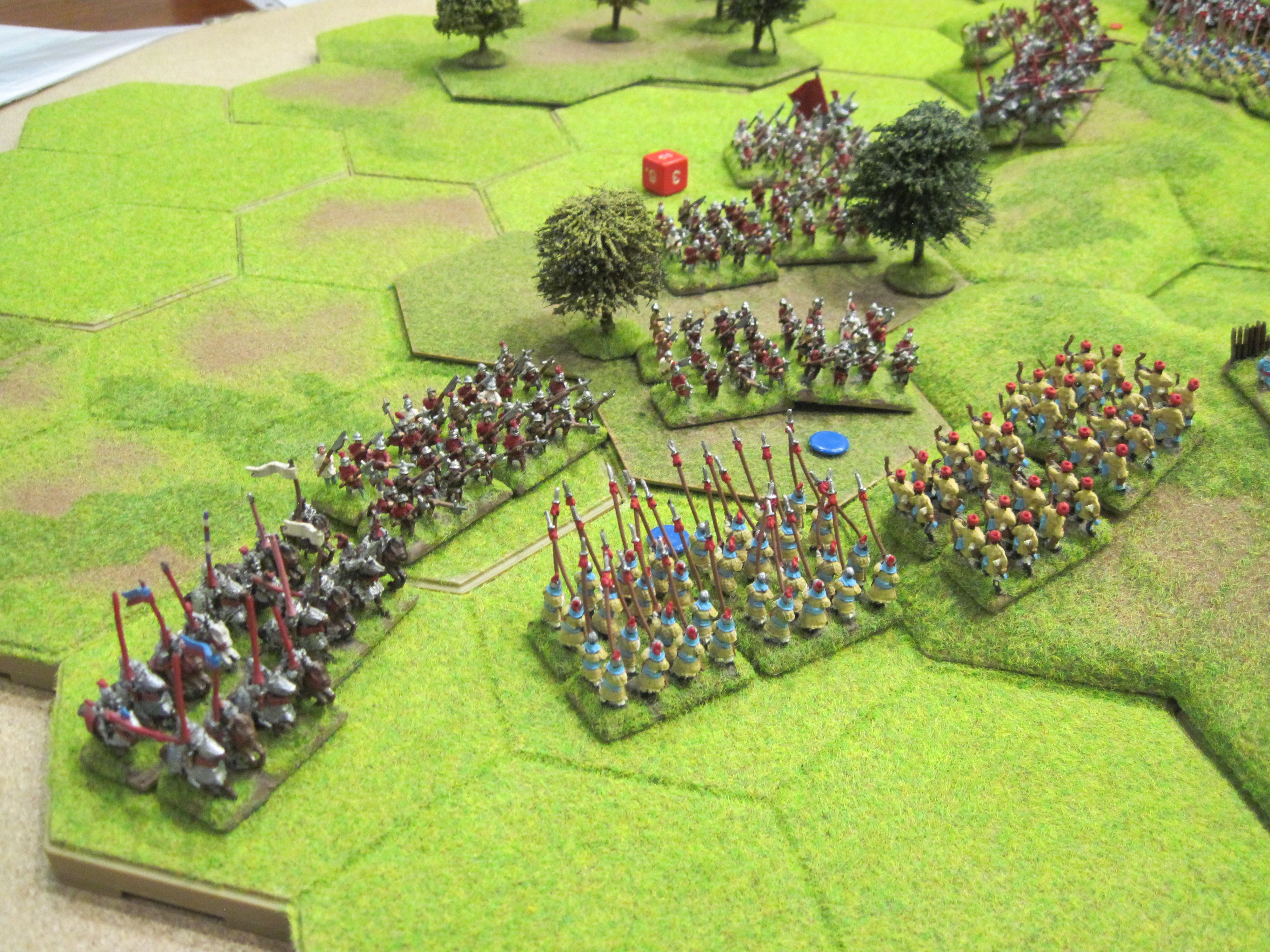 The terrain gave opportunities for both sides with Tony and Dave (Yorkist), choosing the table edge with a very defensible 8 hex escarpment. Chris and I (The Koreans), won the di roll for first move and used this to gain plenty of ground with our cavalry. Areas of woodland on both sides, and towards the table edges would restrict the areas in which the Yorkist and Korean cavalry could operate effectively, and as a result the ‘action’ would be destined to take place in the centre and centre left of the field.