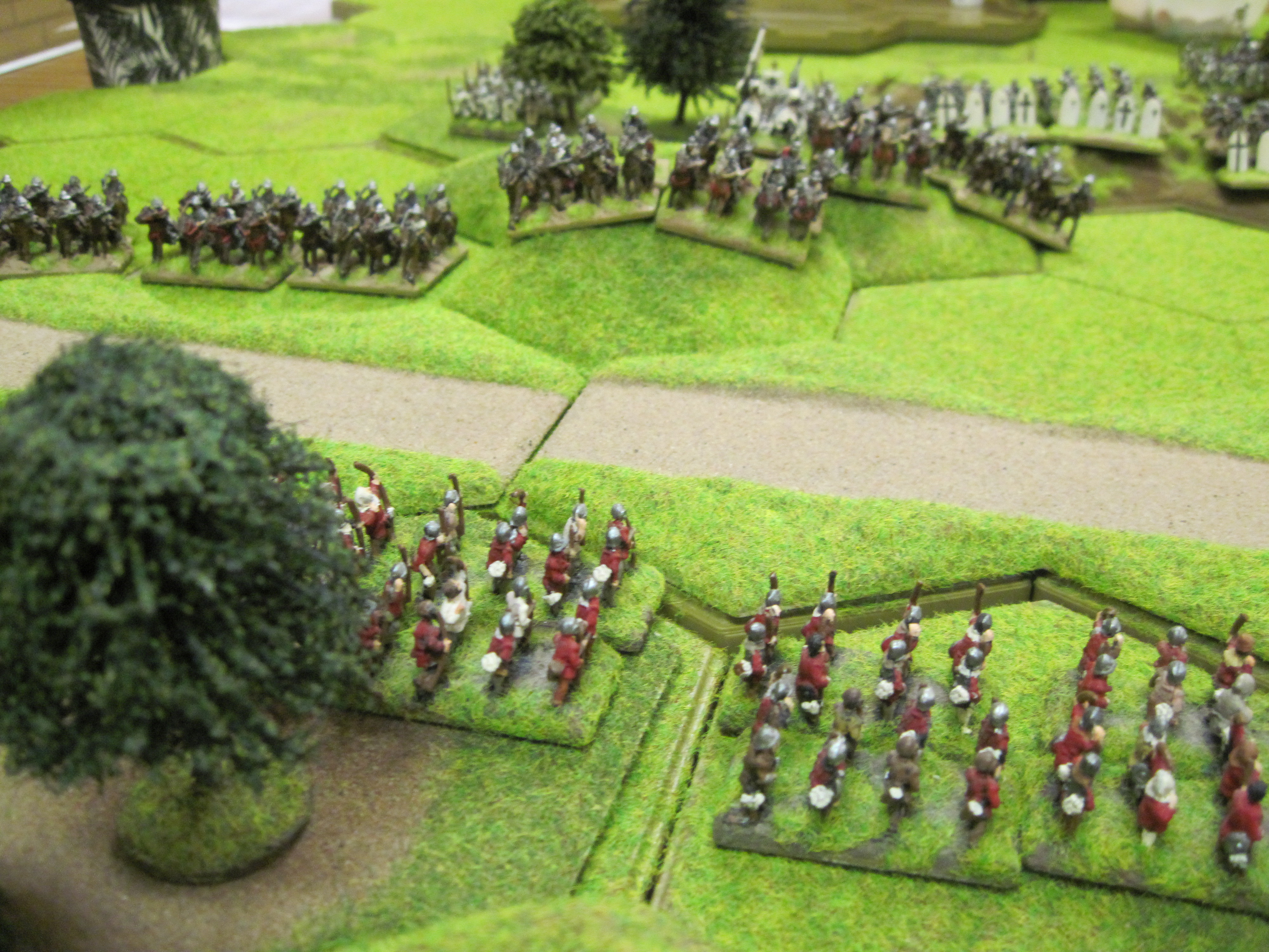 The charge heralded the commencement of hand-to-hand combat at various points along the closing lines. The Yorkist bill and longbow attacked the right of the Teutonic line where the mounted crossbow were unable to manoeuvre in restricted terrain. The billmen pushed these aside only to be stopped in the woods by very stubborn units of Teutonic spears. This was the start of an infantry struggle which was to last an hour!
