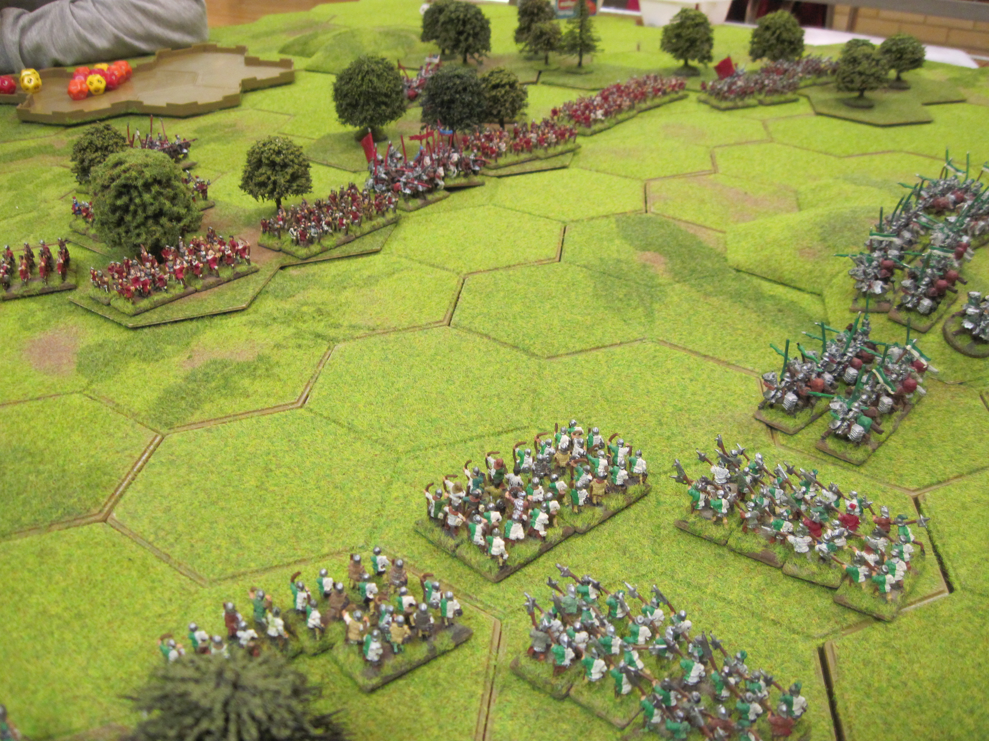 With identical armies, this was always going to be a game of tiny margins. Tony and Dave combined their infantry and cavalry in and between the central woods ready to attack Chris’s cavalry on our right wing. This would take time, and my infantry assault on the flank would have to proceed quickly to gain any advantage and in doing so disrupt their preparations. However, Dave’s longbow found their targets – 8 x 7+ out of 8x D12 shooting dice; that’s great shooting! As a result of very stubborn resistance from Dave’s infantry defending the woods, my progress was too slow, and Tony’s cavalry charged home against Chris’s cavalry waiting on and around a 4 hex hill.