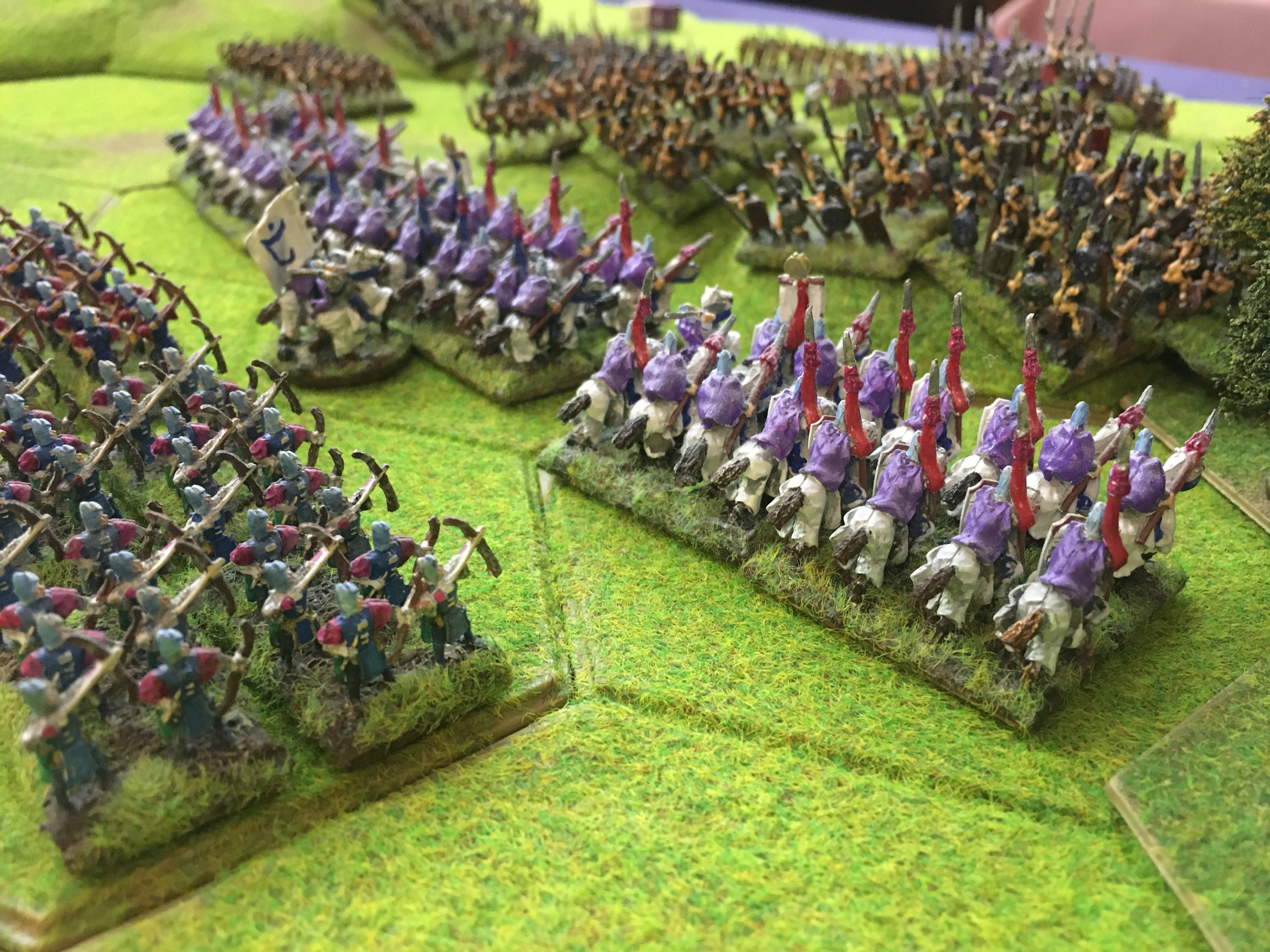Because this was the in all fairness a re-fresher game for Sally I limited the range of troop types for both armies and although these were fantasy armies there were no fantasy elements included. So without wizards, elementals, mammoths, giant eagles, dragons etc., this was to all intensive purposes a medieval battle. Below are the army compositions: