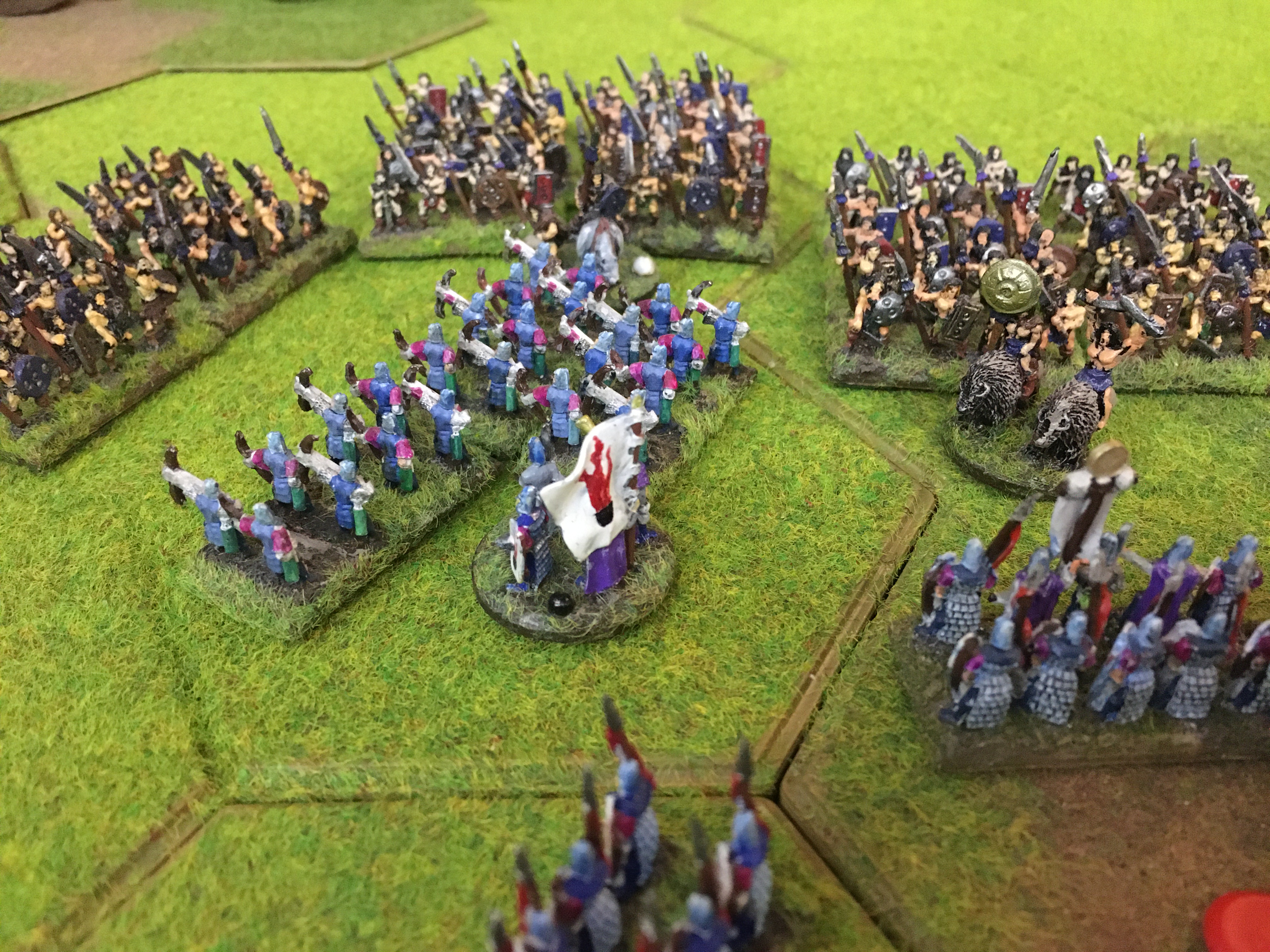 It was only fair to give Sally the choice of table edge and after both armies were deployed, she won the di roll for first move. The High Elves advanced in a line with 3 units of archers to the fore. The unit of bolt shooters and the other 2 units of HE archers were kept on a 4 hex escarpment on the left of the line. I in response moved my barbarian cavalry to the left of my line facing the HE Spears, but focused on keeping possession of the central wood and adjacent hill. I wanted to keep my hordes on the reverse slope of the hill as protection against the High Elf shooters. I had combined my hordes into units of 6 stands reducing the number of horde units from 12 to 8 in order to make them strong enough to fight the HE Spear units.