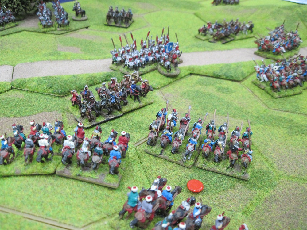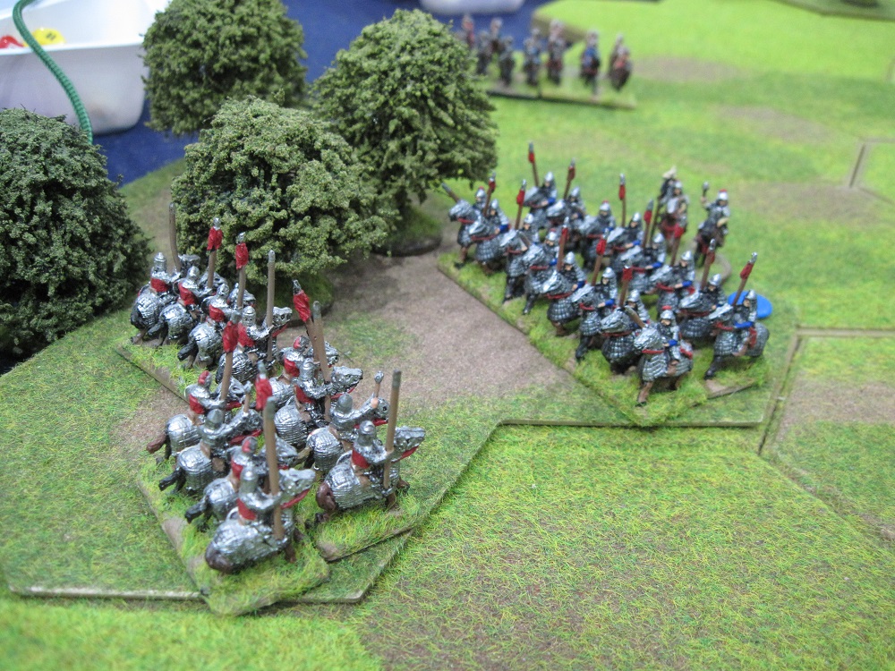 The first couple of tactical moves for both sides saw the small number of heavy cavalry units mostly accommodating a general, move positions within their own cavalry lines. The attack would come quickly, and the trick would be to make preparations in anticipation of this. Tony opened proceedings by pushing his Mongol light cavalry into shooting range of the extreme left wing of our line where 2 units of Akici cavalry were occupying a small area of woodland. Despite the extra A2 cover afforded by the wood hexes in the ensuing shooting phase managed to disrupt one unit and disrupt and recoil another.
