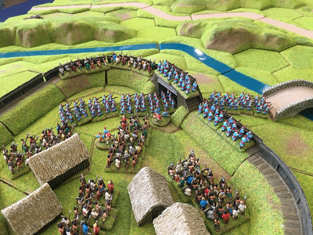 The exchange of bow shooting between the opposing units of cavalry was soon superseded by hand-to-hand fighting at the same time as the missile armed Samurai infantry advanced towards the fort. In response, Tim opened the gates of the fort to send out his units of Korean handgunners with the aim of establishing a shooting line to prevent the road through the mountains being cut.