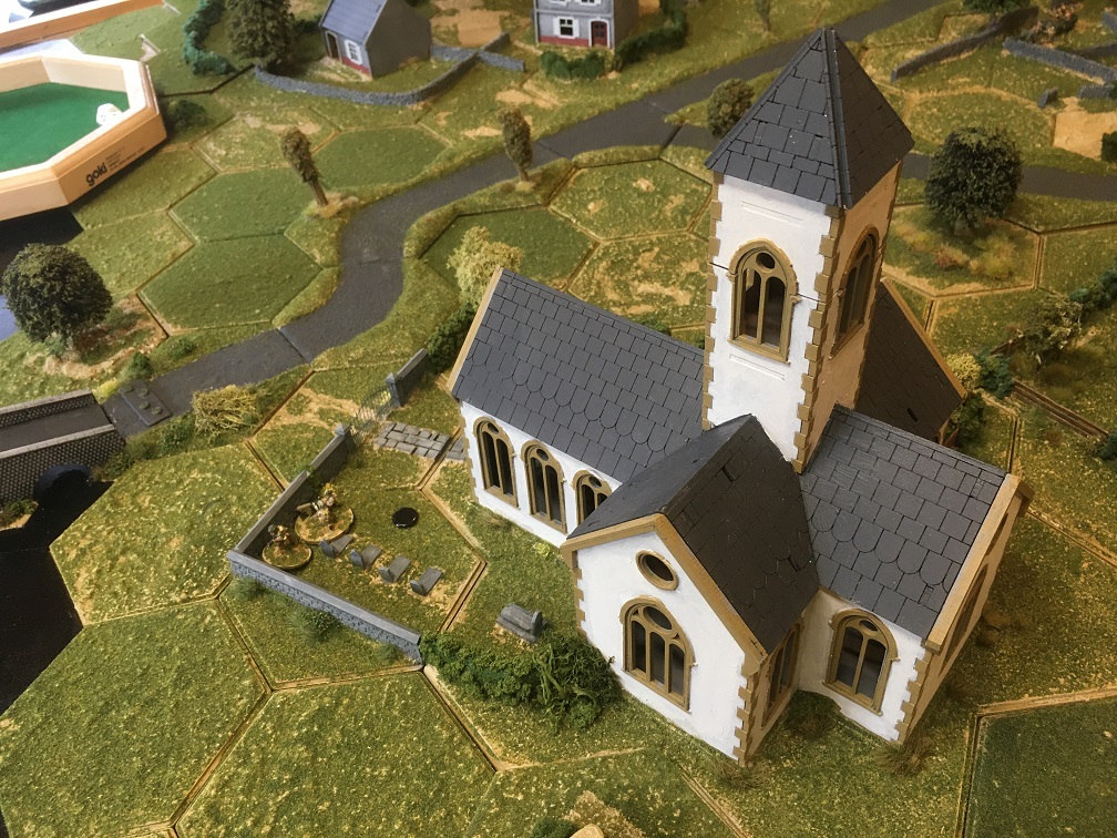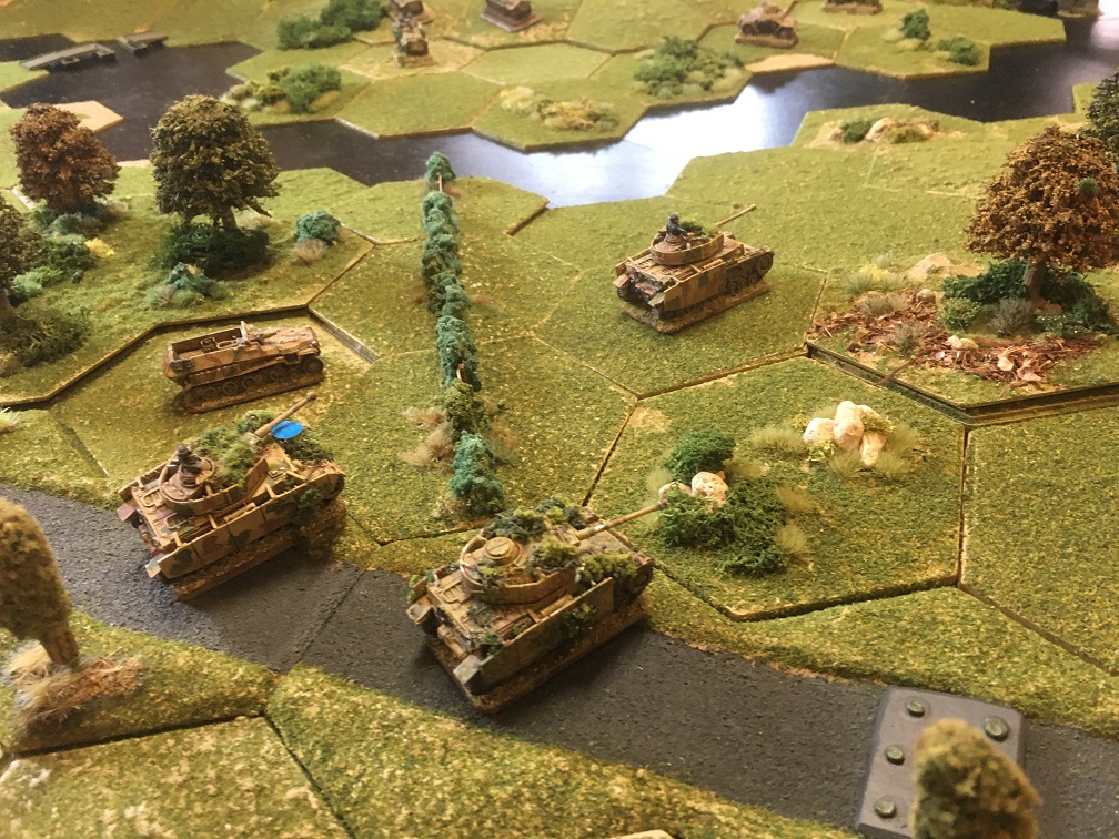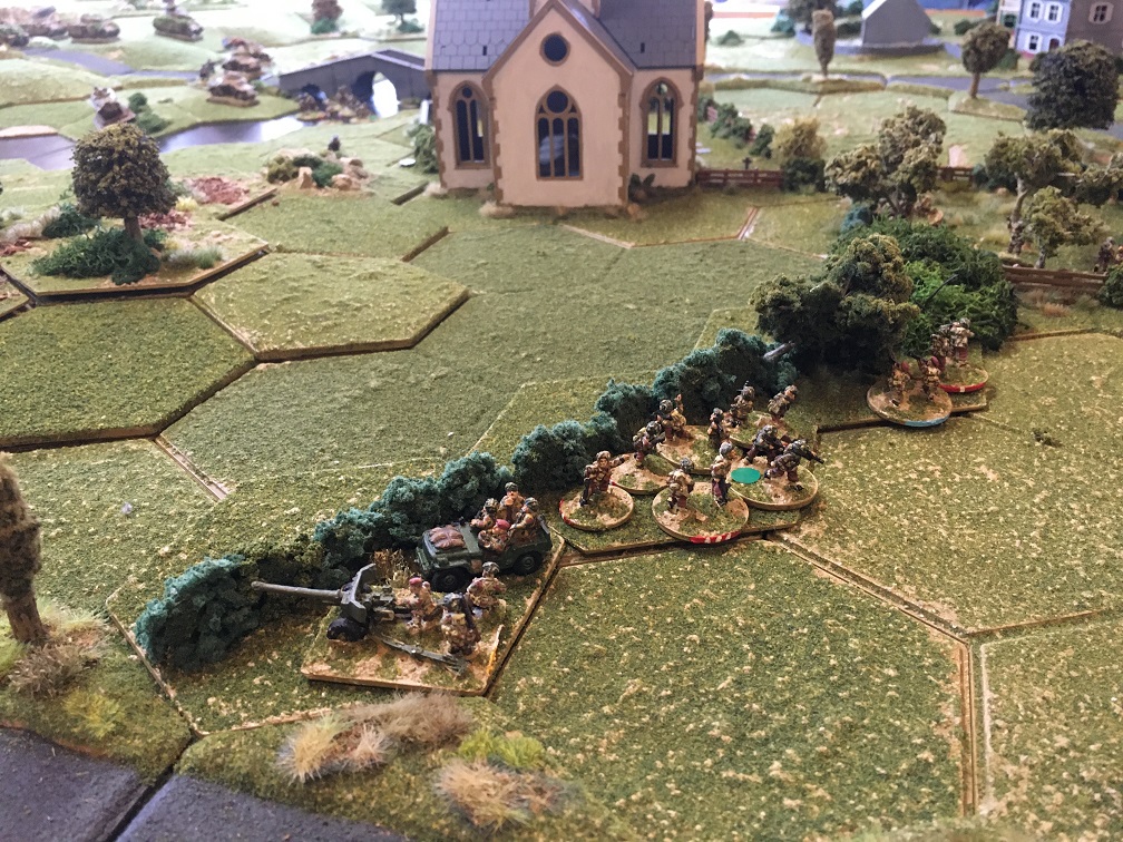 Off-board artillery was called in by both sides with limited effect, however, one salvo did manage to destroy the pontoon bridge which effectively prevented the two German forces from sending support units to each other across the river. The 6pdr was gradually picking off Callum’s tanks but his sdkfzs gave effective fire support to my infantry on the other side of the river which did eventually enable me to capture all of the woodland hexes adjacent to the church but not without sustaining very heavy losses.