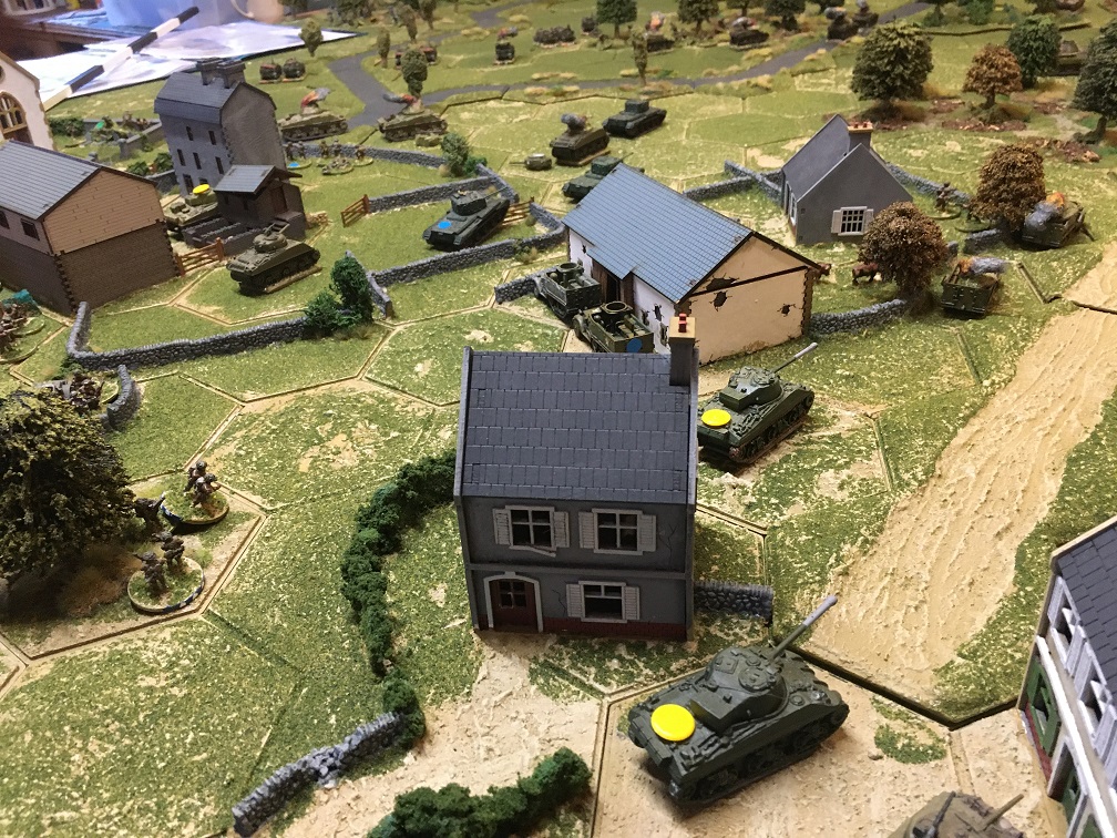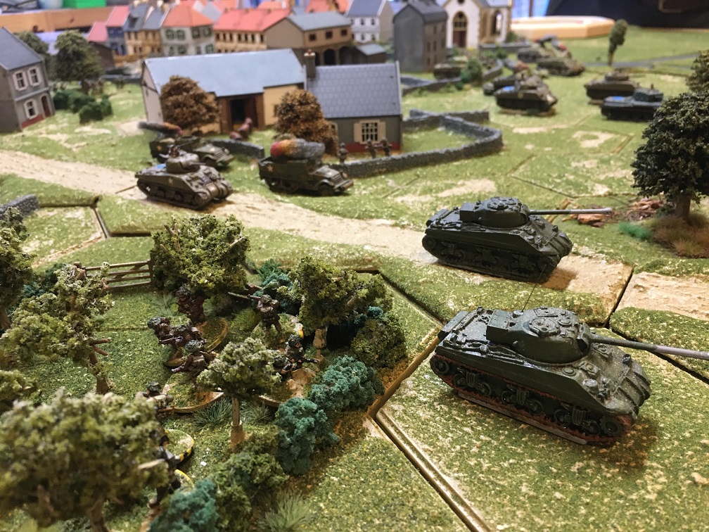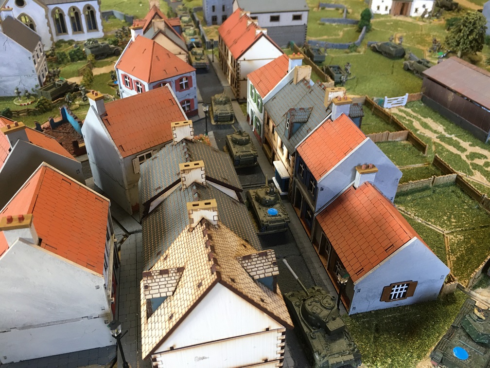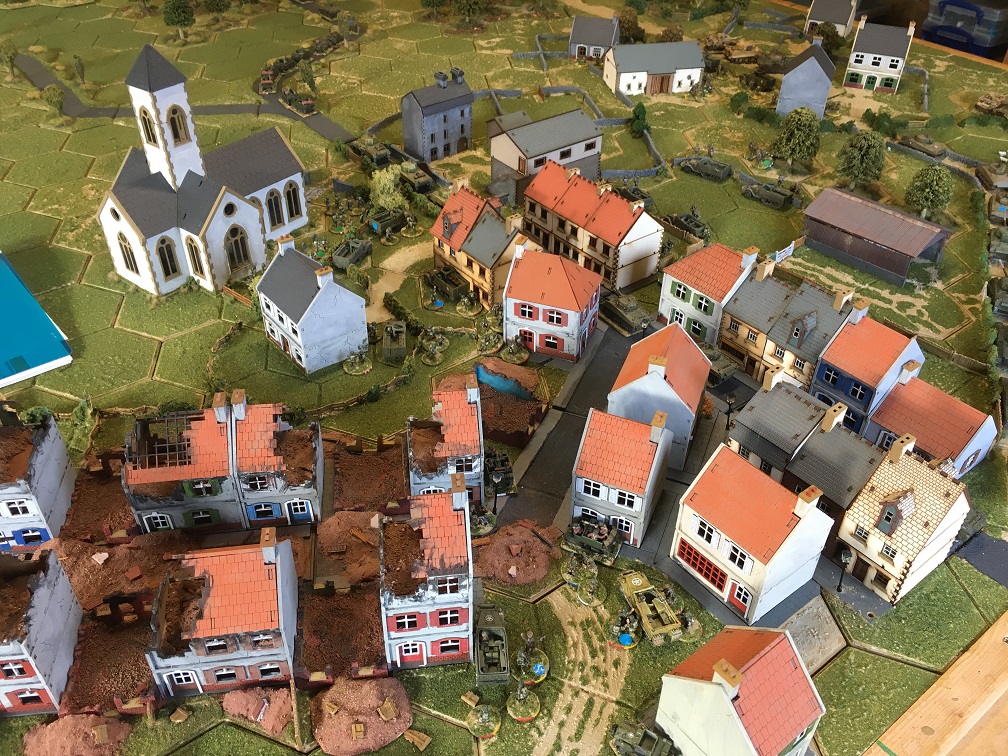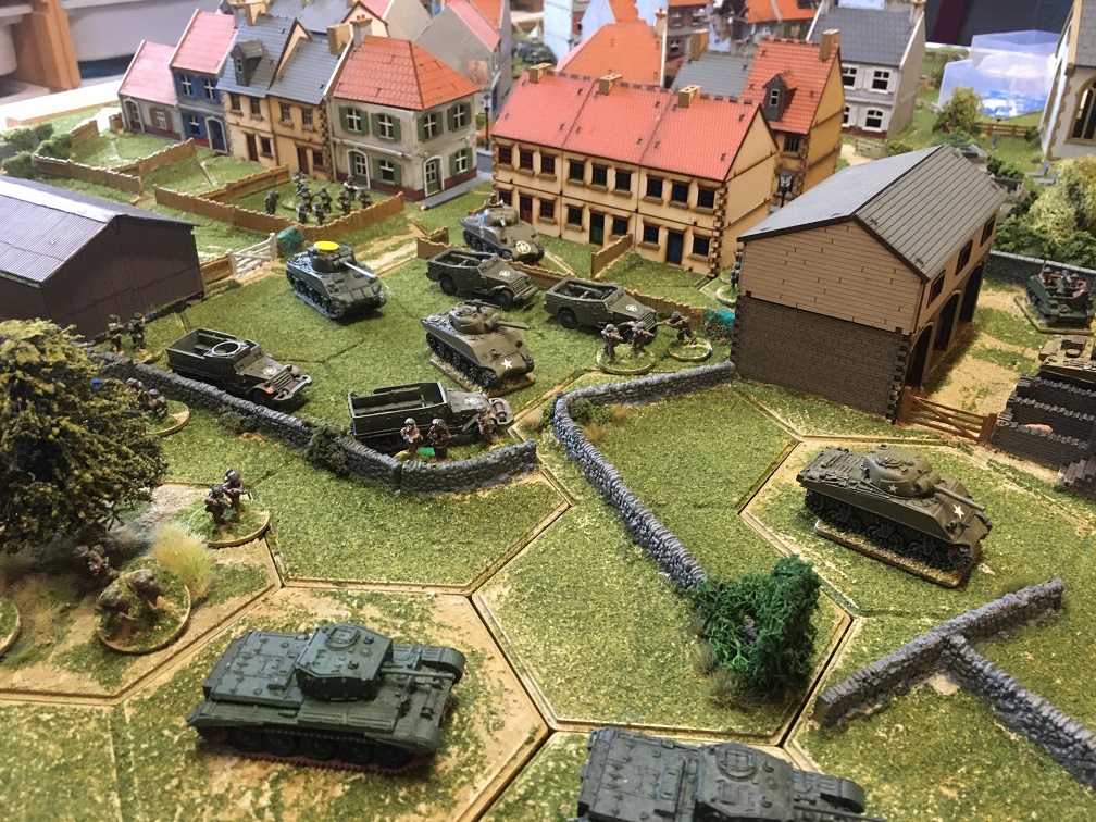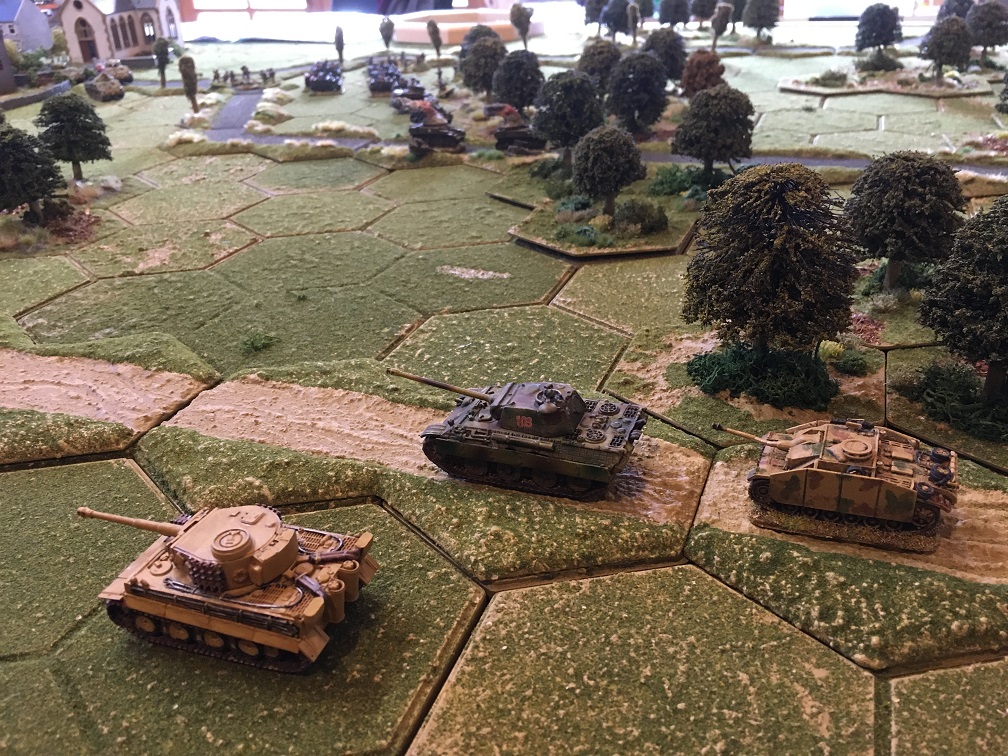 Thanks to Dave for organising this game using his own bespoke Hexon terrain and extensive collection of WWII miniatures. In this scenario the German force has launched a counter attack lead by a German tank force consisting of 3 Panthers, 2 Stug IV’s and a Tiger. These would appear along 2 parallel roads leading to a small French town held by a substantial British infantry force supported by 20 tanks; Shermans, Sherman fireflies, Stuarts and Cromwells. German infantry units would join the counter-attack after a pre-set number of game turns.