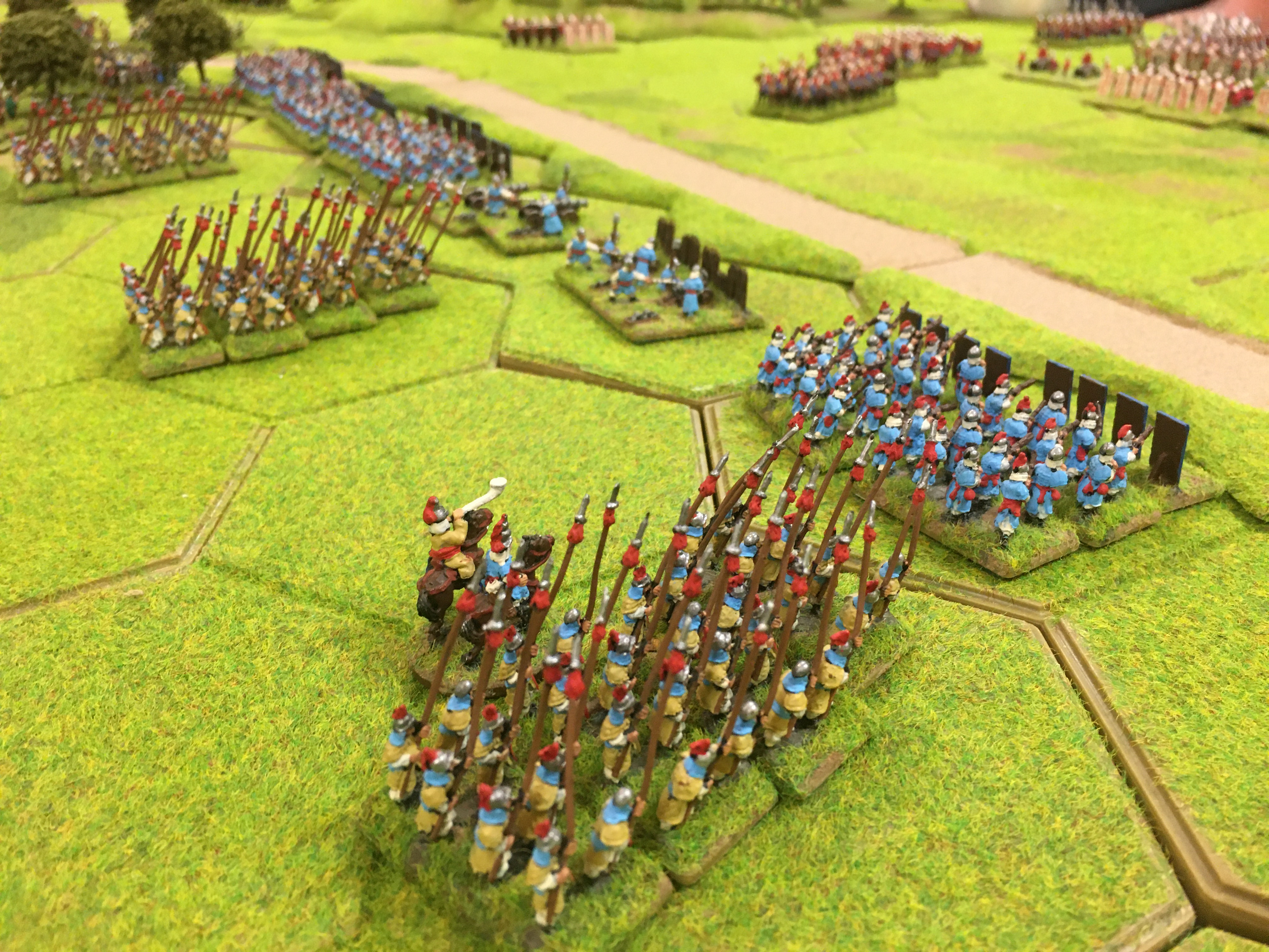 Chris, Tony and James F took command of the Chinese and Tim, James and I the Koreans and our Koreans won the roll for first move. The terrain had one road snaking from one table edge to the other with a scattering of woodland areas and small hills. The centre of the table was flat and open and it became the natural position for both armies to establish the lines of their missile units all protected by pavisses.