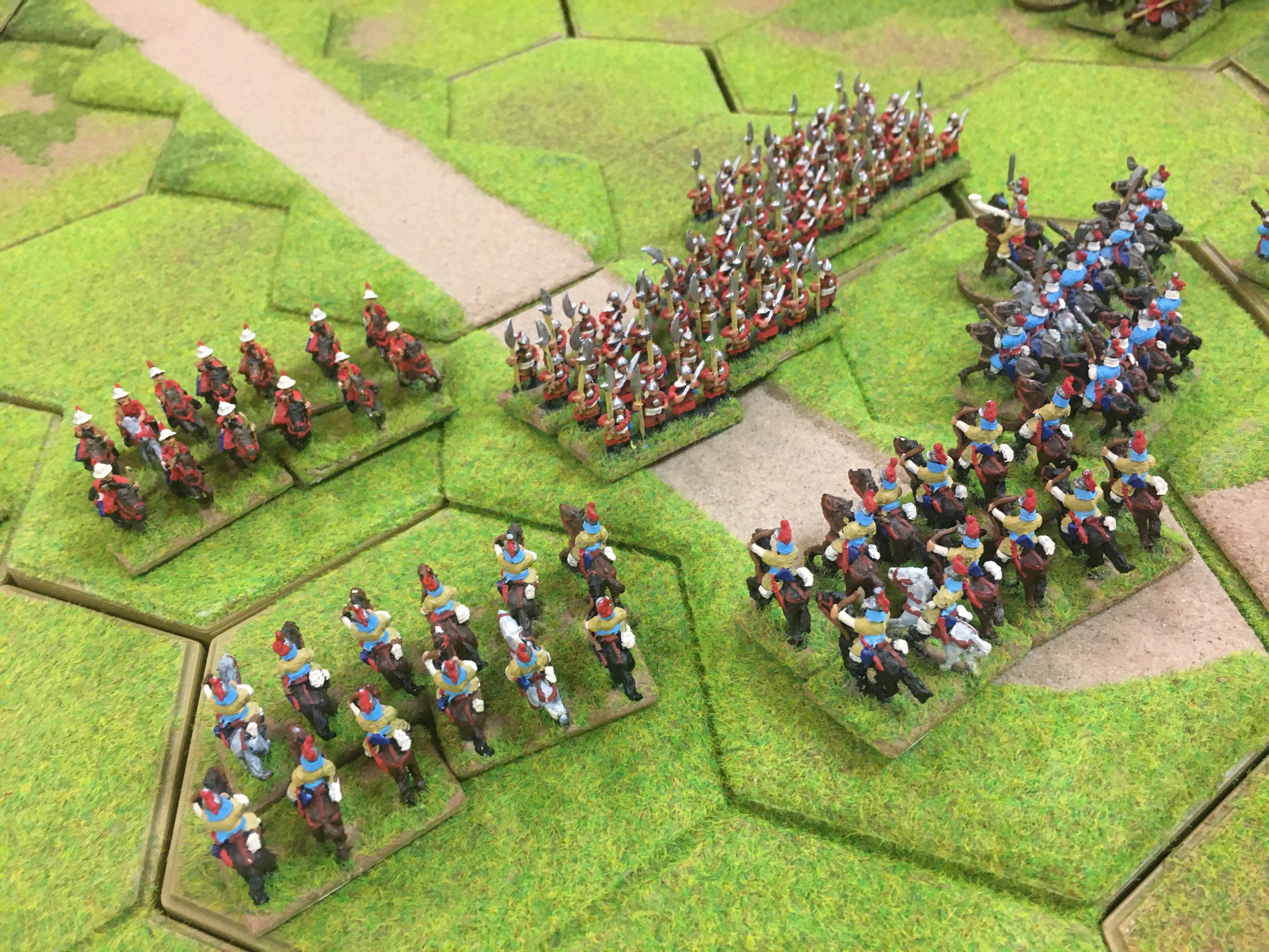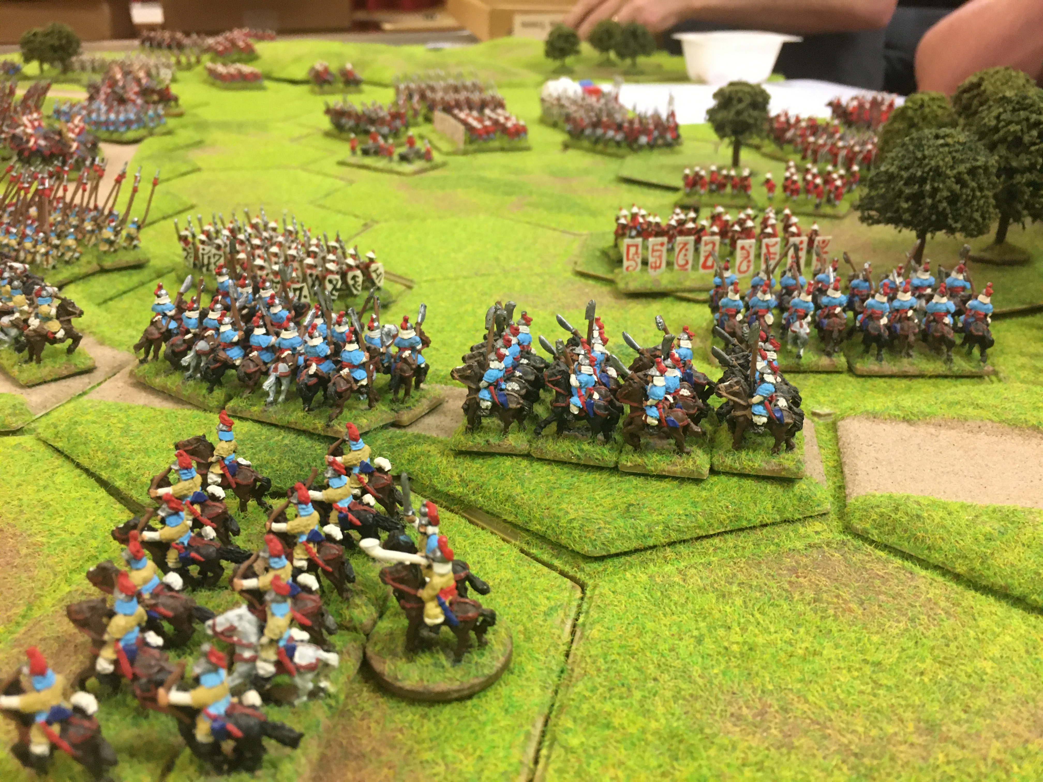 James took control of the left, Tim the centre and I the right wing of the Koreans. Tony took the left of the Chinese facing me, James F the centre and Chris the right. The Koreans had 8 units of cavalry and the Chinese 10, but the Korean light and heavy cavalry were all ‘B’ class and bow armed whereas the Chinese were more mixed, mostly ‘C’ class apart from the 3 units of ‘B’ class heavy cavalry. So Koreans enjoyed a slight cavalry advantage and the Chinese had a similar advantage in numbers and quality of infantry – game on!