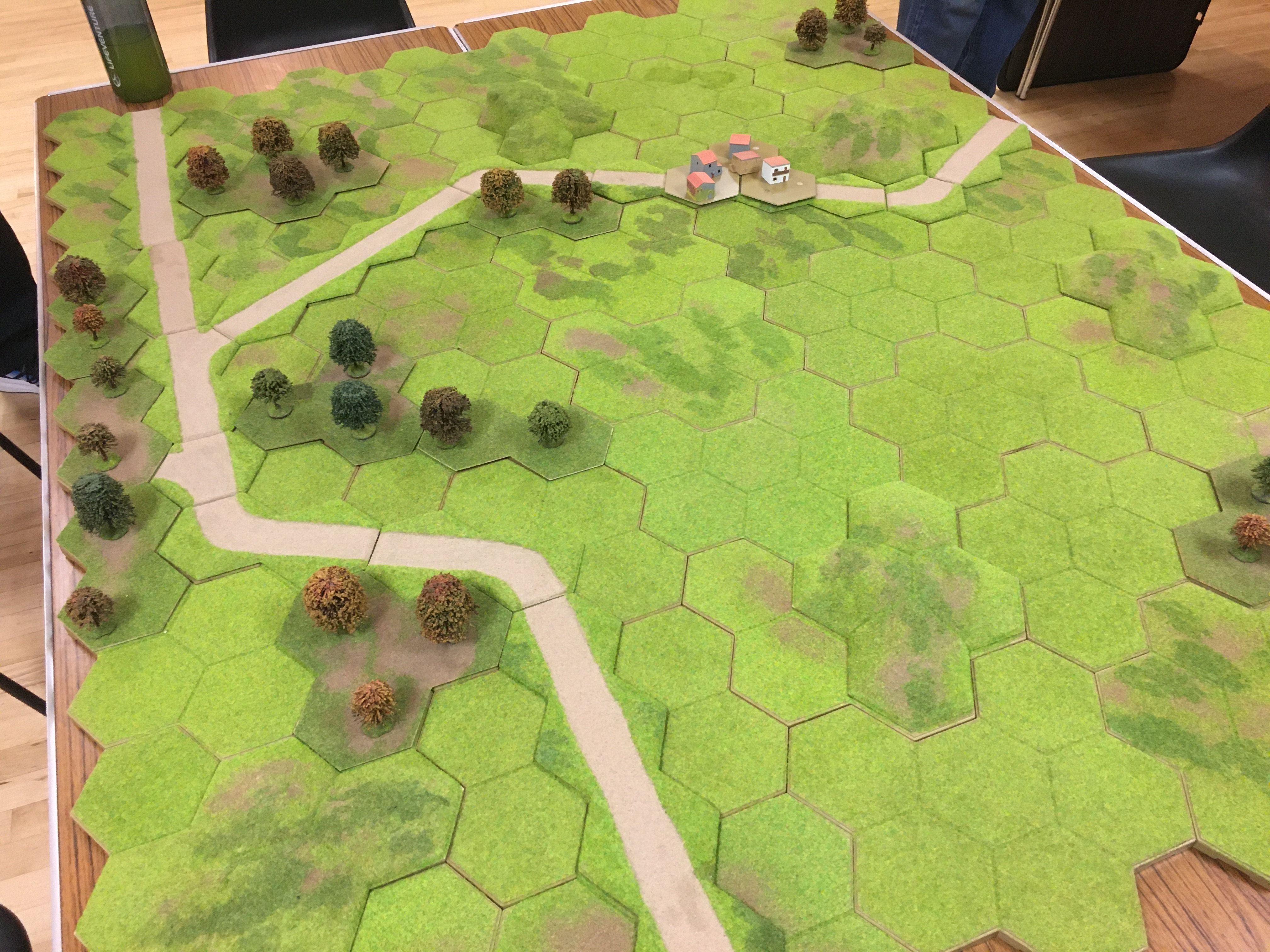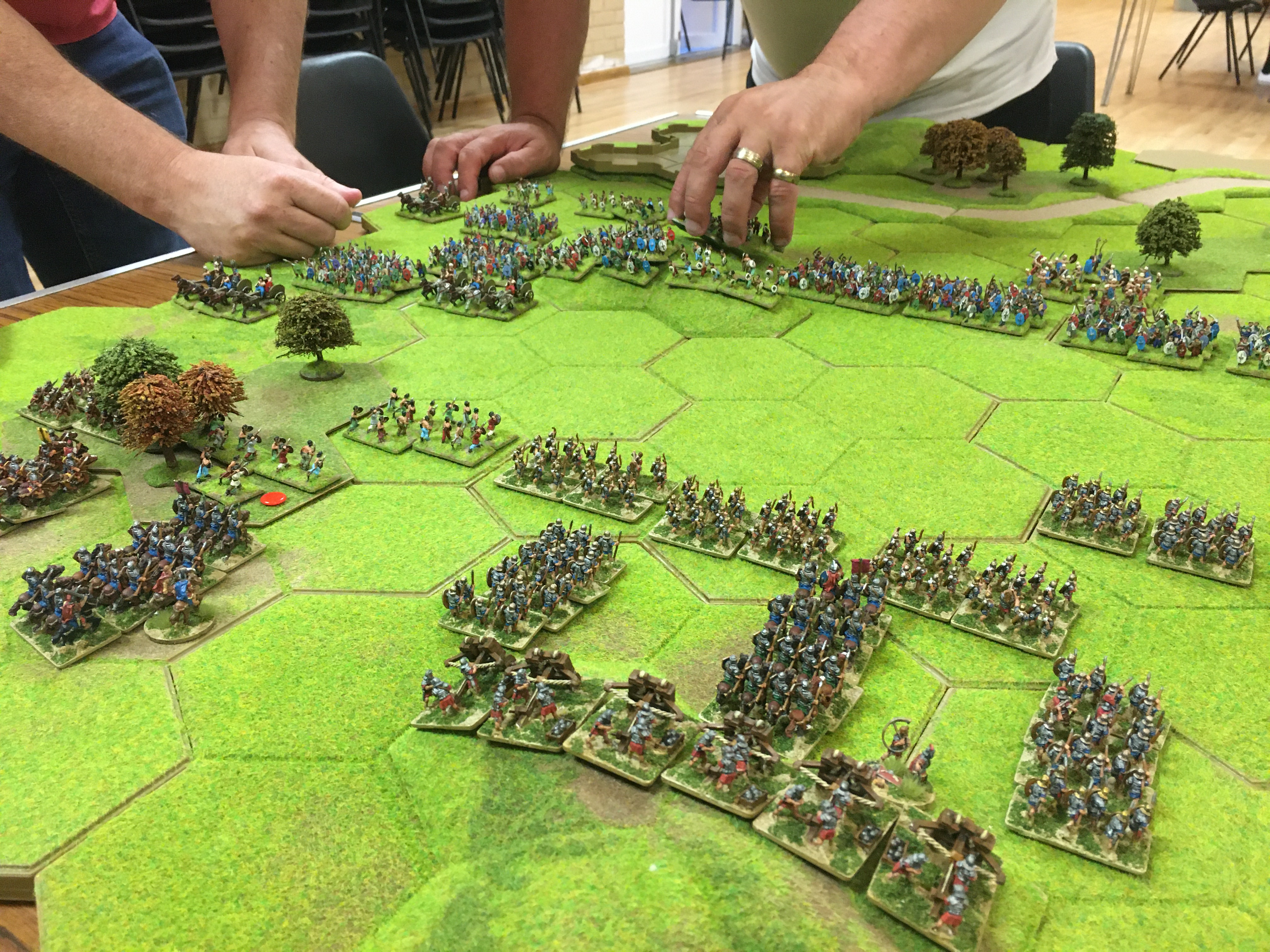 We deployed all our Roman legionary units inside Reading and directly to the left and right of the settlement stretching all the way to the table edge on the right. Their front protected to by a 4 hex escarpment on the right and an area of woodland straddling the road leading into the settlement. To the left was the wide expanse of open ground punctuated in the centre by a 4 hex hill on which we deployed the 2 units of ballista with the 3 units of Auxiliary archers in front. The Brits deployed along the trade route across the whole width of the table with the chariots and skirmishers on their right and the slingers and light cavalry on the far left facing the Roman legionaries in Reading and Behind the 4 hex escarpment. The mass of the British warrior hordes and fanatics were located in the centre of their deployment zone.