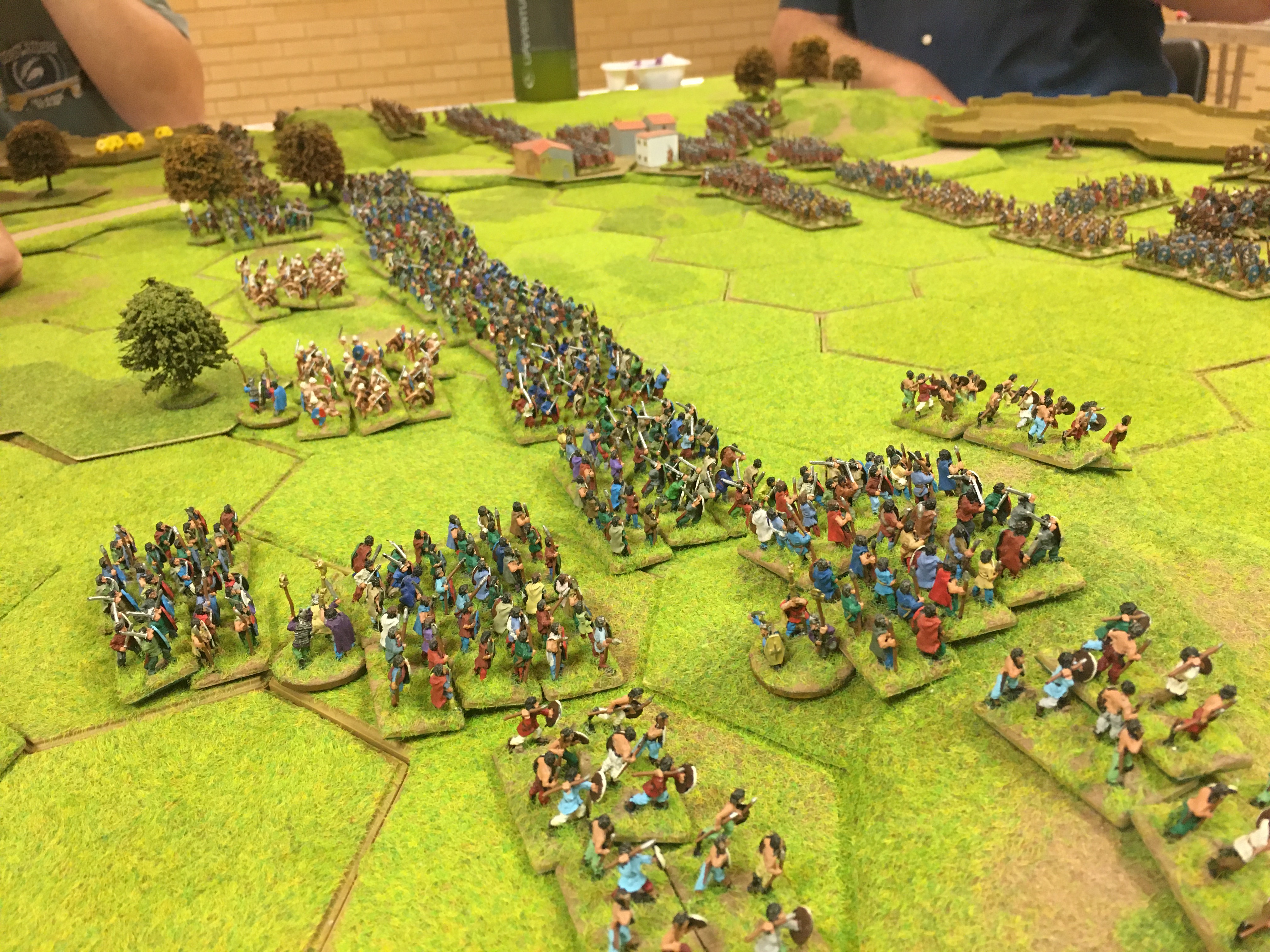 A number of game turns passed in which the missile units of both sides inflicted limited casualties on each other but caused plenty of disruption, recoils, evades and a few flee moves. We used this time to extend the legionary shield wall further to the left of Reading, now that Joe and I were convinced that there was no intention to attack to the front or the right of the settlement. Our primary mission was to hold the town at all costs and we already believed that we could do this even with over an hour of playing time still available.
