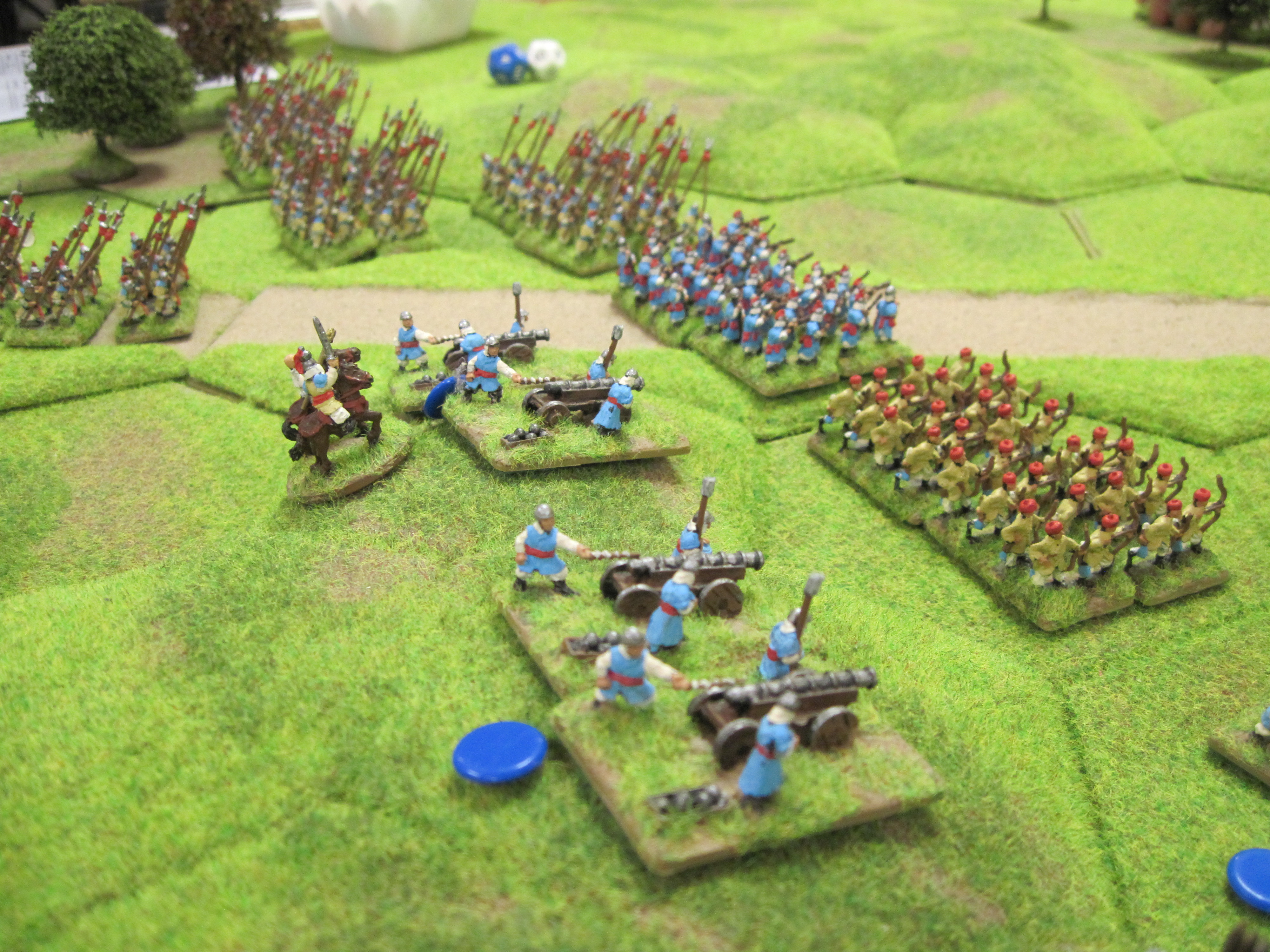 Meanwhile, Chris’s Korean spearmen and handgunners had taken up a strong defensive position along the road left of centre, which offered good protection from the shooting of Dave’s advancing Janissary handgunners. Tim’s heavy cannon had already inflicted losses on the Ottoman artillery and this enabled him to advance 2 units of bombards and handgunners to add support to the left flank of the Korean cavalry.