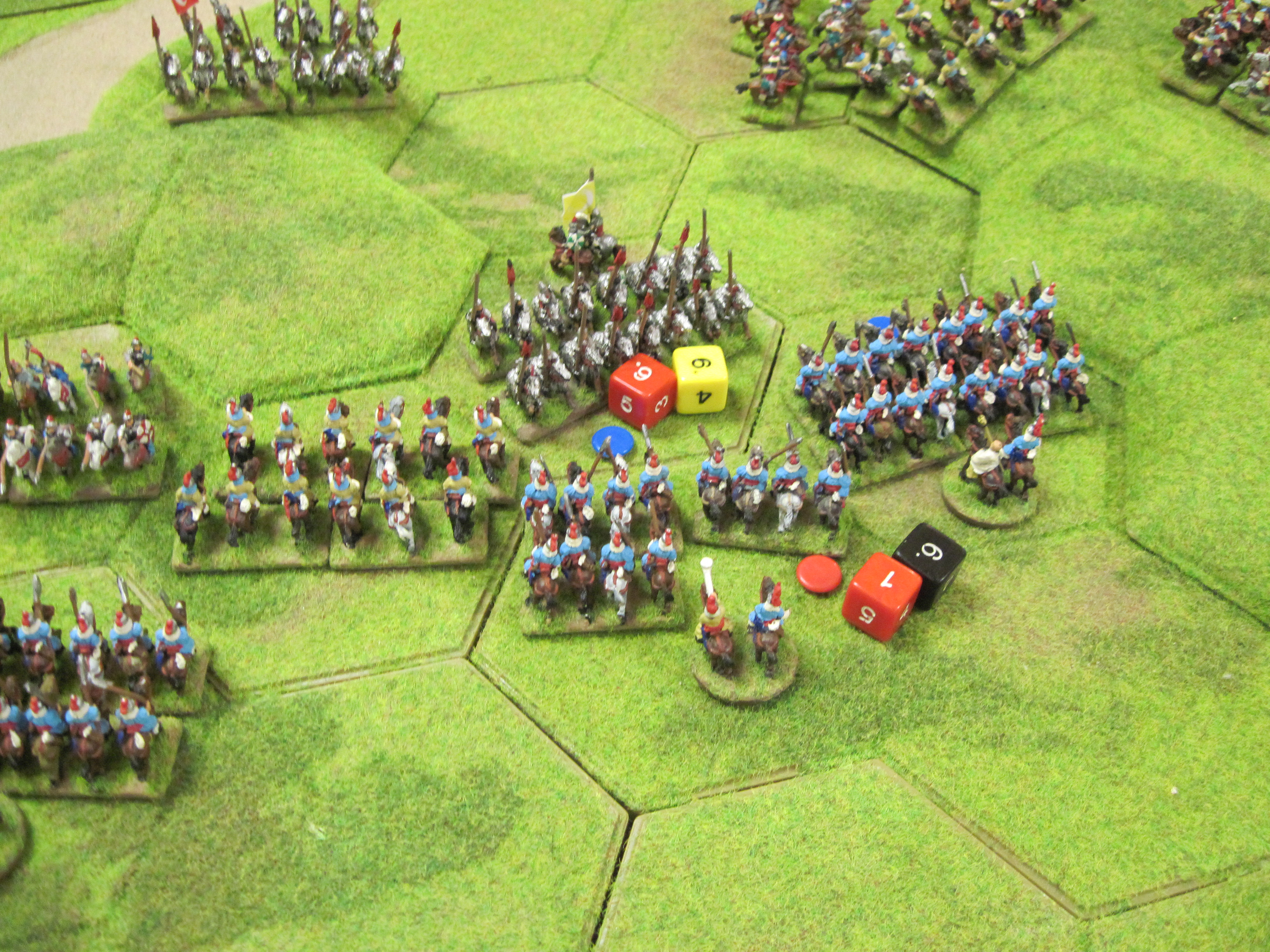 A shooting match between the Korean light cavalry units and the Ottoman Sipahis and Akinci cavalry. Tim’s infantry advanced in support of the cavalry in the centre while his artillery on the 8 hex hill opened fire on the Ottoman artillery in a long range artillery duel. There was a large gap between Chris’s Korean infantry and the slowly advancing Janissaries, and this bought us time for the Korean cavalry to try and defeat the Ottoman cavalry before the Janissaries could get involved in the action.