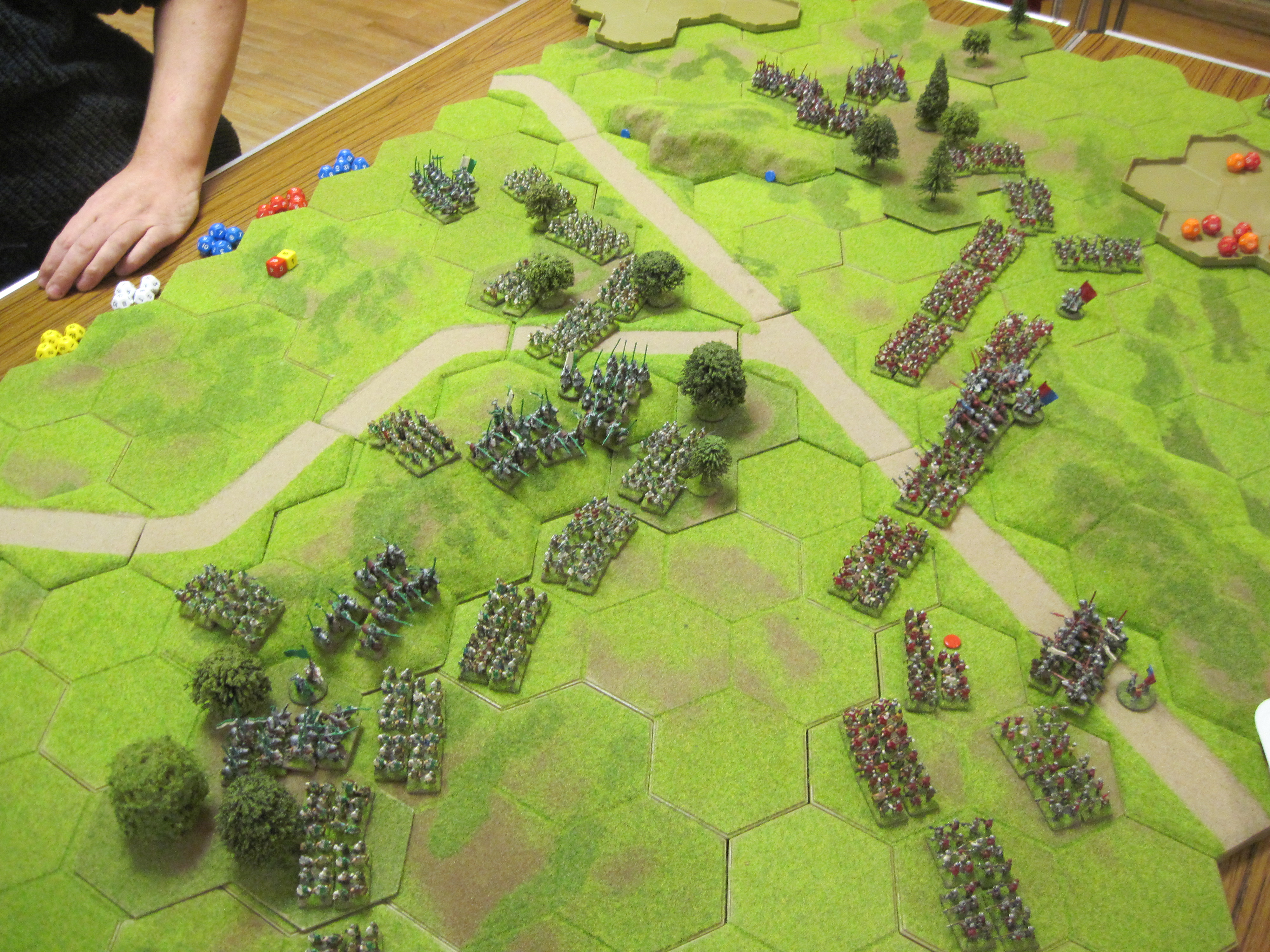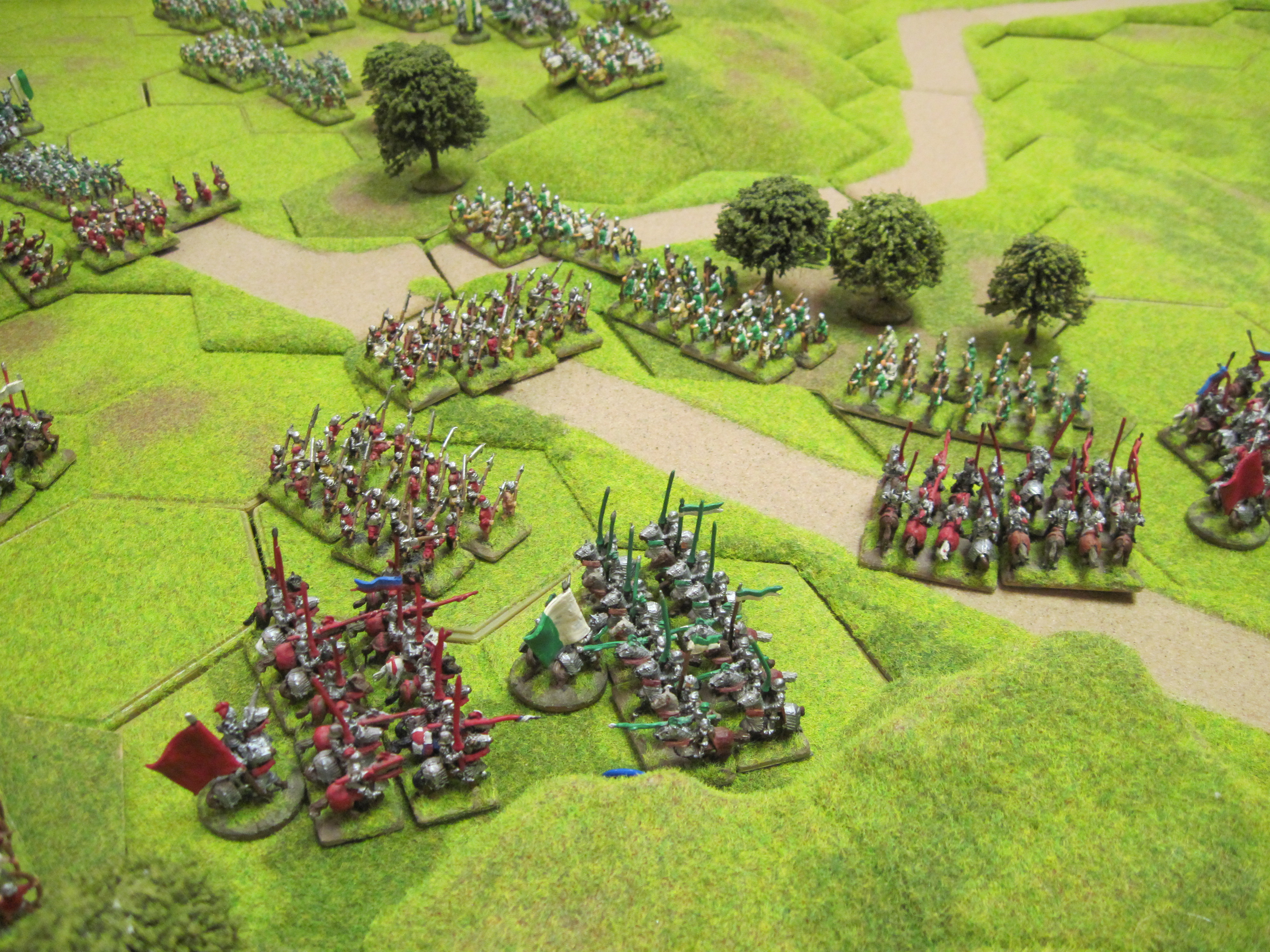 In recent Tuesday club nights we have run a number of games specifically designed to give new or less experienced Hordes & Heroes players the opportunity to gain greater understanding of how various different strategies and tactics can be used in the H&H system. We chose the War of The Roses armies because we have the models available to build identical armies in 4 different colour variations; red, blue, green/white and red/blue. Also, the different types of units employed in WOTR armies provide for a good introduction to the most effective use of specific unit types and the important interaction of these units with different terrain features.