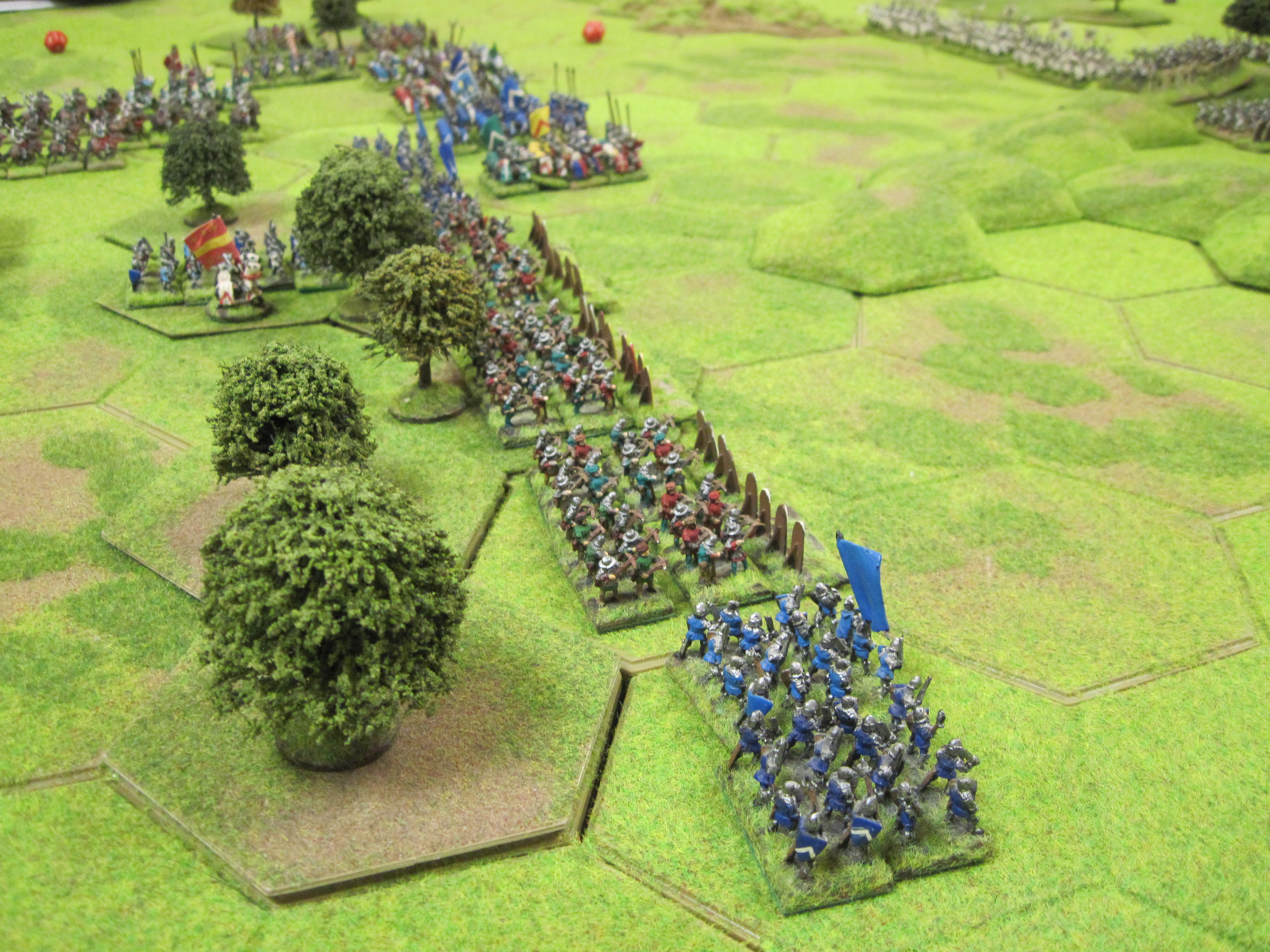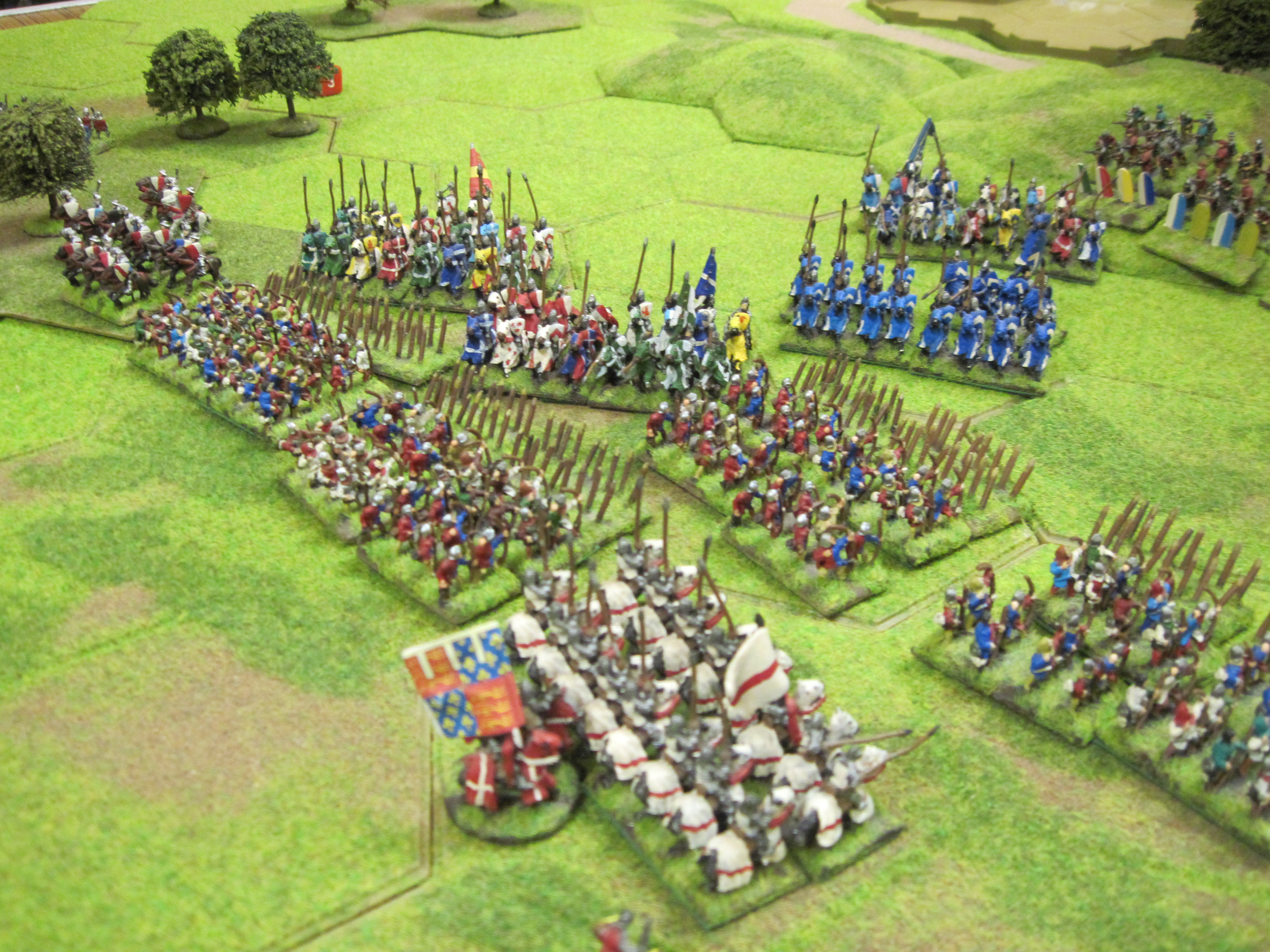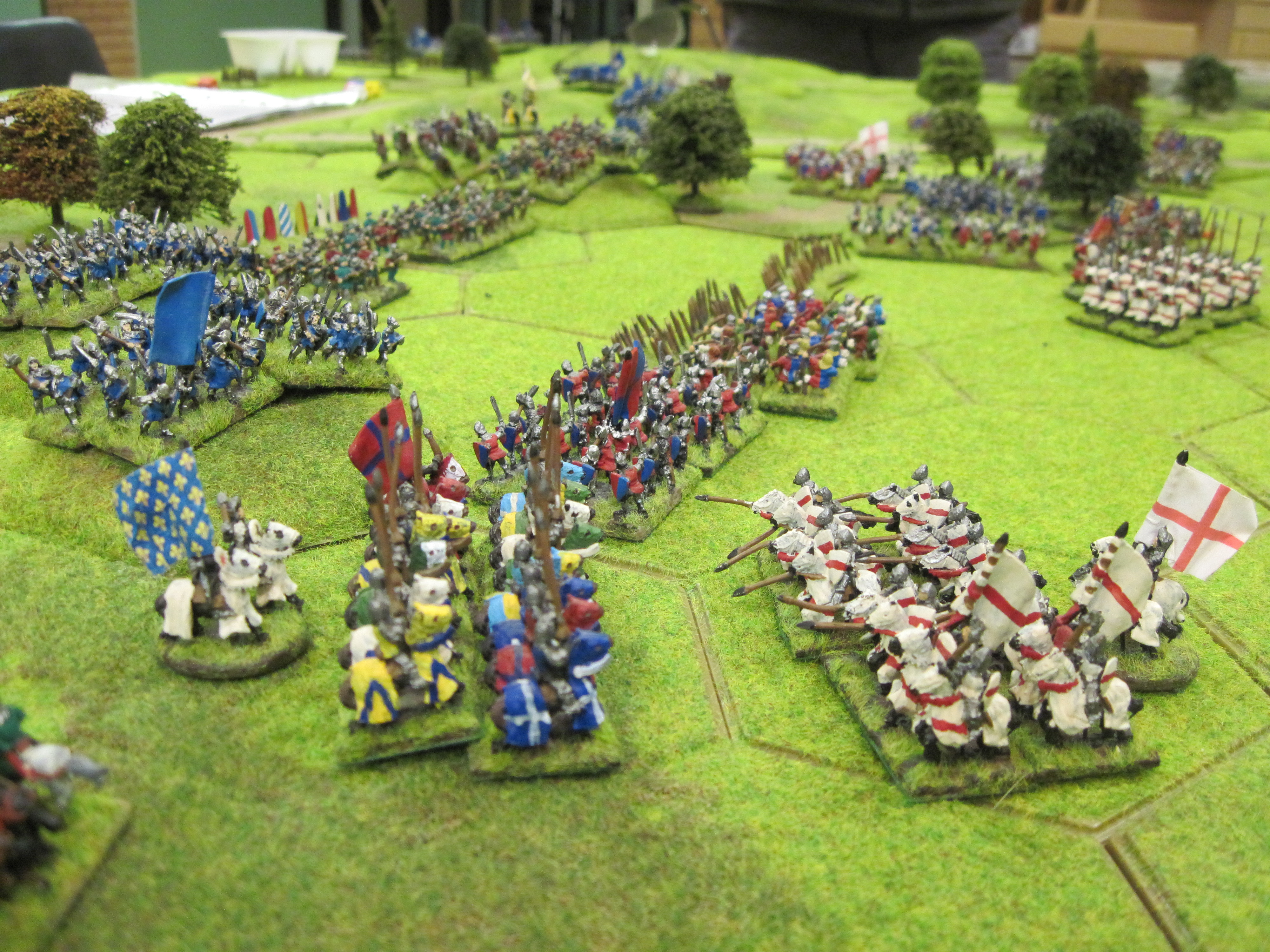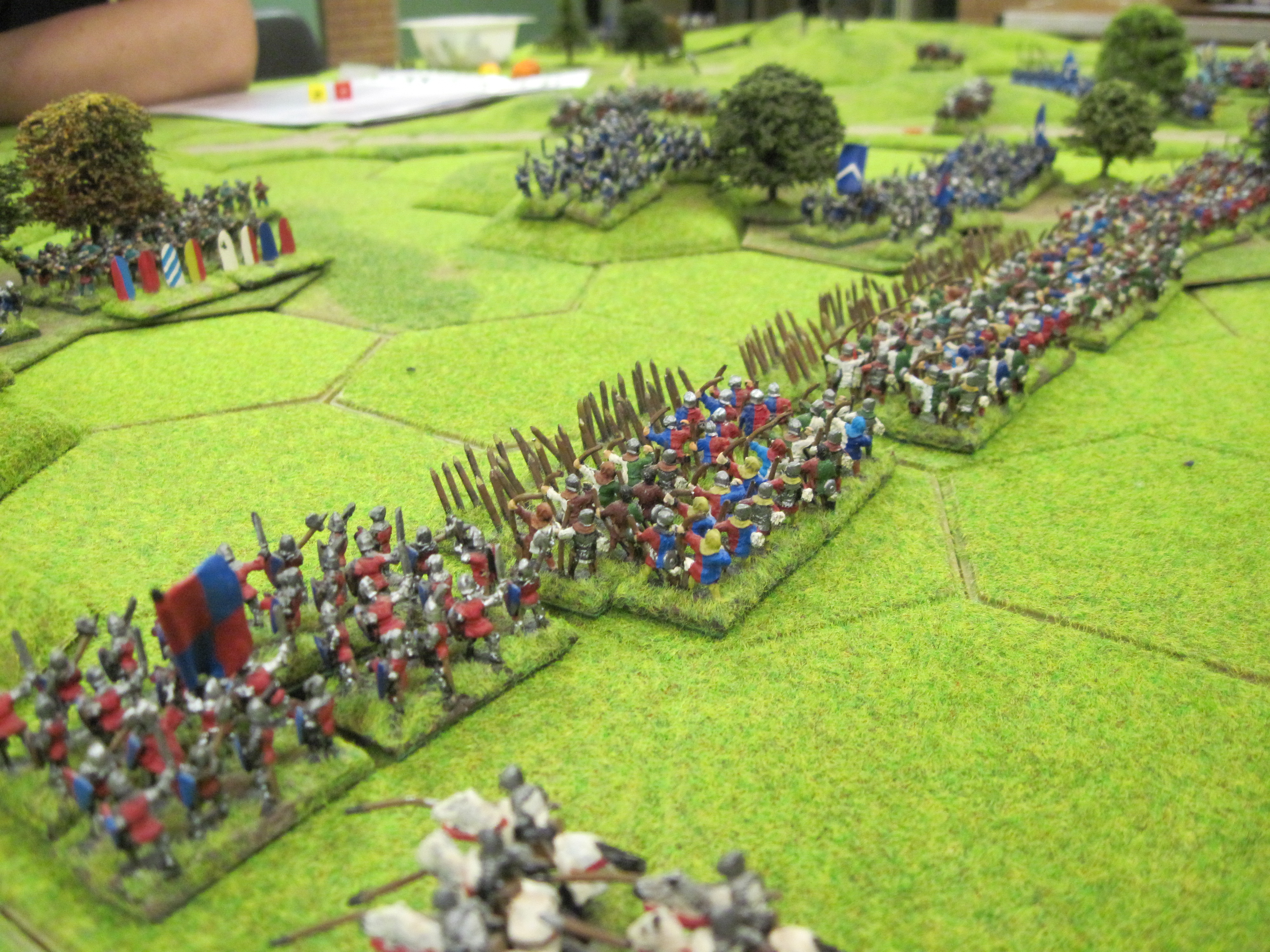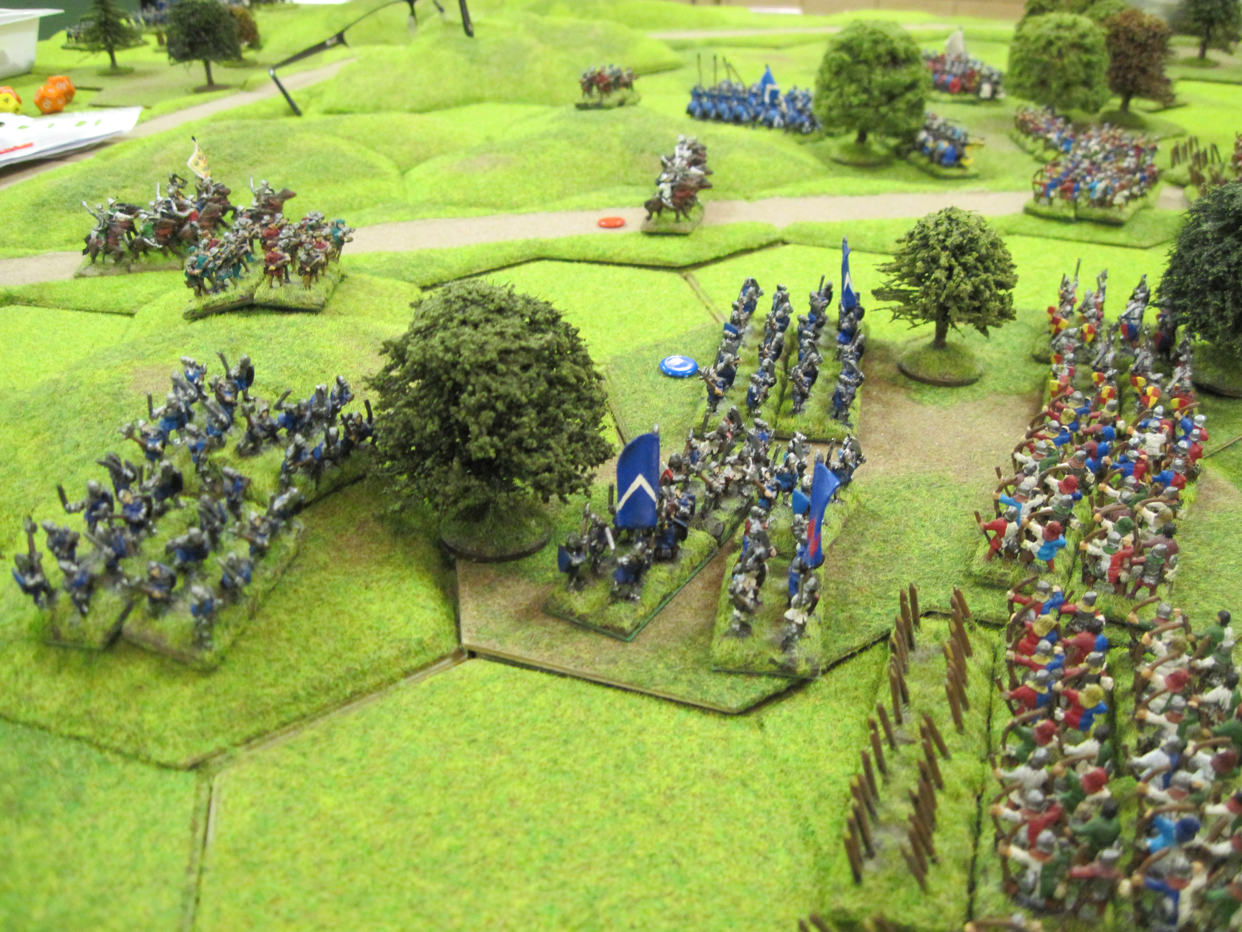 Chris and Steve won the di roll for choice of table edge and deployed their English longbow army across the width of the table making good use of the woodland areas to augment their strong defensive position. With the longbow deployed and ready behind their planted stakes they waited for Tony’s French onslaught to begin. With the English holding such a strong position Tony started his assault with infantry attacking through the woodland. Unfortunately, initial success was greeted by a hail of arrows from the English longbow shooting with commendable accuracy.