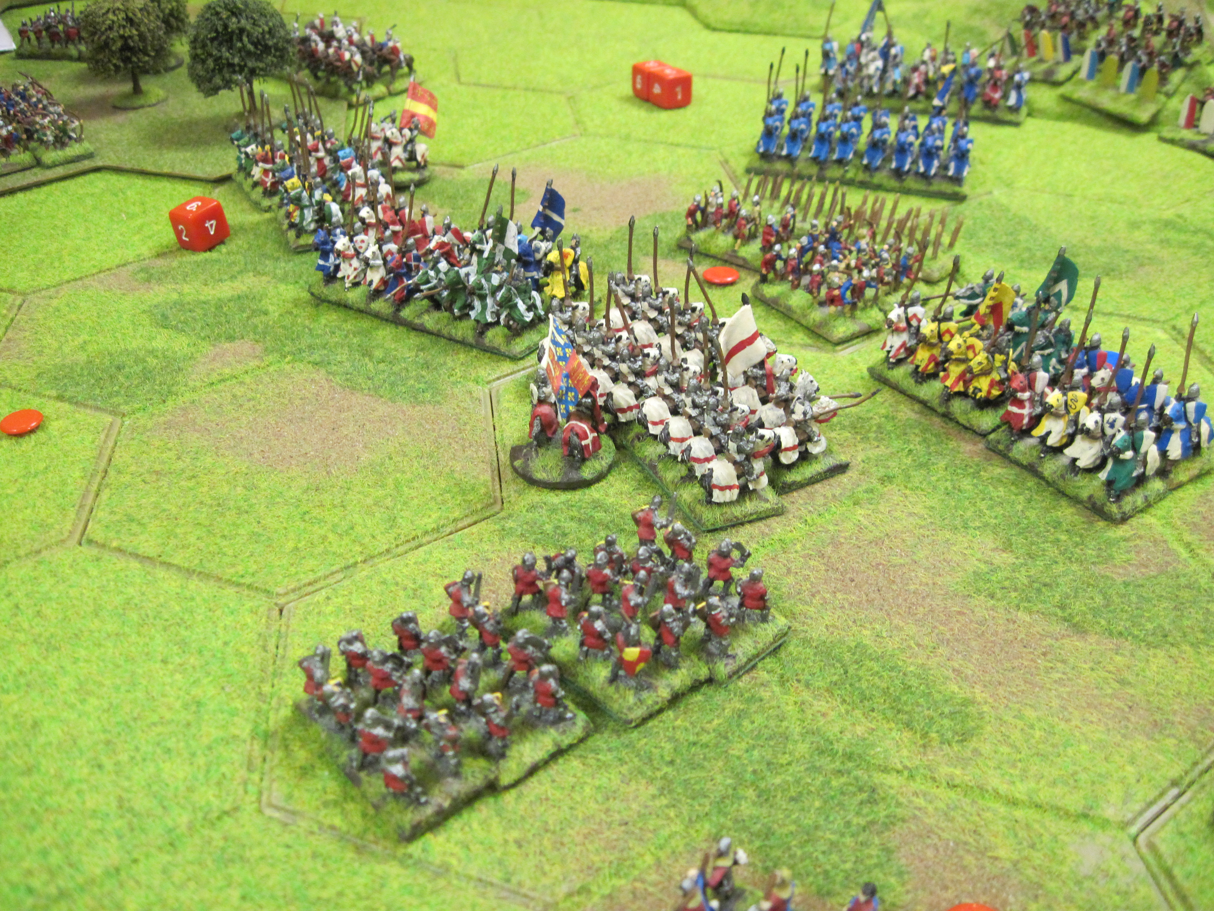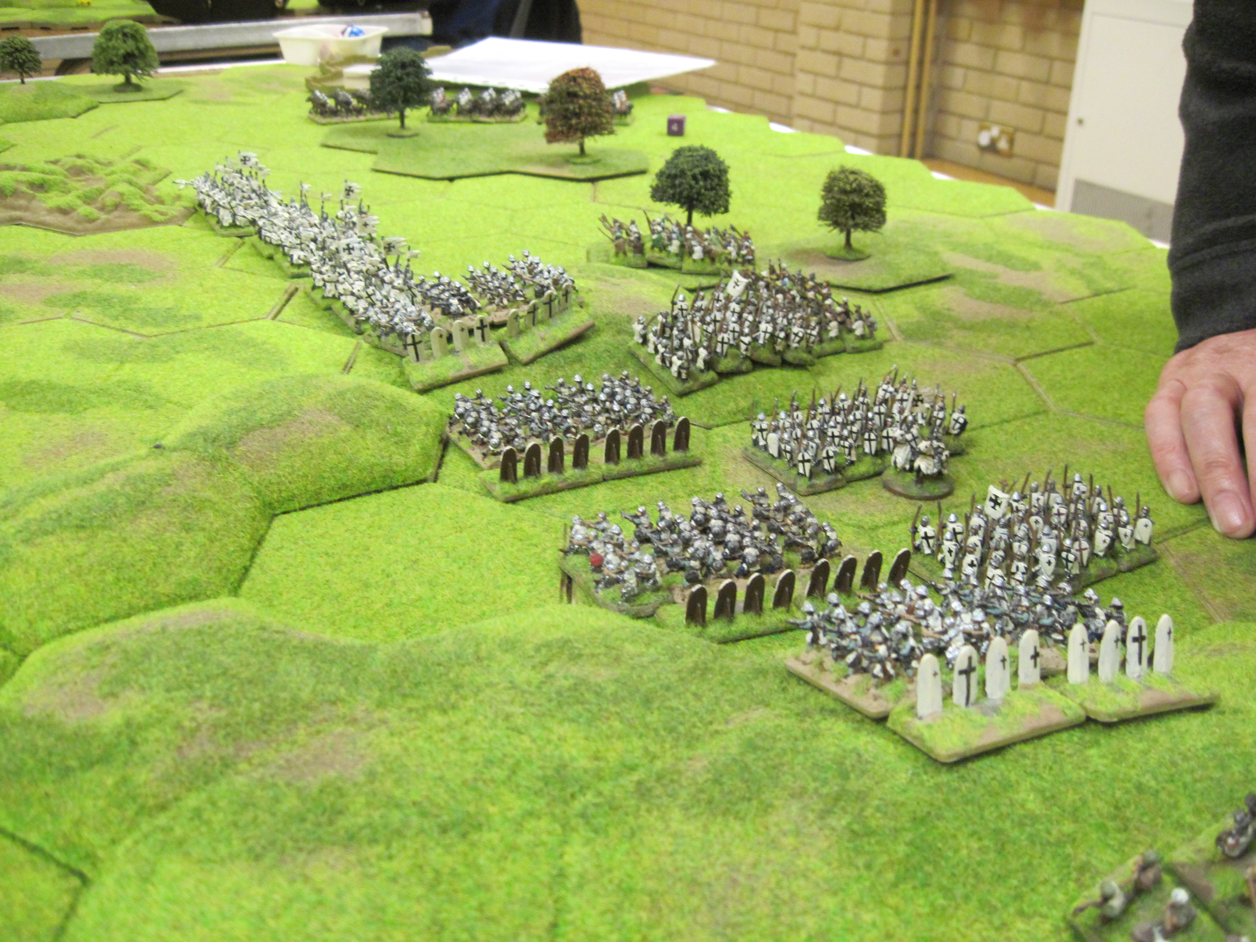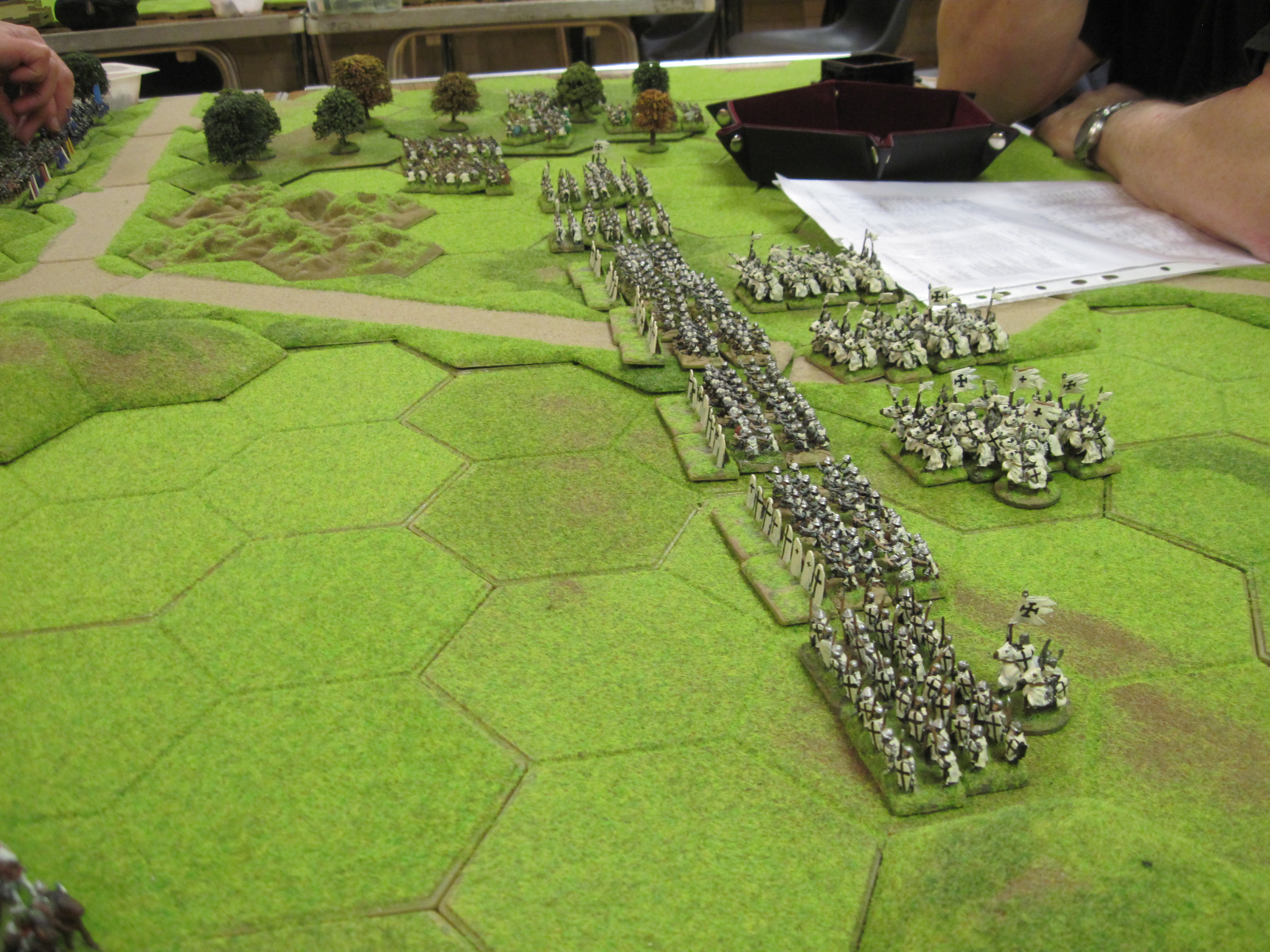Mike and I had the French and Dave the Teutonic Order and the French won the di roll for choice of table edge which gave us the table edge with the most terrain features. The Teutonic army had control of the central open area of the table in which the mobile Teutonic mounted crossbow units would have control. However, French infantry occupying a 3 hex wood gave much needed protection to the French knights deployed in the centre. Mike deployed the French crossbows in a line behind their pavisses on the right of our line facing the Teutonic crossbows.