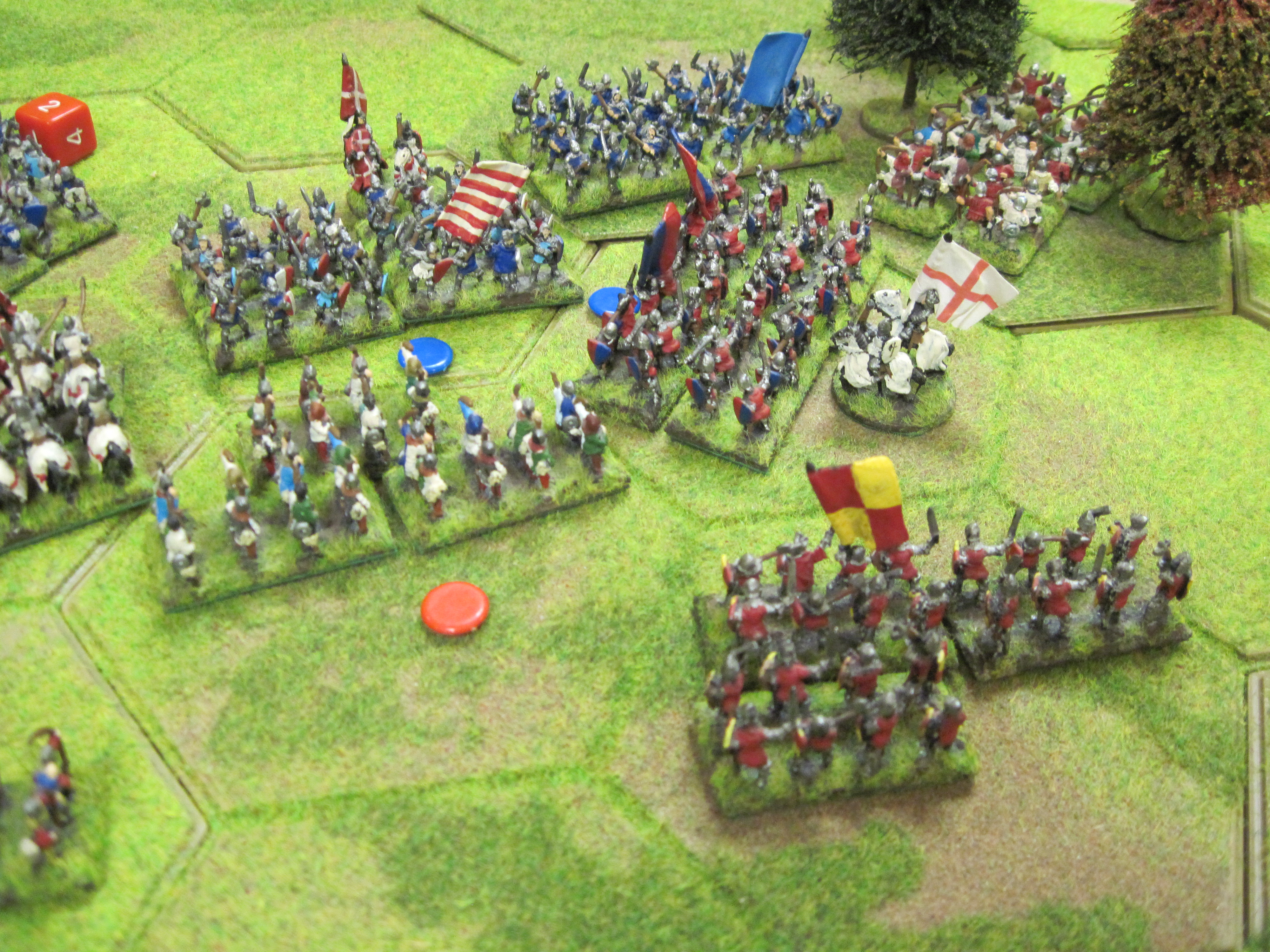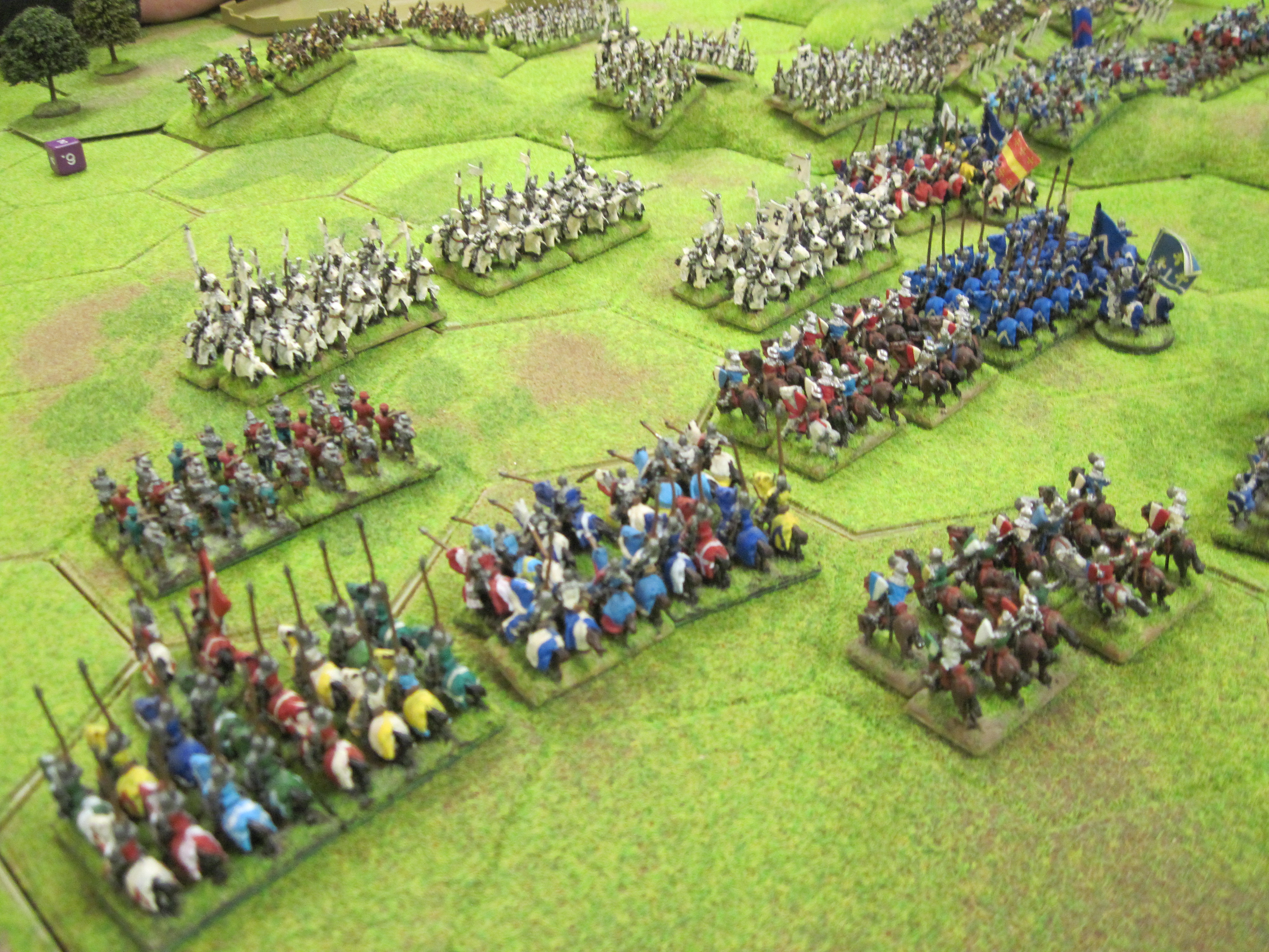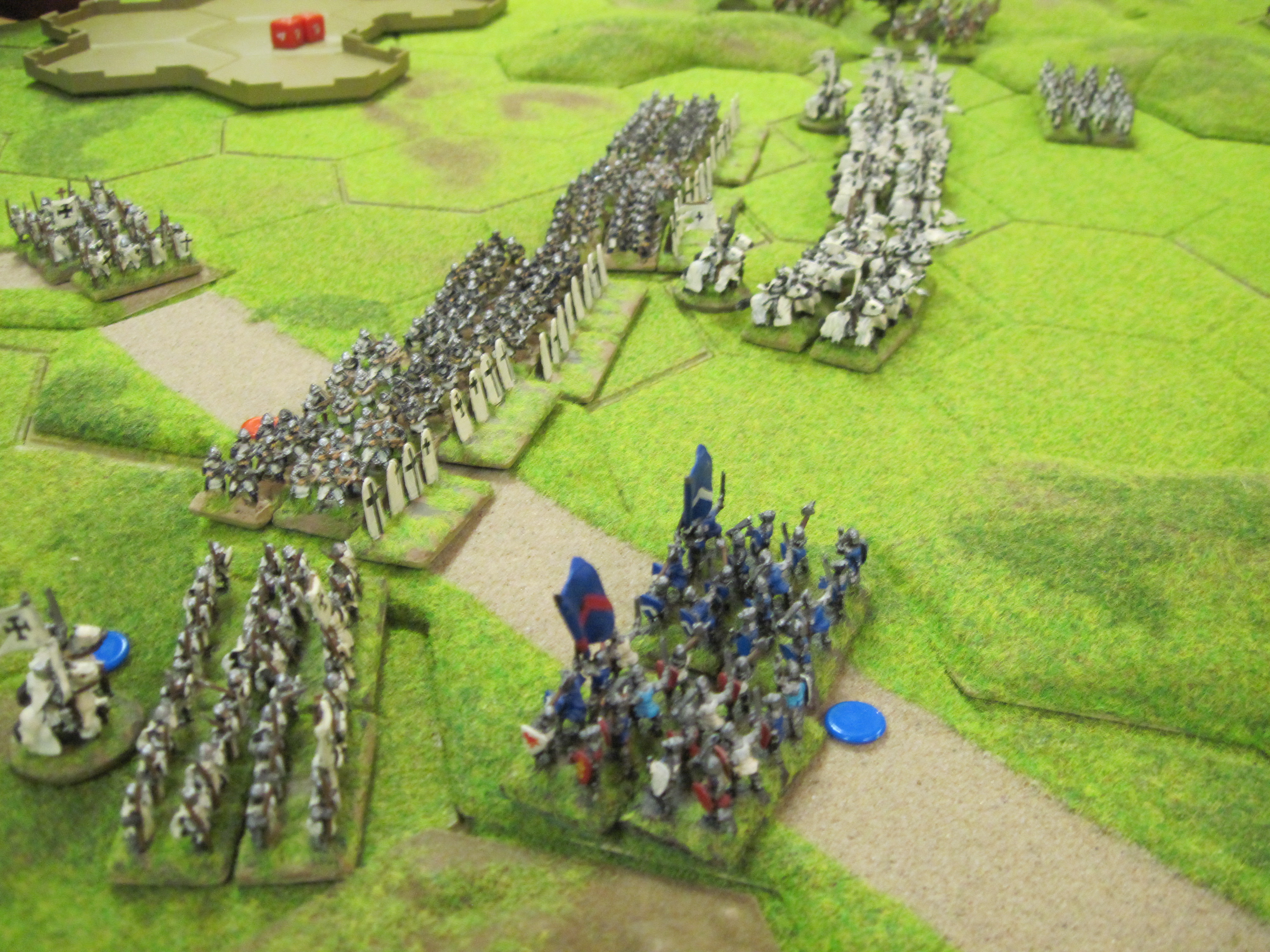 Mike and I had the French and Dave the Teutonic Order and the French won the di roll for choice of table edge which gave us the table edge with the most terrain features. The Teutonic army had control of the central open area of the table in which the mobile Teutonic mounted crossbow units would have control. However, French infantry occupying a 3 hex wood gave much needed protection to the French knights deployed in the centre. Mike deployed the French crossbows in a line behind their pavisses on the right of our line facing the Teutonic crossbows.