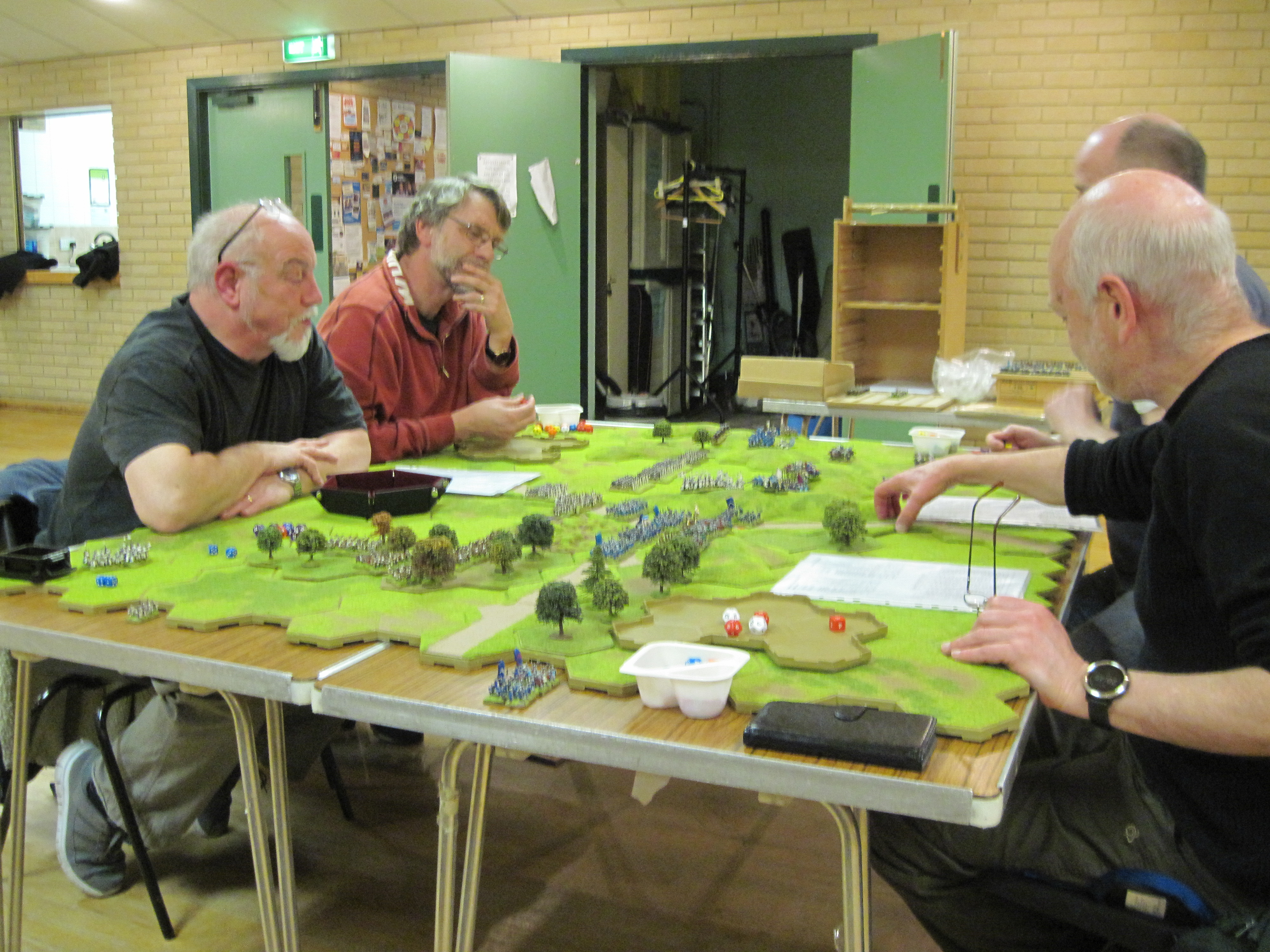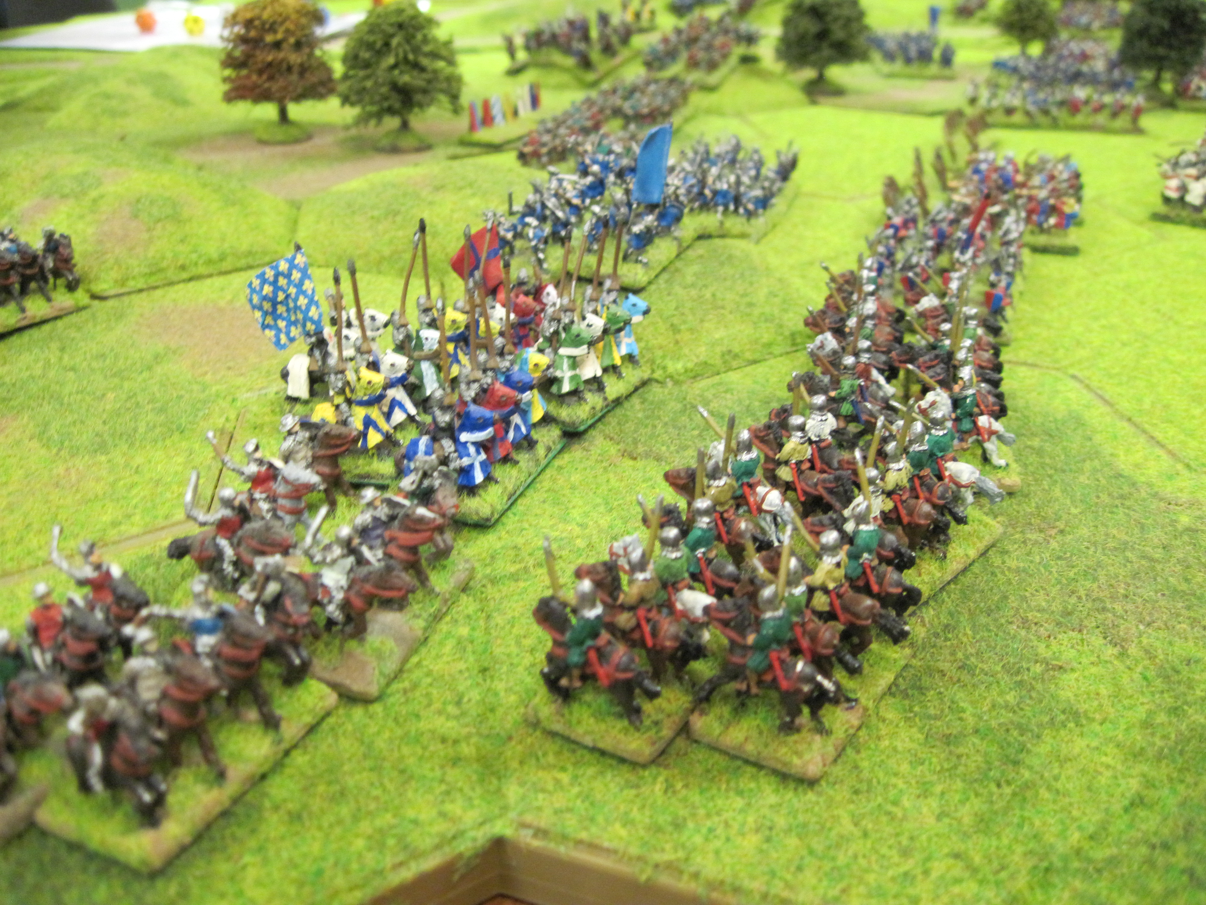 Tim and Steve (Teutonic Order), Mike and Chris (HYW French), deployed their armies centrally before gradually spreading to use the width of the table as both sides advanced and tried to outflank each other. As the crossbow units of both sides advanced to form a shooting line behind their pavisses there were opportunities for both sides to steal a victory with a heavy cavalry charge.