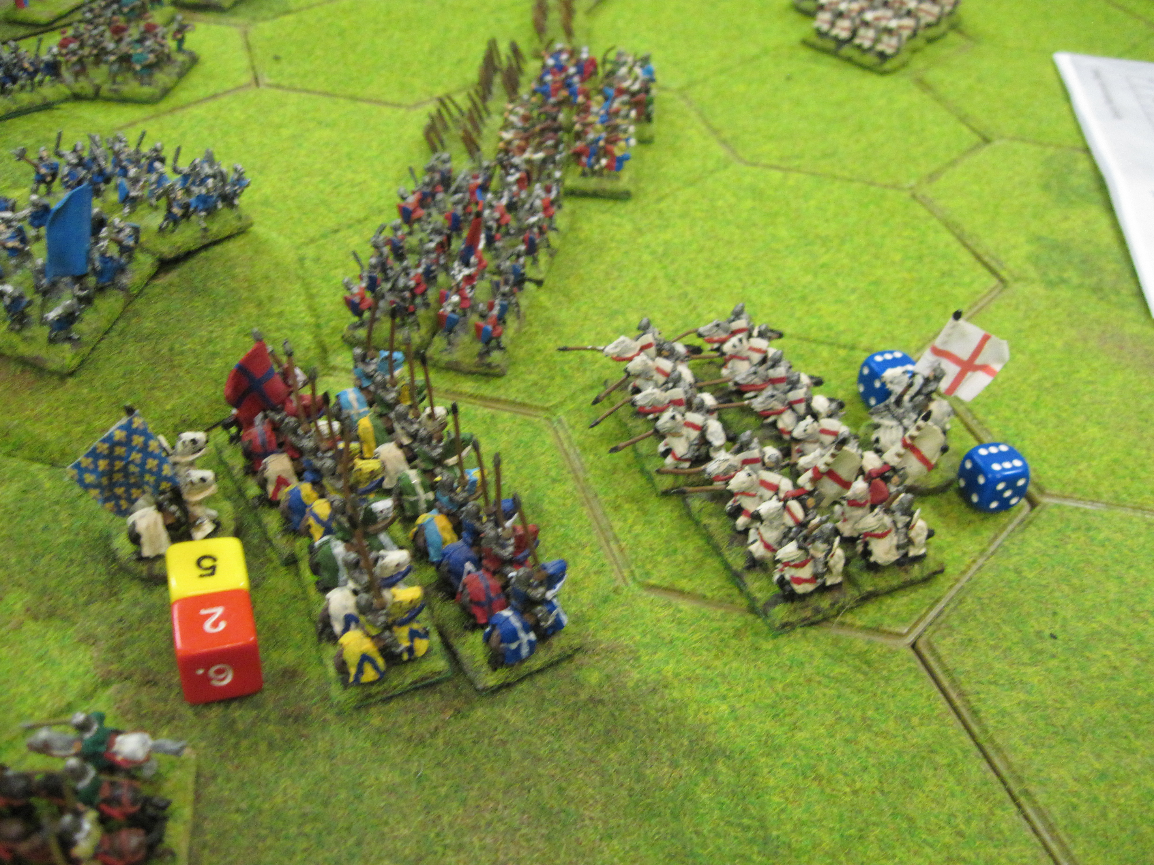 After an extended territorial battle over the woodland which saw significant infantry losses on both sides failed to secure possession for either side, Dave charged all the French heavy knights at the English longbow line. In response, Tony and I rolled probably the worst set of shooting dice I can remember for a long time. The result was that the French knights charged home and utterly demolished the line of English longbows and stakes! This should have been game over for the English, however the remaining English infantry and few cavalry units behind the woods to the left and right, attacked from both sides trapping the French knights into a salient. The knights lost the subsequent hand-to-hand combats through poor combat dice, had nowhere to flee or recoil and were eliminated.