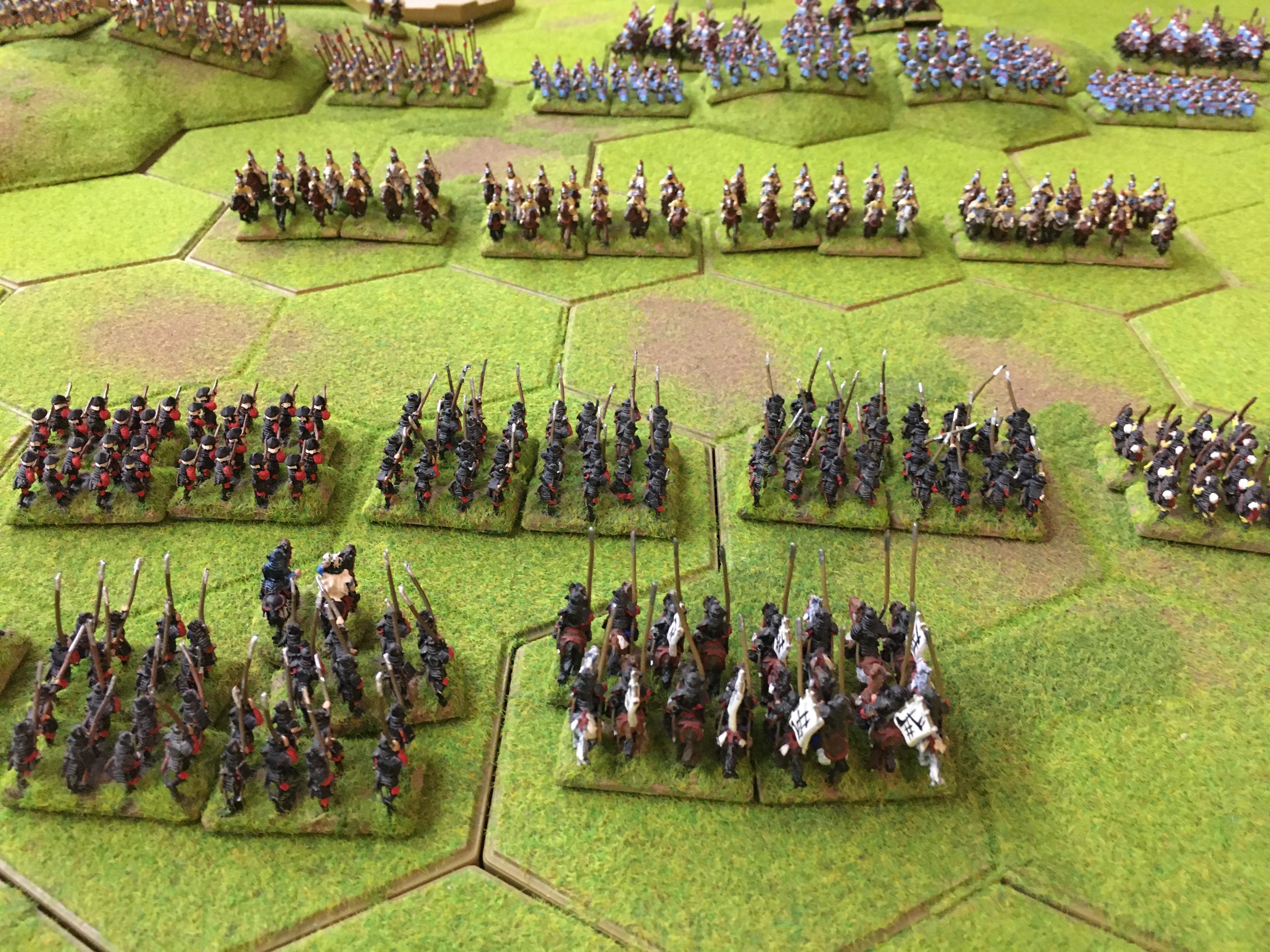 Alex also halted his line and then sent 5 units of mounted Samurai towards the ‘North end’ or my left wing to circumnavigate around the aforementioned 4 hex wood. This was a clear attempt to get behind my left and rear and in response I had to switch my 3 units of heavy cavalry and a unit of spearmen to plug the gap between the wood and my table edge.
