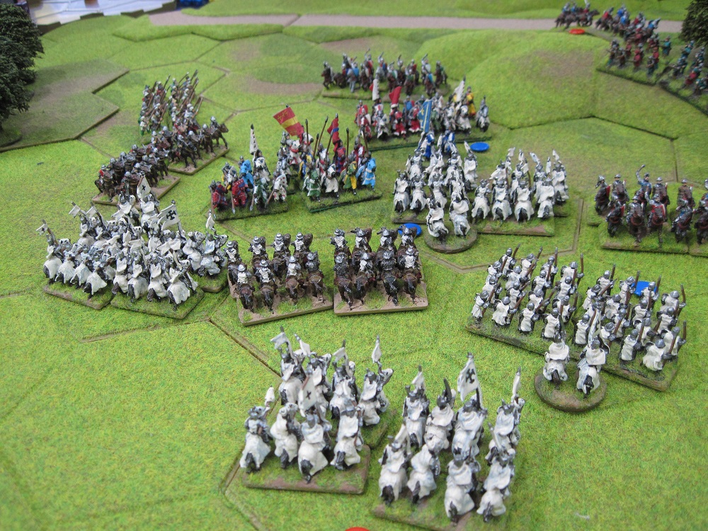 Tim’s decision to pull back his left wing in the face of the advancing French cavalry had the effect of stretching the French battle line which became divided in two by the 4 hex wood half way along. The Teutonic order was as a result able to defeat one half of the French force, with a little help from my poor dice rolls, before the concentrating on the destruction of the other half.