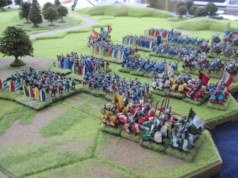 Tony, won the di roll for first move and he quickly advanced to take possession of the 2 areas of woodland between which he deployed his 5 units of French crossbow with pavisses to the fore! He concentrated 7 of his 8 units of cavalry on his right wing along with 2 of his 3 generals. In response, Tim matched up his 4 units of crossbow with Tony’s, again with pavisses in front. Behind these he created a mixed line of Teutonic spears knights and 2 units of mounted crossbow. However, more significantly his line of crossbow was extended using 5 units of peasant militia which created a sacrificial block against any potential French massed cavalry charge.