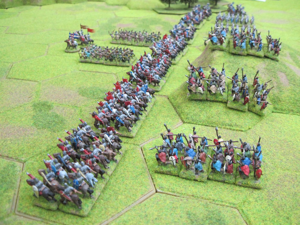 Tim and I deployed our cavalry to the fore with our infantry behind and our armoured spearmen centrally. In order to use our greater mobility our Norman cavalry was positioned to attack the right wing of the British line where all 4 of their cavalry units were positioned. Tony had moved a unit of ballista onto the escarpment from where it could shoot at our right wing and our cavalry would be unable to climb the steep slope and attack it.