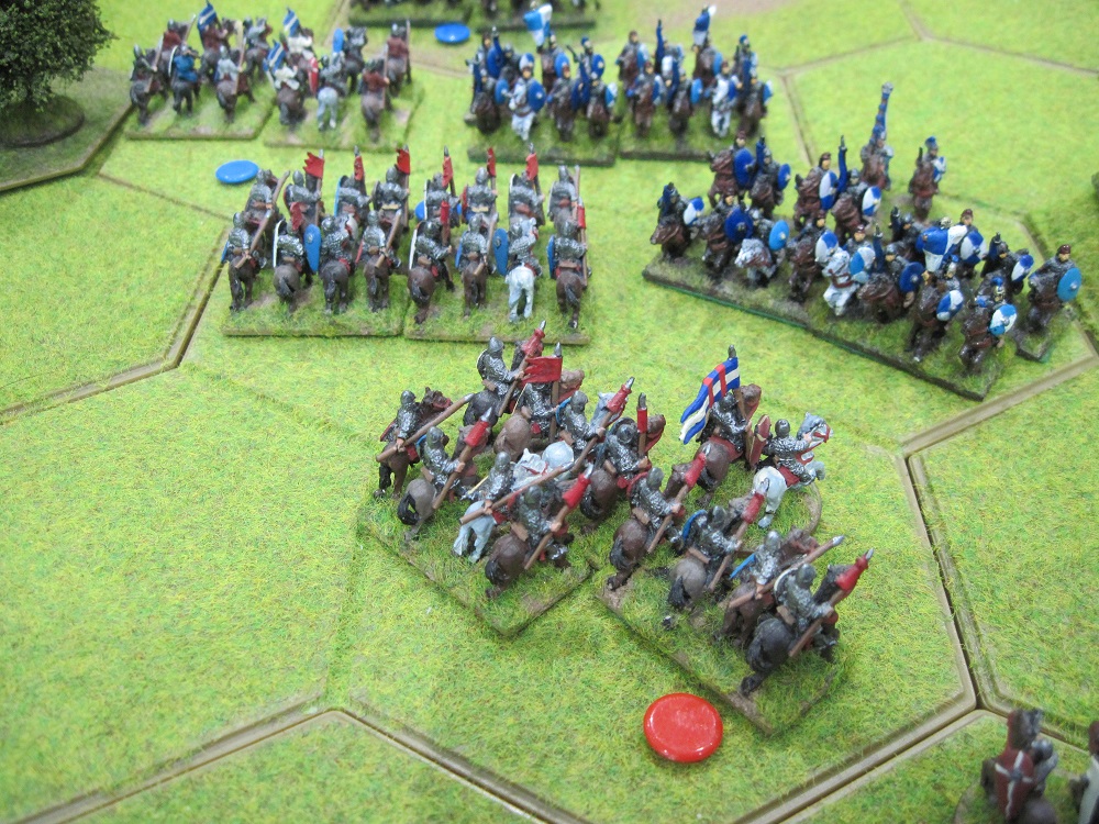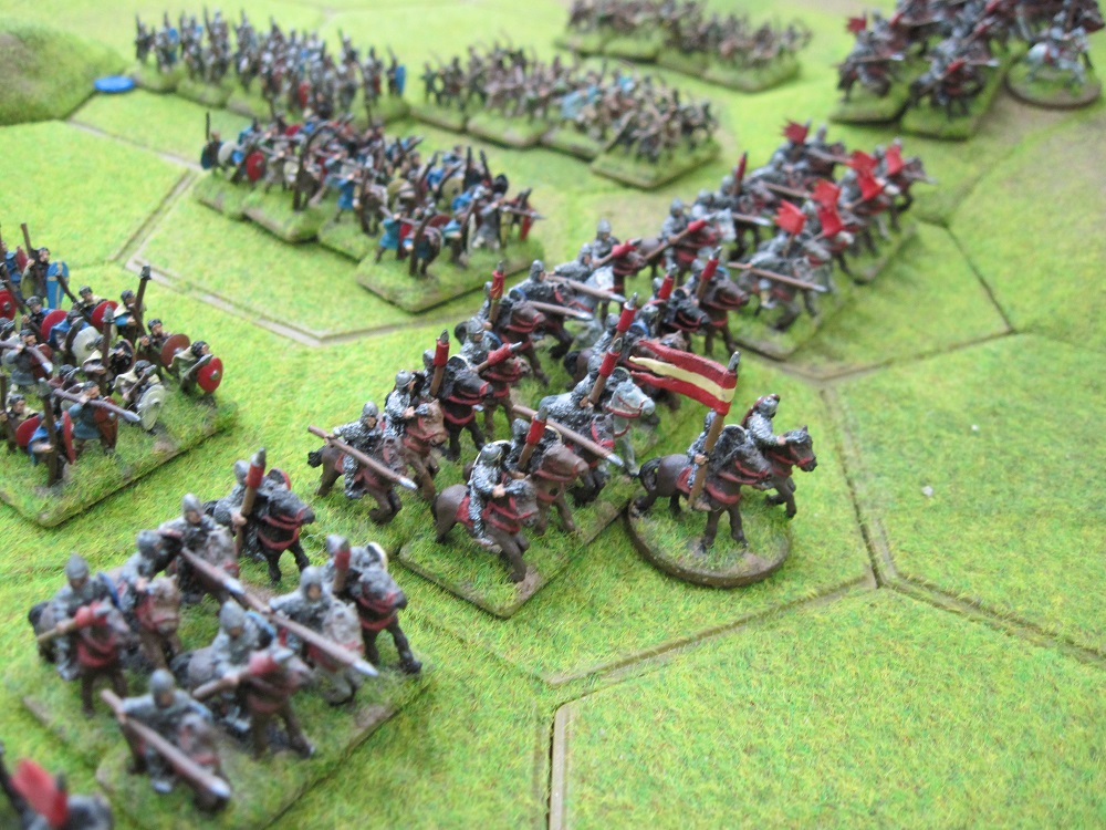 As we advanced our massed Norman cavalry against the British cavalry they simply pulled back leaving British archers and spear units to defend the 4 hex hill which was now exposed. Tim and I debated the idea of a quick cavalry charge. Tim quite rightly pointed out that this would leave our infantry to far back to support the cavalry and so we delayed our attack unit our infantry line could be advanced further.