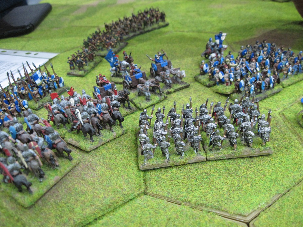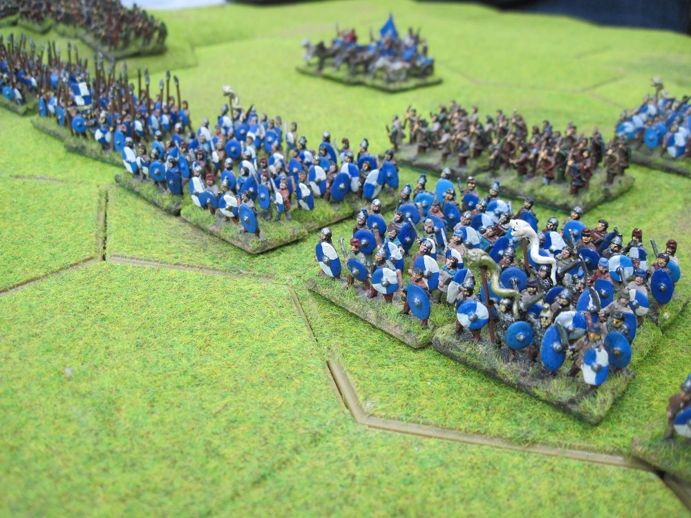 Tony and Chris deployed first and stretched their battle line from the base of the 8 hex escarpment right across to the woodland area on the other side of the table. They condensed their six British warrior hordes into 6 stand units and still had just enough units to form a complete unbroken line.