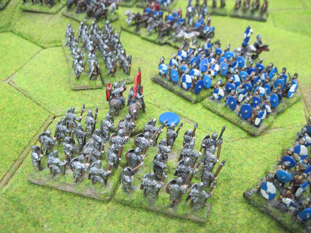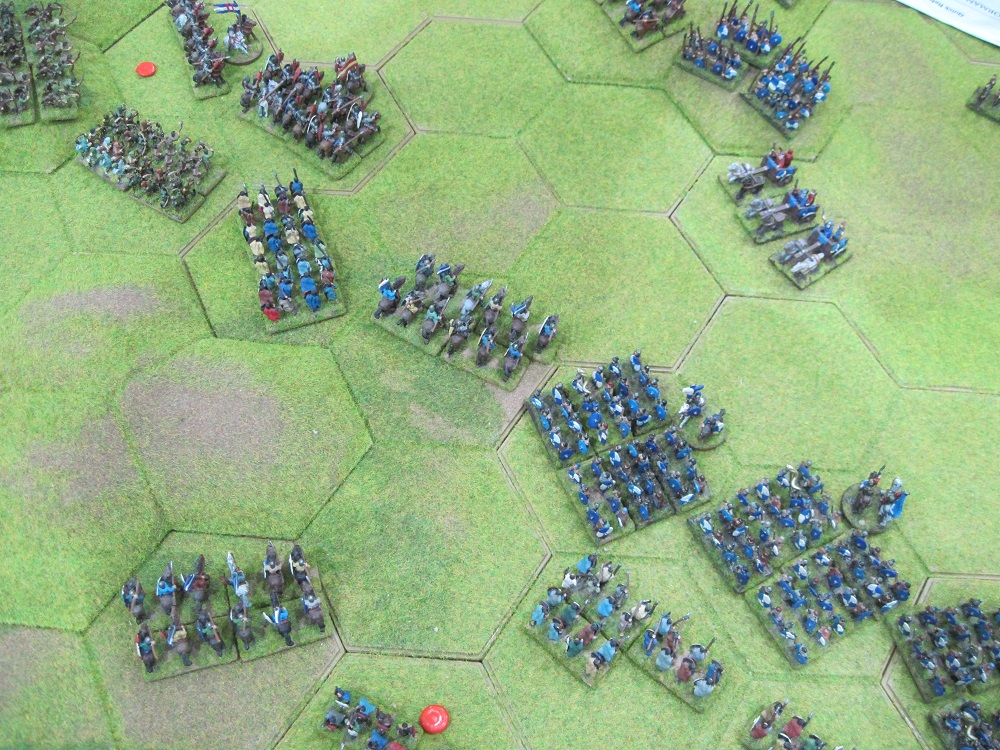 With no out-flanking option available to our cavalry we placed 2 of our three generals with ‘B’ class armoured cavalry units and charged straight at the British left wing – a high risk do or die move! All would have been OK but with some excellent shooting Chris managed to recoil a general and his unit which broke up the attack, and in the hand-to-hand combat phase the British line halted the charge and more significantly stubbornly defended the 4 hex hill. This bastion defended now by British spear units quickly became our undoing as we next sent our infantry against it only to see them recoiled.
