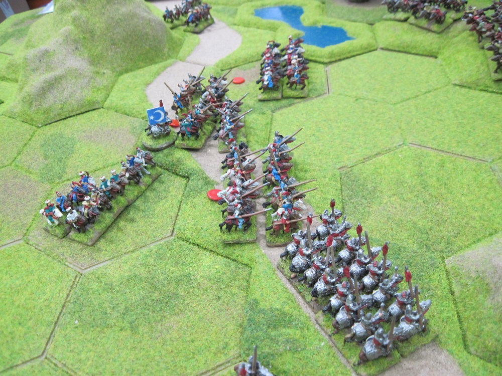 The two main battle lines remained within easy charge range of each other but outside shooting range while the prolonged struggle on the right of Tony’s line continued without any indication that a resolution could be reached. Tony moved his 3 heavy units into position to charge along the road between the ‘blocking’ hill hexes but then stopped. The stalemate then continued until Tim decided to advance his entire bow line into shooting range. In response Tony charged his Mongol heavy cavalry through the hilly gap and into hand-to-hand combat with the Ottoman Qapakulu heavy units.