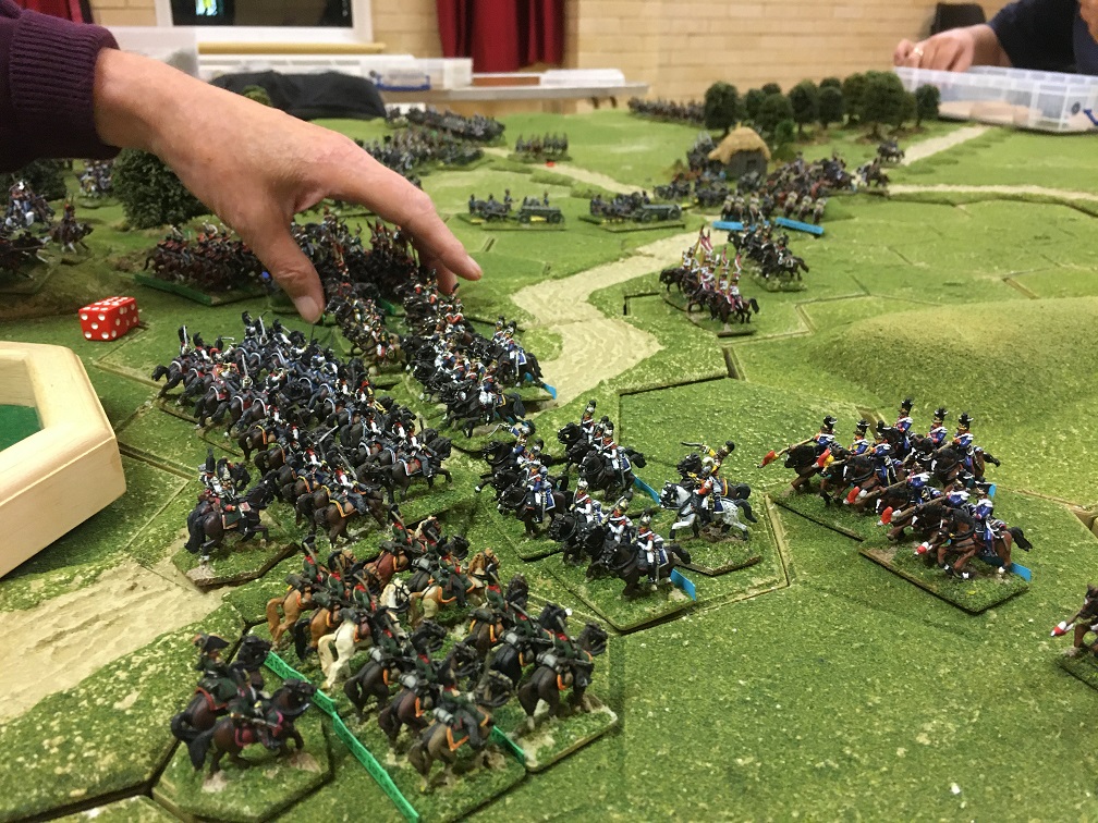 Russian guard cavalry appeared on the right of the table and the French cuirassiers and heavy dragoons formed a line ready to charge these new opponents. This would be the final and deciding action of the game as the 2 largest opposing cavalry forces smashed into each other. The combat dice definitely favoured the Russians, and the French were forced to withdraw. The game ended with the village securely defended by French infantry and artillery, the cavalry stand-off on the left and the French holding in the centre and loosing on the right. If more time was available, the game could still have swung either way!