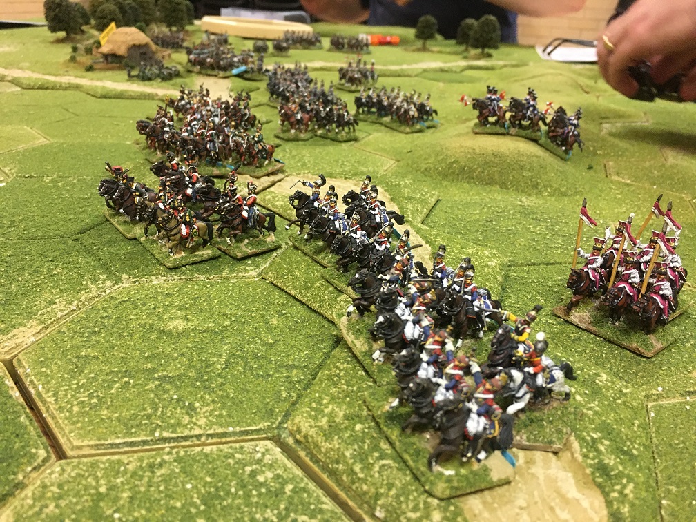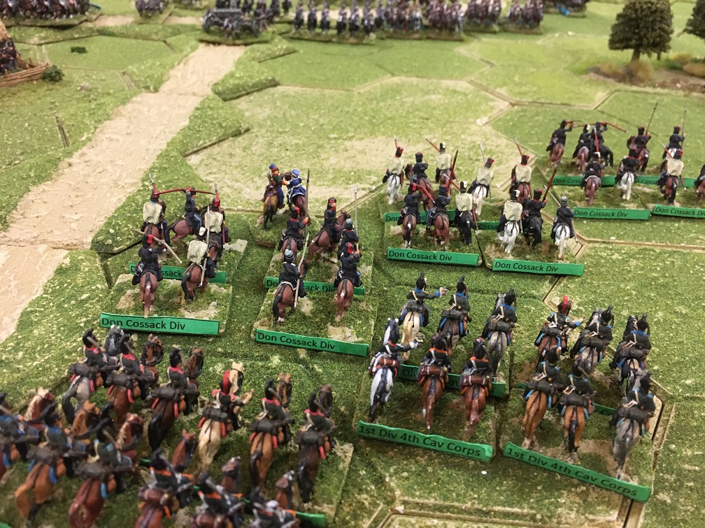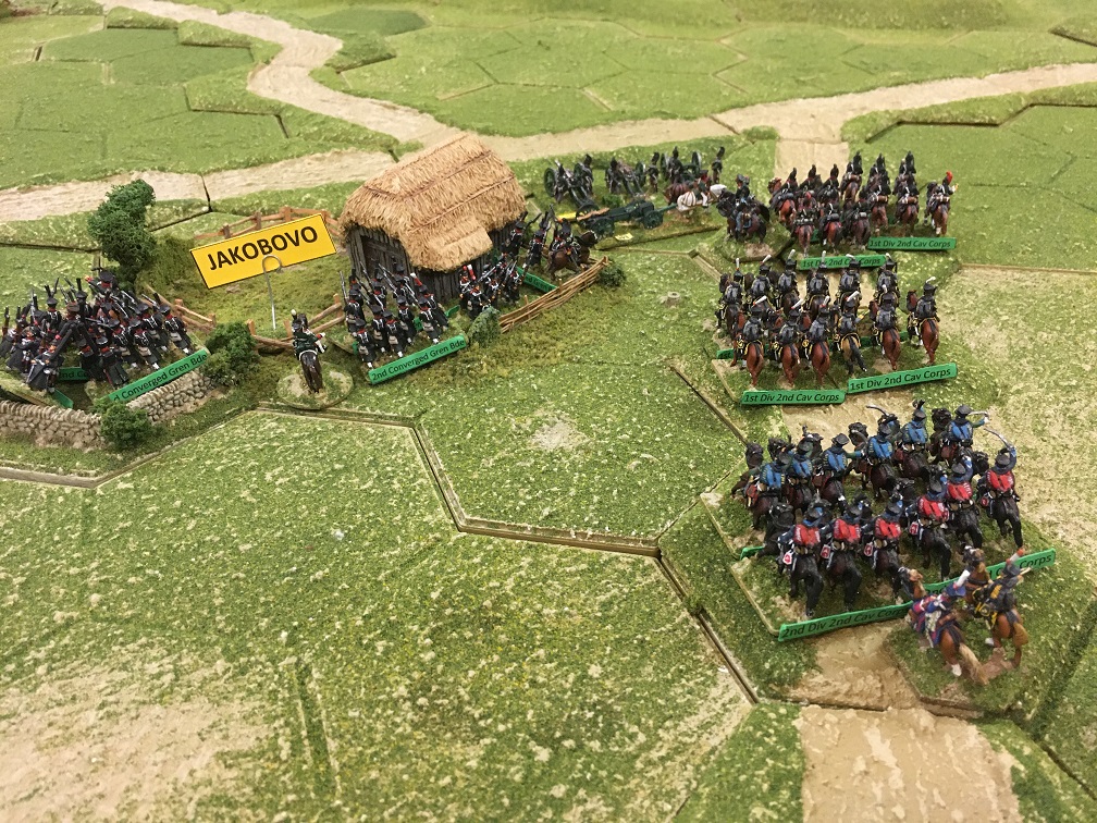 Another large force of French cavalry appeared, this time with heavy dragoons and cuirassiers. They needed some substantial opposition, which arrived in the form of Russian heavy cavalry units advancing along the road towards the village which was now firmly in French hands.