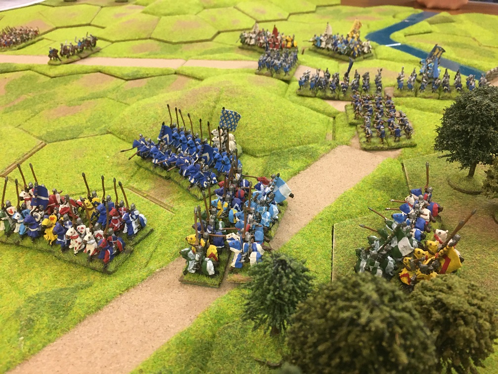 Chris was given the challenging task of racing to prevent Tim’s French crossing the bridge. He had 2 units of mounted men-at-arms (knights), 4 units of mounted sergeants and a general with which at maximum speed he managed to reach a small 3 hex hill overlooking the bridge but not block the bridge. As an aside, I remember thinking at this point that enlarging the game might just make the French mission somewhat easier!