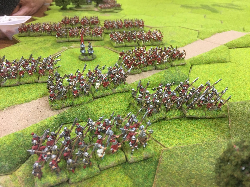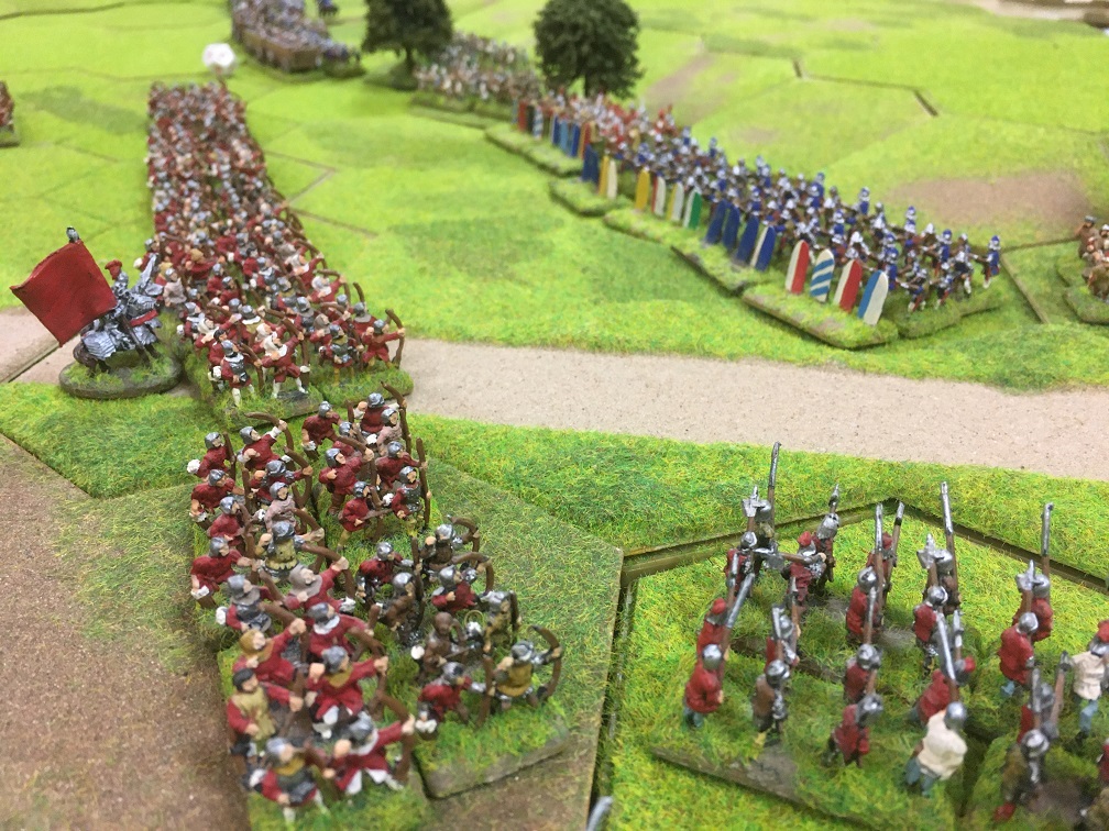 The victorious Yorkist cavalry gathered in the centre of the table to deliver another charge, this time, aimed at the Hungarian infantry line in the centre. The Yorkist longbow engaged the Hungarian crossbow units in a shooting match and the line started to buckle. It was no surprise that when the Yorkist cavalry finally charged home the Hungarian infantry line defending the slope was soon broken delivering a Yorkist victory.