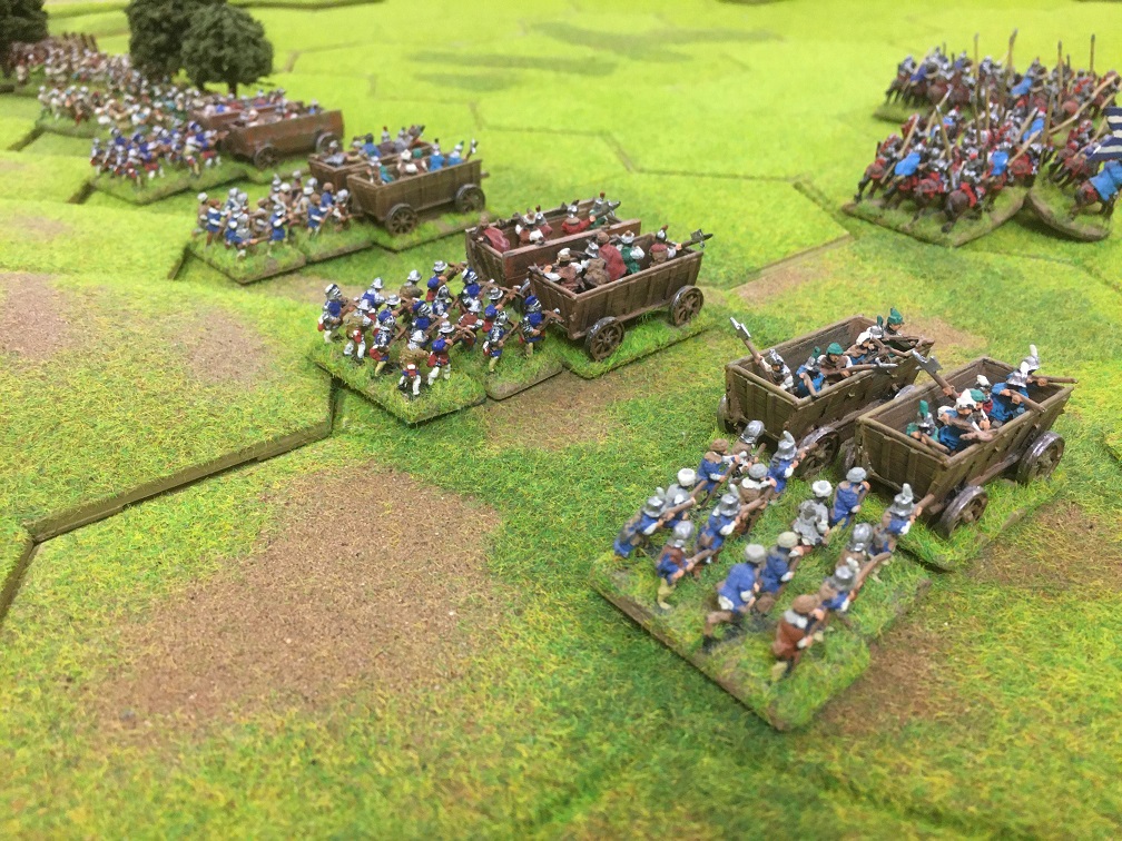 Opening moves saw the 2 armies close on each other in the open centre of the battlefield with the Hungarians using their cavalry to steal ground quickly with the war wagons following up behind. Rather than match this rapid advance, Tony held back his Yorkist heavy cavalry to the line of woods. Dave advanced his Yorkist longbow forward in the centre and right wing. Six of the longbow units had stakes to plant and formed a line of planted stakes to defend against any Hungarian cavalry charge.