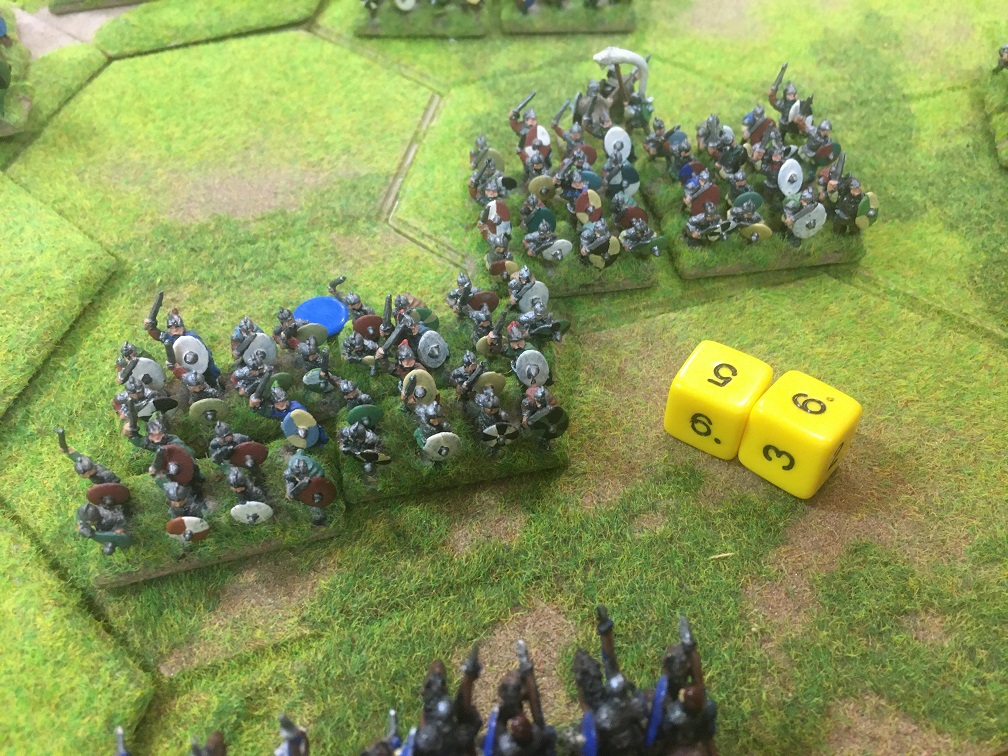 The hand-to-hand combat along the whole line soon pointed the way to a game conclusion within the time available – the units were disappearing rapidly into the casualty trays! Tim’s cavalry now fully committed found themselves on the receiving end of some punishing dice rolls, and as a result were swamped by the much greater number of Saxon infantry piling into the second round of combat. My infantry didn’t perform much better and without the support of the timely arrival of the chariot unit would have been pushed back over the 8 hex hill.