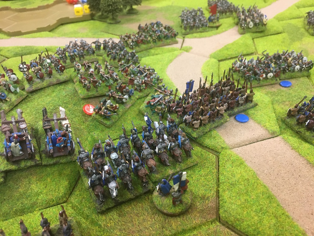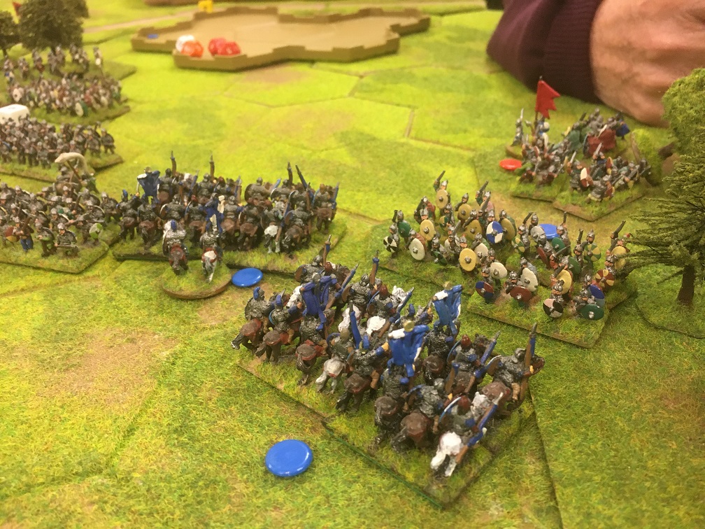 Opening moves saw Tony quickly advance his Saxon hordes to gain control of the 3 hex wood on the extreme right of his line. Tim moved his cavalry quickly on a flanking move against Dave’s select fyrd on the other wing. Chris concentrated his missile infantry supported by the ballista unit in the centre.