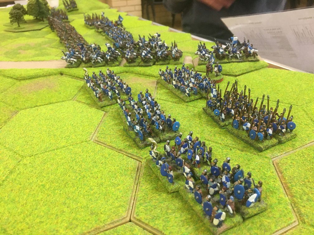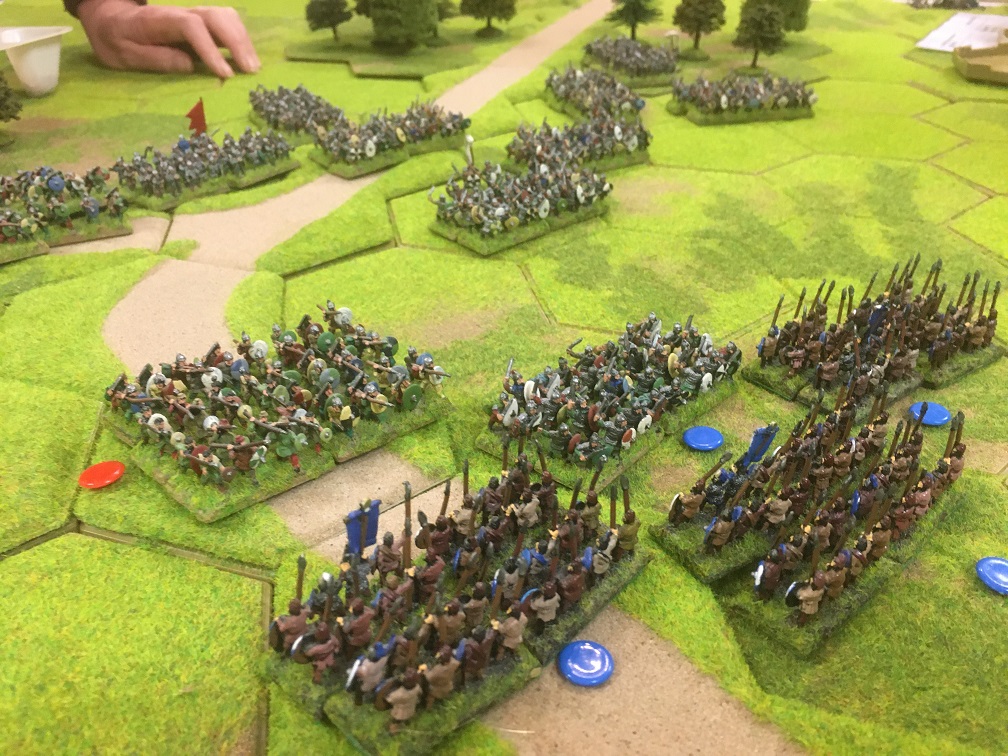 The Saxon v Romano British games are usually a close affair. The key differences between the armies are the greater mobility of the Brits with their use of cavalry and chariots and slightly stronger infantry hordes, whereas, in comparison, the Saxons have ‘A’ class housecarl units and more ‘B’ class select fyrd infantry. Because the Saxons only fought on foot their command range was 2 hexes compared to the Brits 3, but the reduced command cost enabled the Saxons to field an extra general along with 25 fighting units compared to the Brits 19. The total cost including a Hero General for each side was, in theory, 256 points!