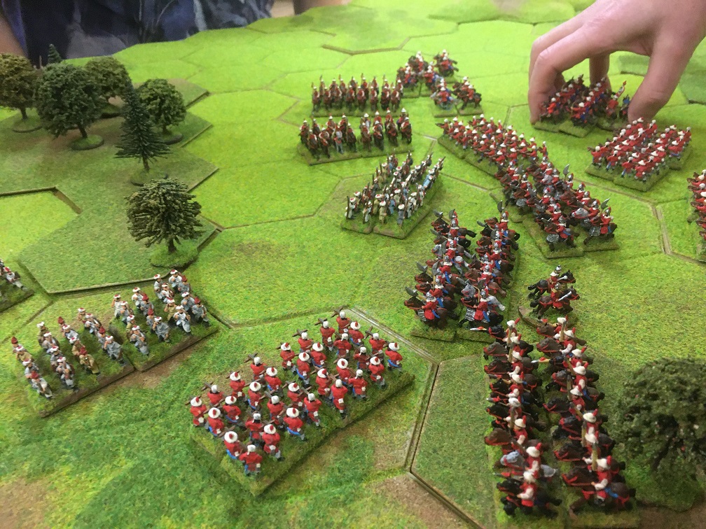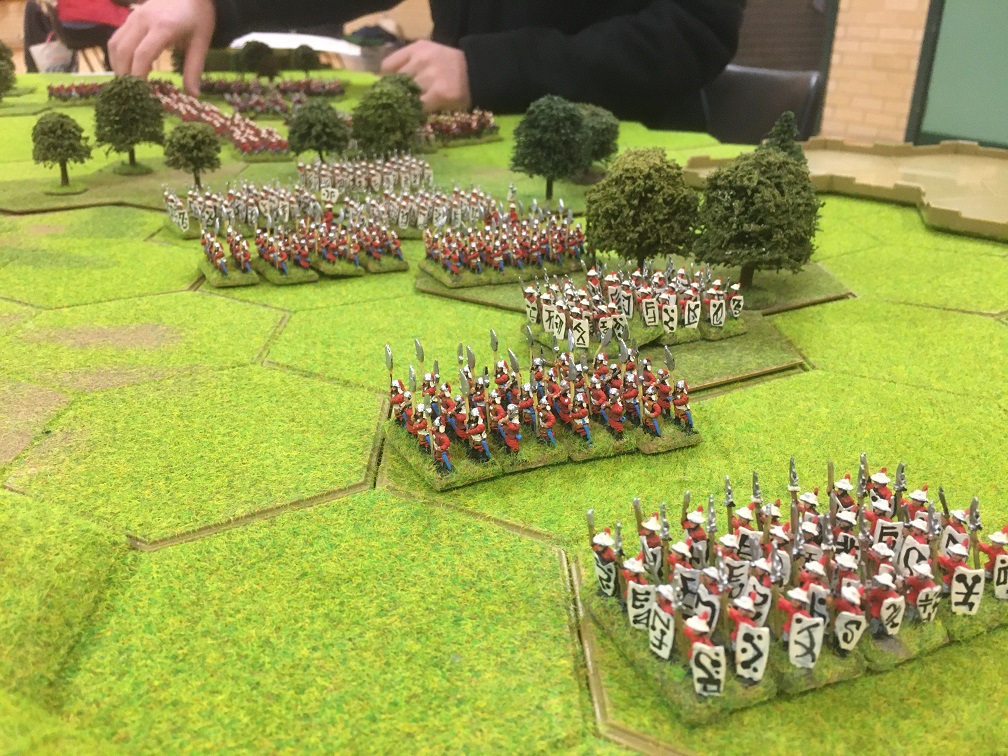 The terrain layout was already set before I arrived slightly late at the club and consisted of open ground punctuated by a large number of multi-hex areas of woodland. The most tactically significant of which was a spine of woodland 2 or 3 hexes wide which stretched almost from one table edge to the other with only a 2 hex wide area of open ground in the middle. The deployment zones of both armies were effectively divided in two which would hinder the ability of the wings of both opposing armies to support each other.