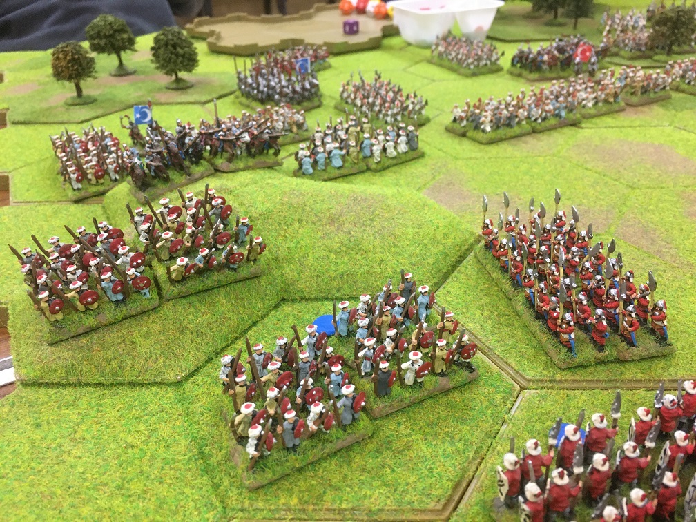 Within a couple of rounds of combat it became obvious that my Chinese infantry were struggling on our left through lack of missile troops, whilst on the right Tony’s Ottoman cavalry were trying to hold against too many Chinese missile troops. The manoeuvrability of the Ottoman cavalry was restricted by the woodland but it would take time to pin them down. In the meantime, my attempts to engage Tim’s infantry head-on in hand-to-hand combat was constantly frustrated by the Azab bowmen. My infantry losses soon mounted and Tim effectively blocked the open hexes separating my infantry from Chris’s Chinese cavalry.
