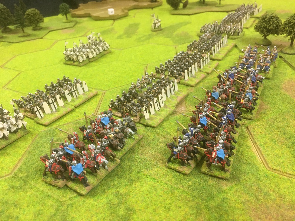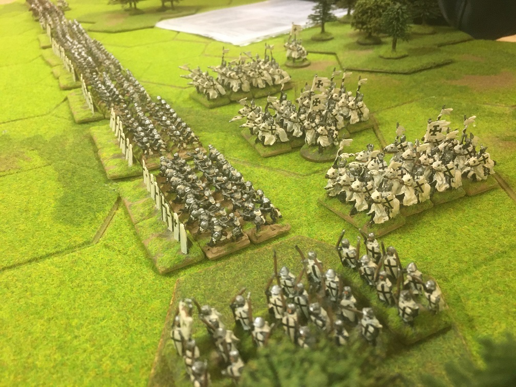 The epic cavalry engagement went in favour of the Hungarians, really because the good shooting of the stubborn Hungarian infantry enabled the Hungarian cavalry to get the mass charge into the centre of the Teutonic army. And, at this point of the game the Teutonic knights where already split into 2 separate groups of heavy cavalry and therefore unable to act as one body.