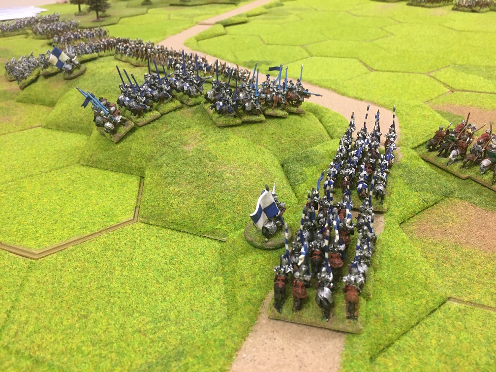 This was a classic War of The Roses encounter between 2 retinue armies of ‘B’ class professionals! The terrain was pretty open with an 8 hex hill towards the Yorkist table edge and a road to enable swift movement of units from flank to flank. Towards the Tudor table edge was a useful 4 hex wood and along one side of the open centre was a large area of woodland. The Tudor army army had 6 units of heavy cavalry and equal numbers of bill and longbow units. The Yorkist army had 4 units of heavy cavalry plus a unit of ‘D’ class hobilars, but also 2 extra units of dismounted men-at-arms which could prove very useful in the woodland areas. The longbow units of both sides had all been equipped with stakes.
